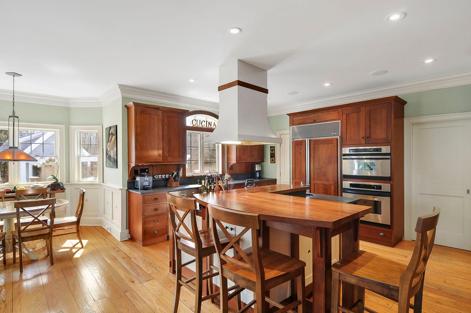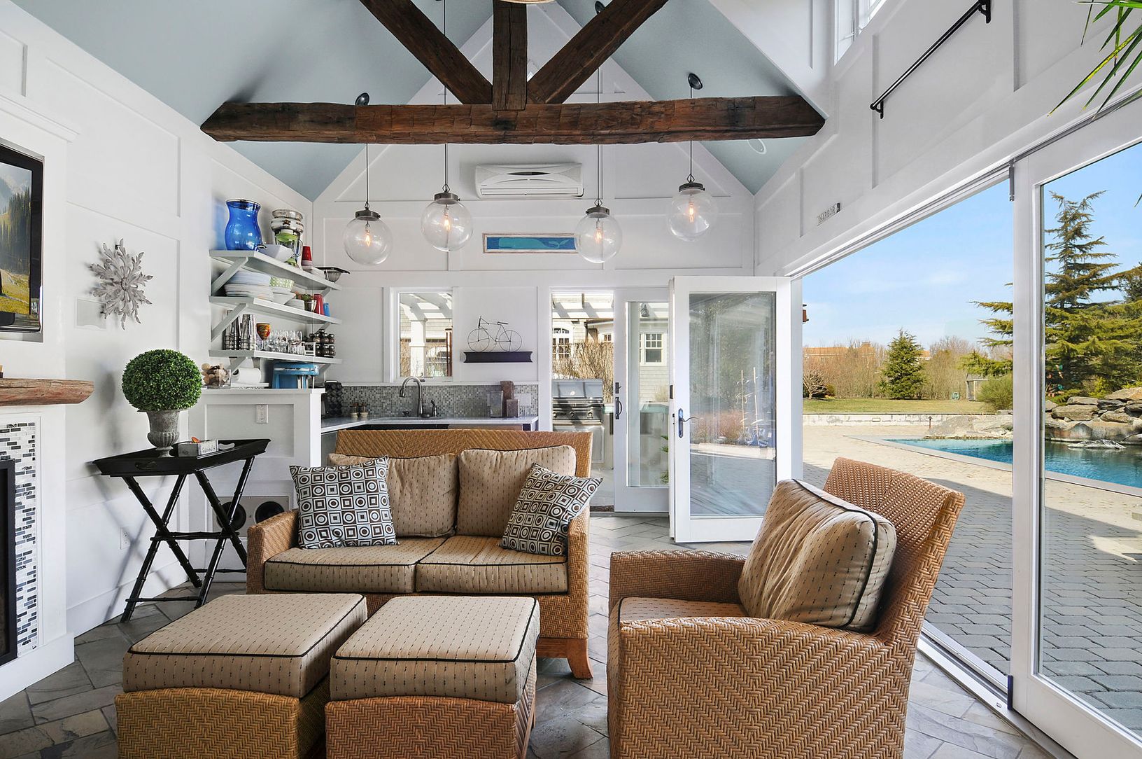 Well-appointed with classic style and modern amenities, this 4200 +/- sq.ft. shingle-sided traditional is elegant, yet relaxed and comfortable. The main floor features the master bedroom suite with direct access to the backyard, a cozy den, powder room, and formal dining room adjoining the main living room. A double sided wood burning fireplace connects to a second informal living space and eat-in chef's kitchen with Subzero and Miele applia