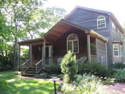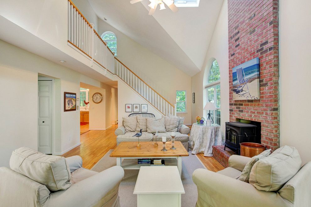 Tranquility awaits you in this freshly painted and newly decorated Post Modern home. Situated on a very secluded half acre flag lot, this light filled Saltbox offers all the amenities for the perfect Hamptons retreat. From the inviting covered front porch to the light filled great room with cathedral ceilings, huge windows and skylights - indoor/ outdoor living is the key to this house. The masonry chimney with a wood burning stove and love