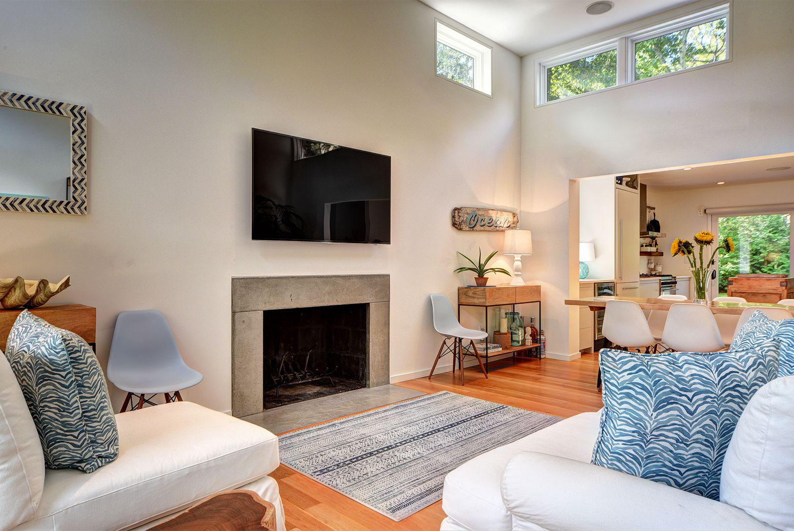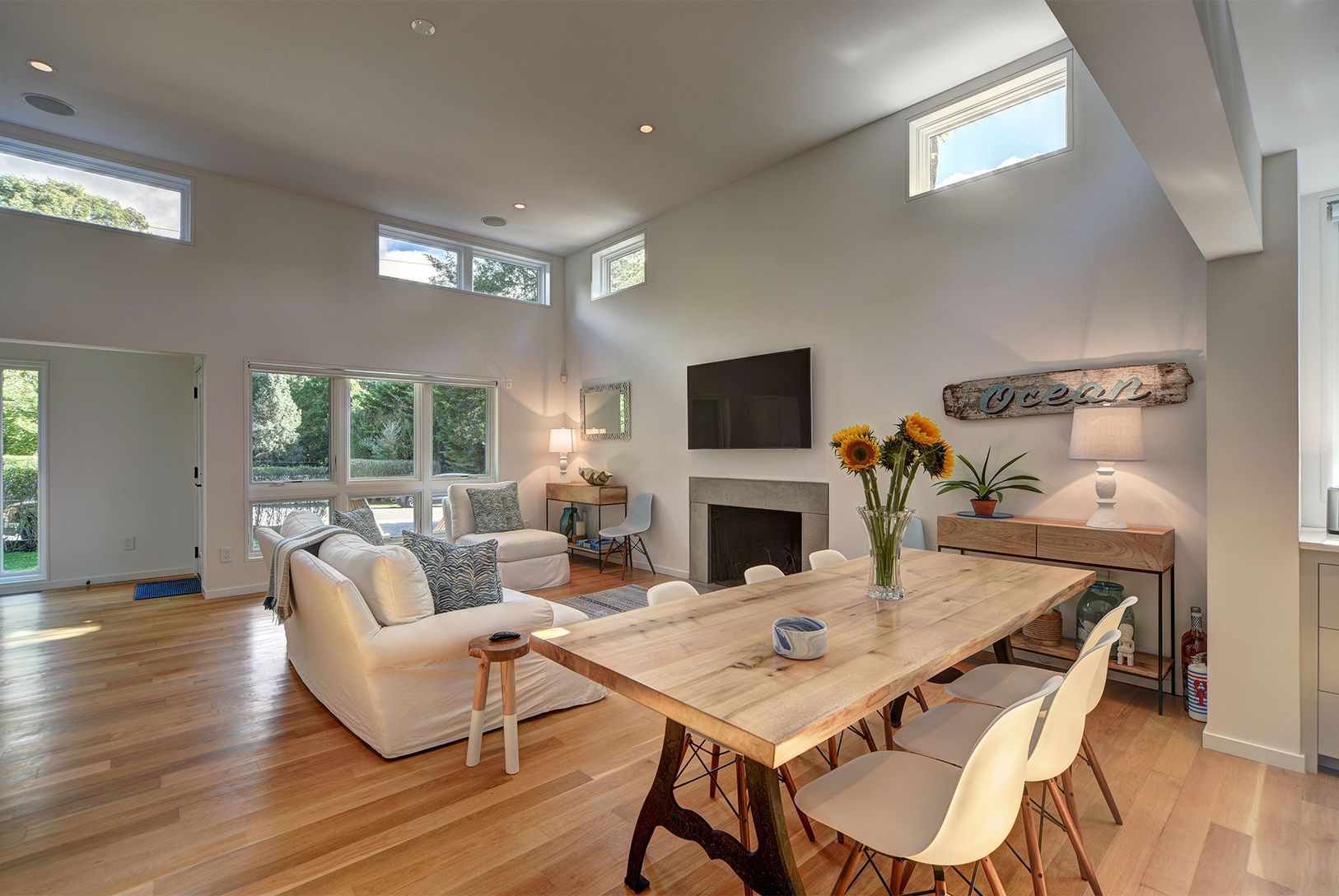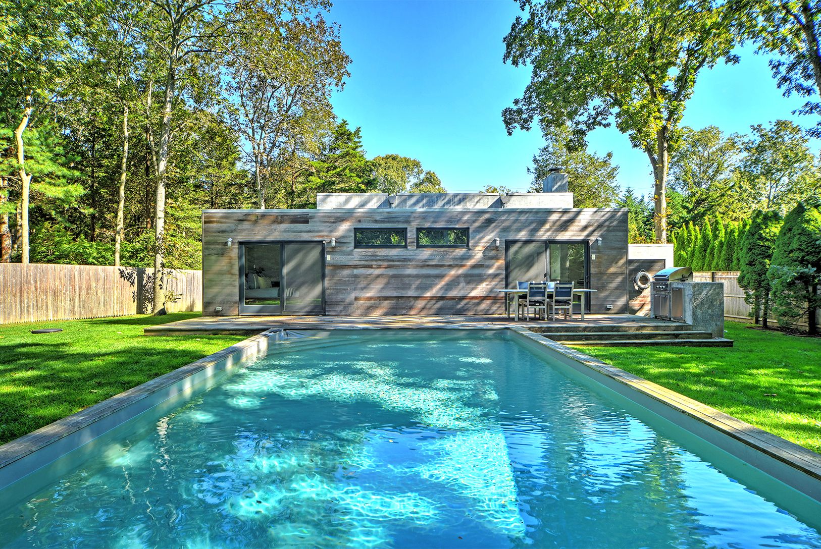 Perfectly turnkey and like-new Modern in East Hampton, just a few blocks from the beach. The home was built in 2014 and is in flawless condition. It includes three bedrooms, two baths, and 1,500+/- sf of living space over one level. High-end architecture and construction featuring a façade balancing natural stucco with gorgeous cedar elements. The open concept floor plan includes a spectacular great room, with fireplace and high ceiling, flows