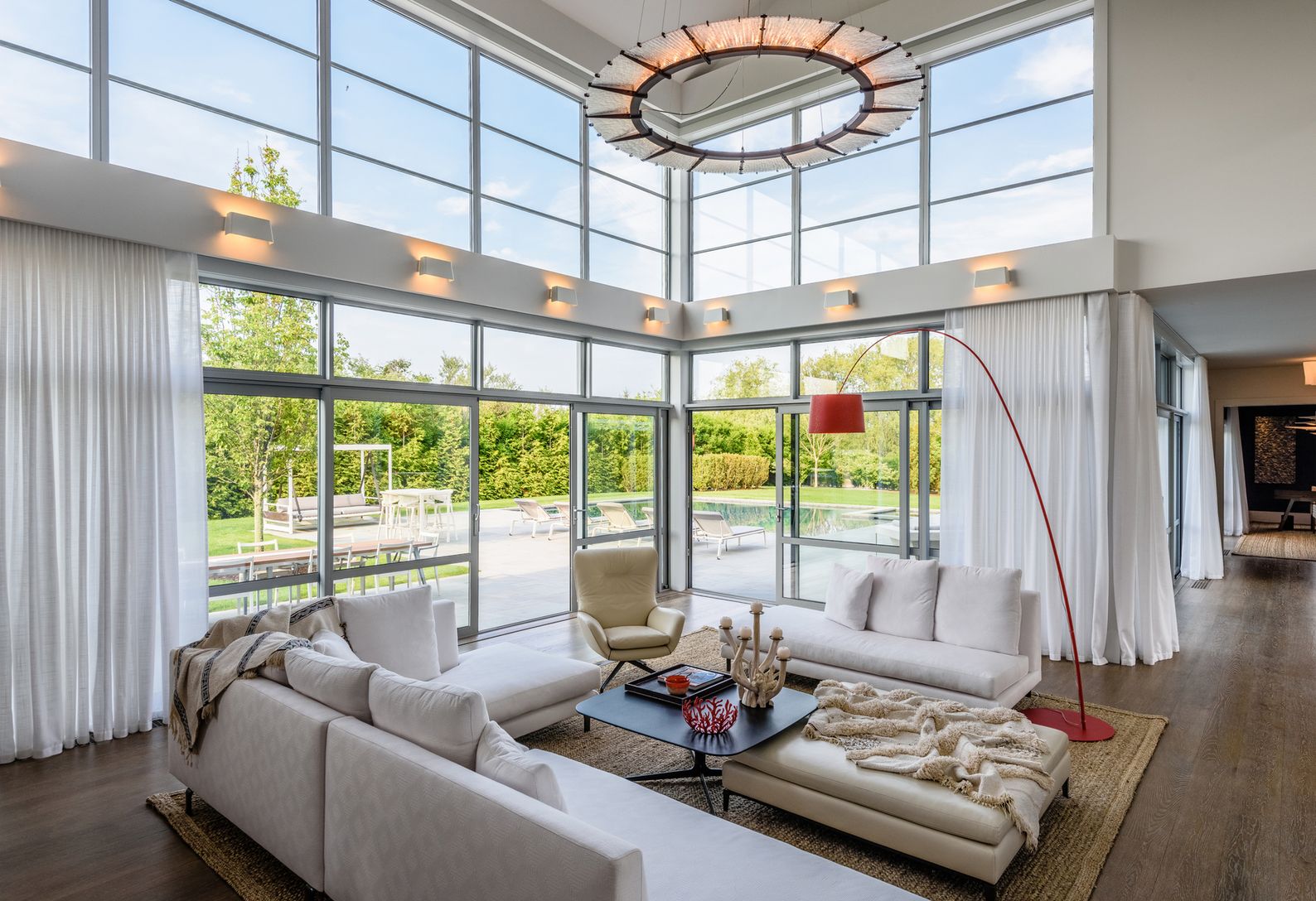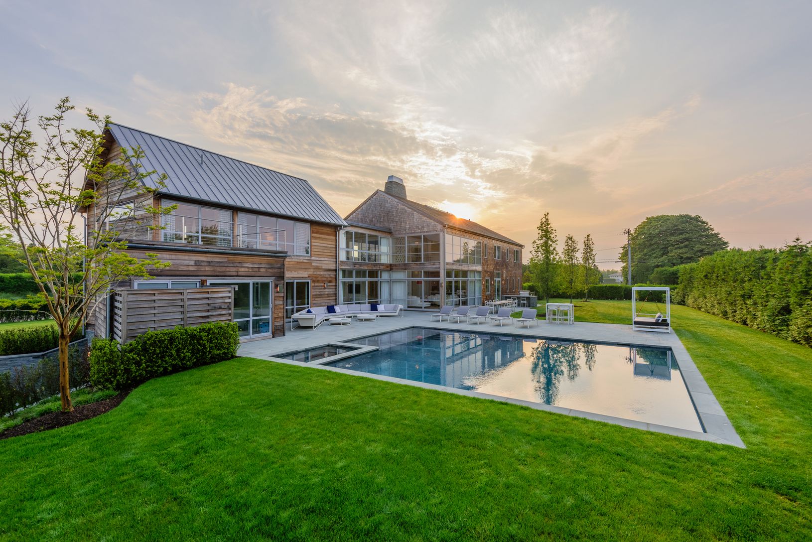 Steps from the ocean, this cutting-edge 12,000+/- sq. ft. modern barn-style home constructed to the highest standards features an elegant façade with glass entrance opening to an expanse of space and light. The vaulted ceilings and massive windows create airy living spaces that flow into landscape. A spectacular great room features walls of windows leading to a slate patio and a spectacular heated gunite pool/spa and pool house. The gourmet ki