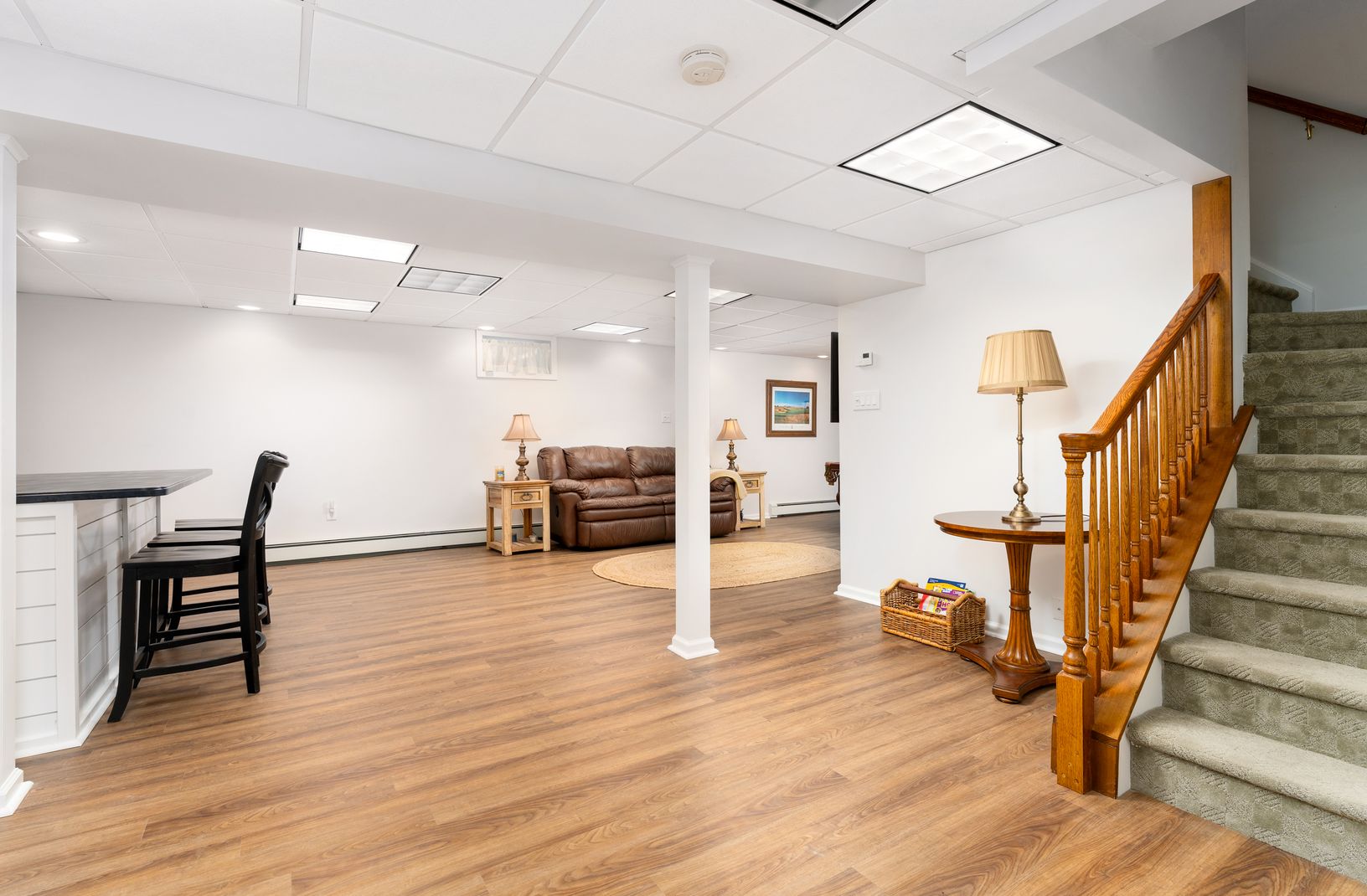 Recently renovated throughout, the home features an open and airy floor plan with vaulted ceilings and a chef’s kitchen outfitted with premium stainless steel appliances. The newly designed great room centers around a resurfaced fireplace, framed