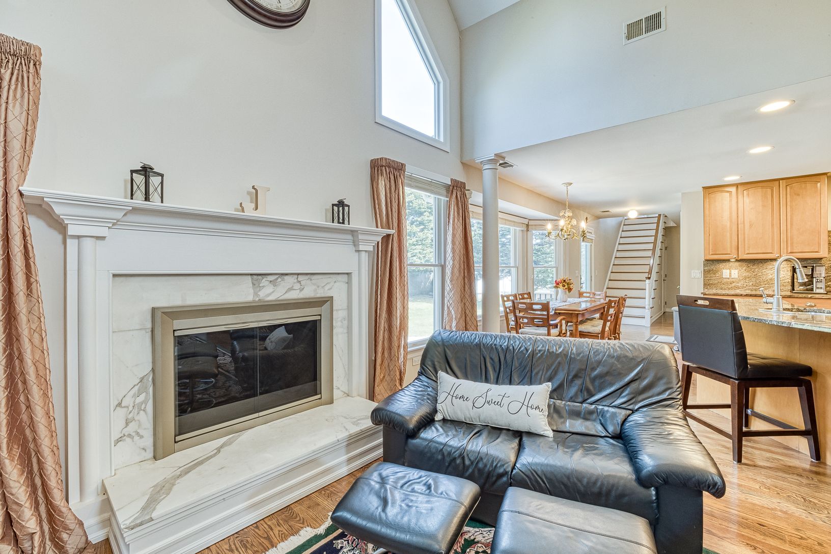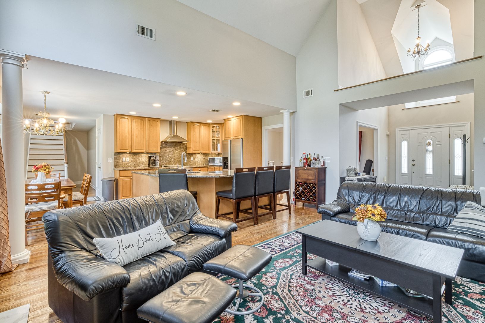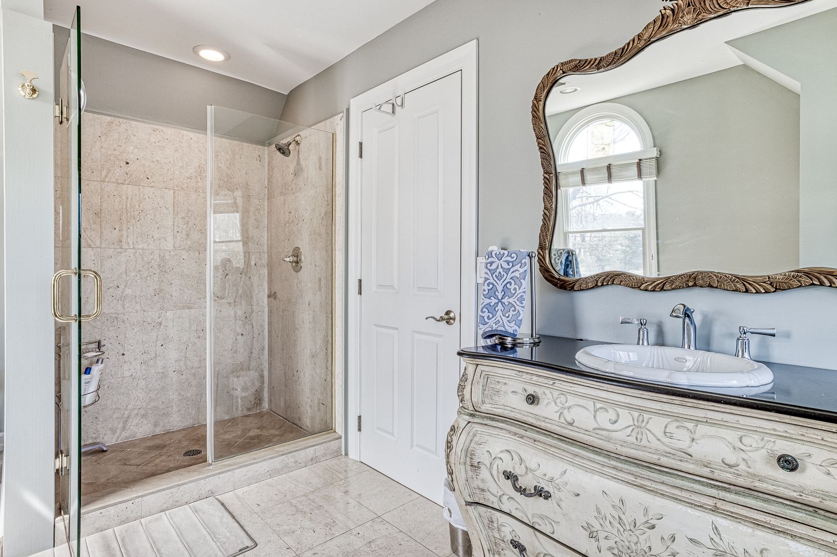 Mattituck, North Fork - Move in ready expanded ranch in like-new condition with rocking-chair front porch features living room with vaulted ceiling and fireplace, Eat in Kitchen w/granite counters and SS appliances; Formal dinning room (could be den/home office), 2 bedrooms and full bath. Upstairs primary bedroom w/full bath and walk-in closet. Full basement. Laundry/mud room and powder - plus 2 car garage. Member Mattituck Park District and m