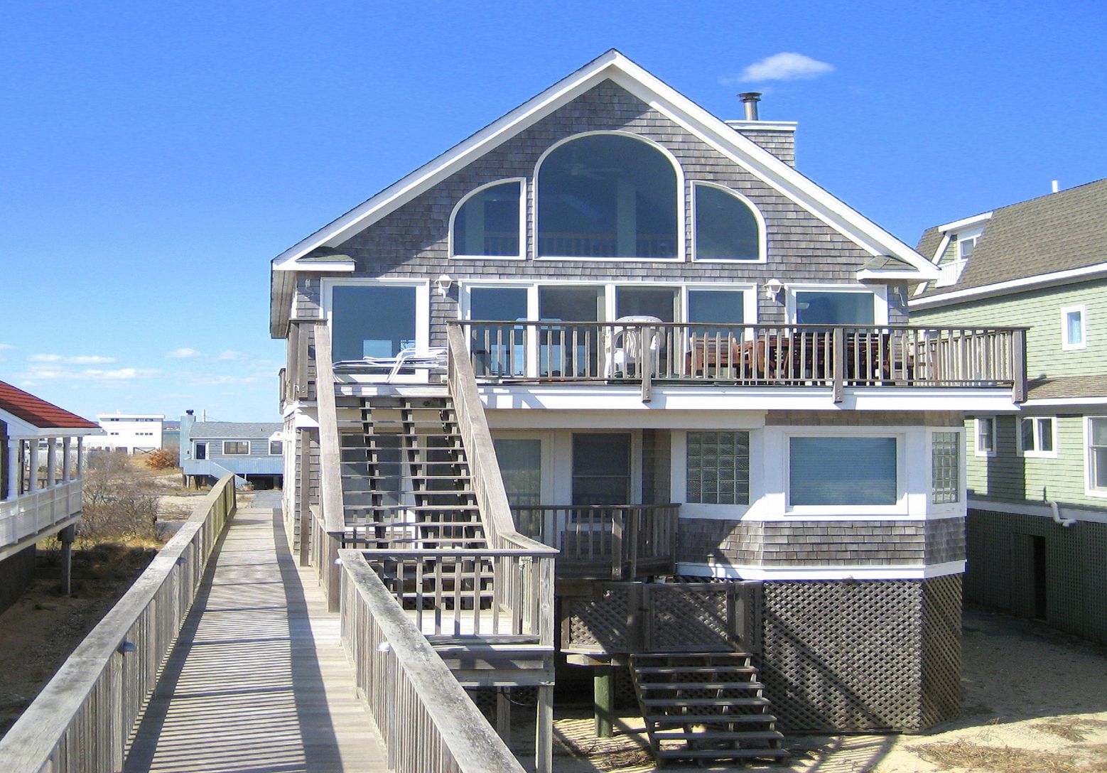 The quintessential beach house. A perfect weekend or year round get-away with spectacular ocean and bay views. The large master suite has jacuzzi and marble shower. There are also 3 additional bedrooms and bath on the first level with a dumbwaiter to second floor for packages and groceries . Open and airy with wood floors throughout, gourmet kitchen with steel appliances, central vac and great room with fireplace, make for a comfortable and e