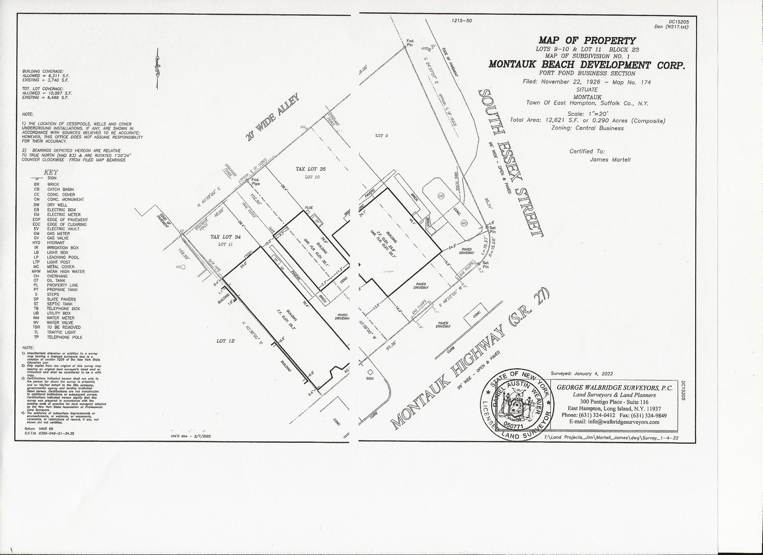 This remarkable commercial property, zoned "CB," is located in the heart of Montauk and presents an extraordinary opportunity for development. Comprising two adjacent lots with a substantial footprint, this offering is perfect for a diverse range of lucrative ventures, including banks, vibrant restaurants, bustling pharmacies, and spacious supermarkets.