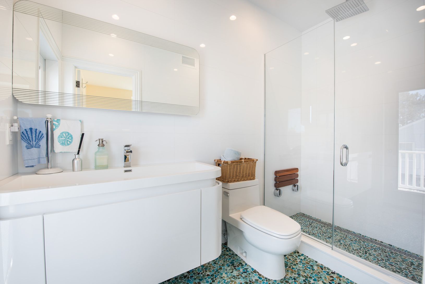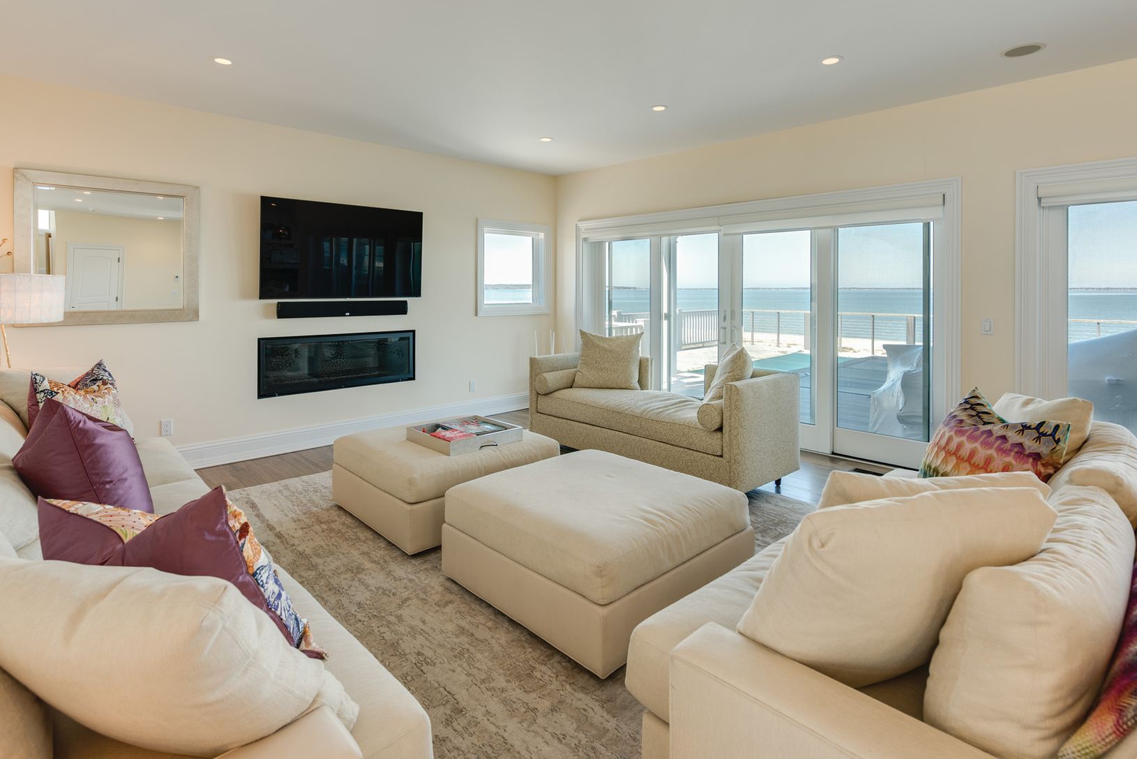 Enjoy a delightful summer sojourn in Southampton in this recently constructed and impeccably maintained, beachy chic waterfront colonial on Peconic Bay. Spacious, light-filled first floor principal rooms have glass doors to decks on two sides and flow among the comfortable living area with media, and high-end eat-in kitchen with island seating and water-view dining area. Multiple glass doors open to a bayfront deck with barbecue, outdoor dini