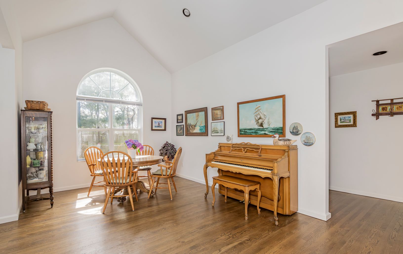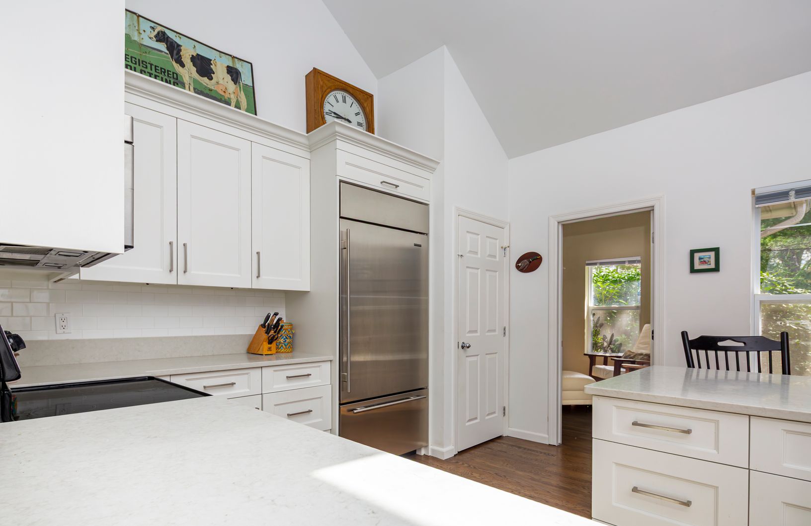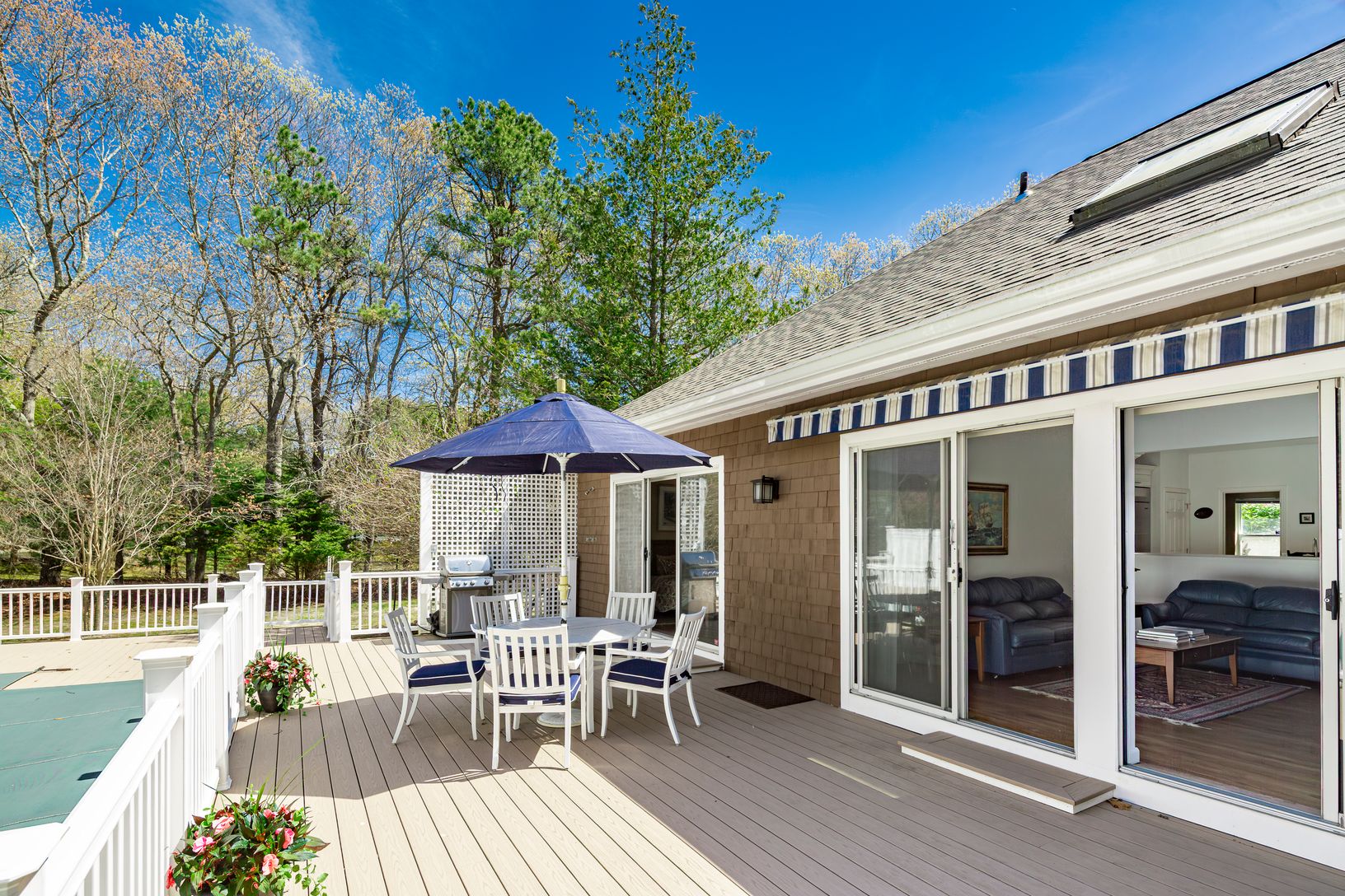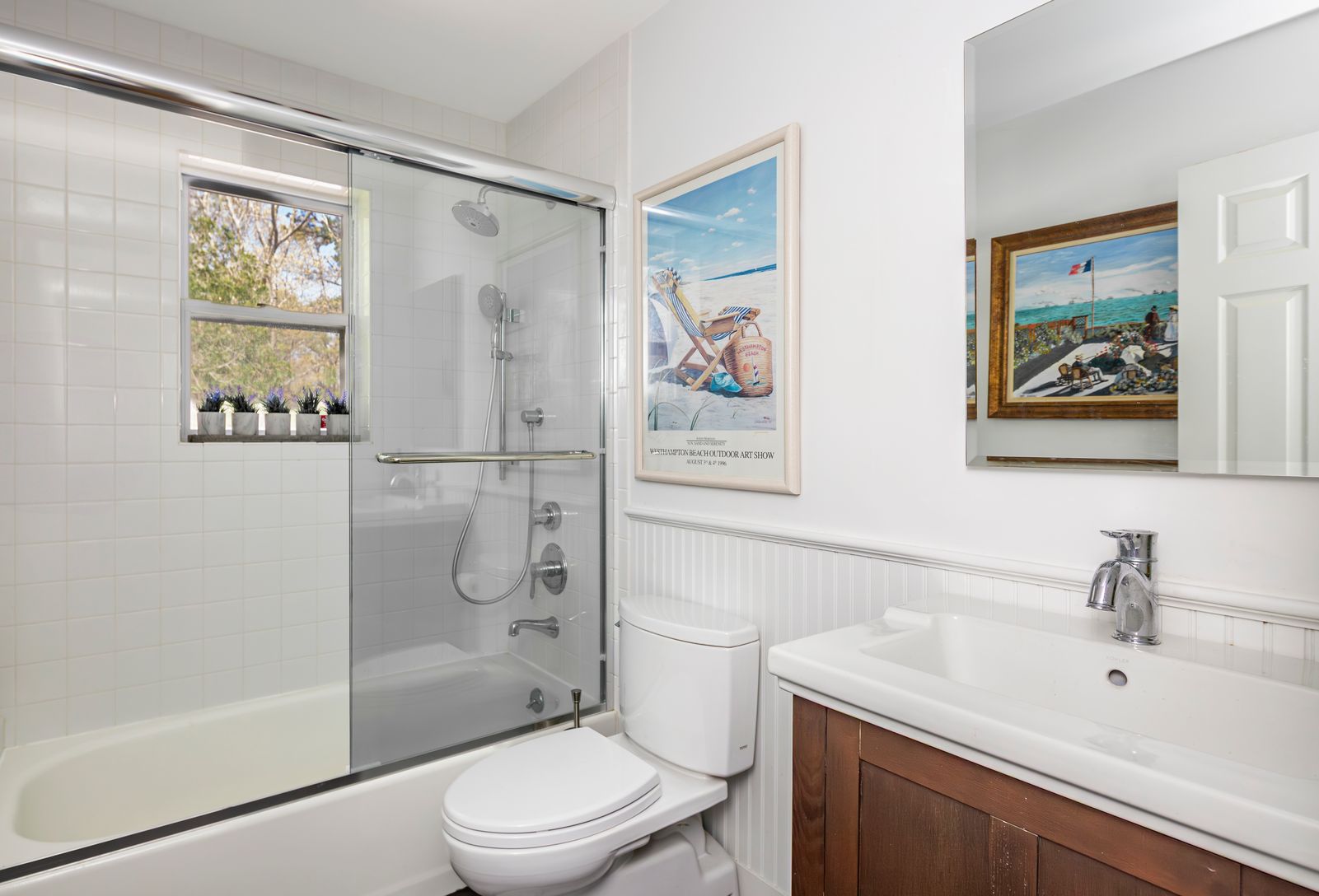 Nestled off the road behind a natural screen, this timeless cedar-shingled ranch is ready for your summer enjoyment. Thoughtfully renovated over the years, it offers a seamless blend of classic charm and modern comfort - just add your personal touch with paint, furniture, and décor. Step inside to an airy open-concept living space with soaring 15-foot ceilings, gleaming hardwood floors, and a wood burning fireplace. The bright, beautifully upd