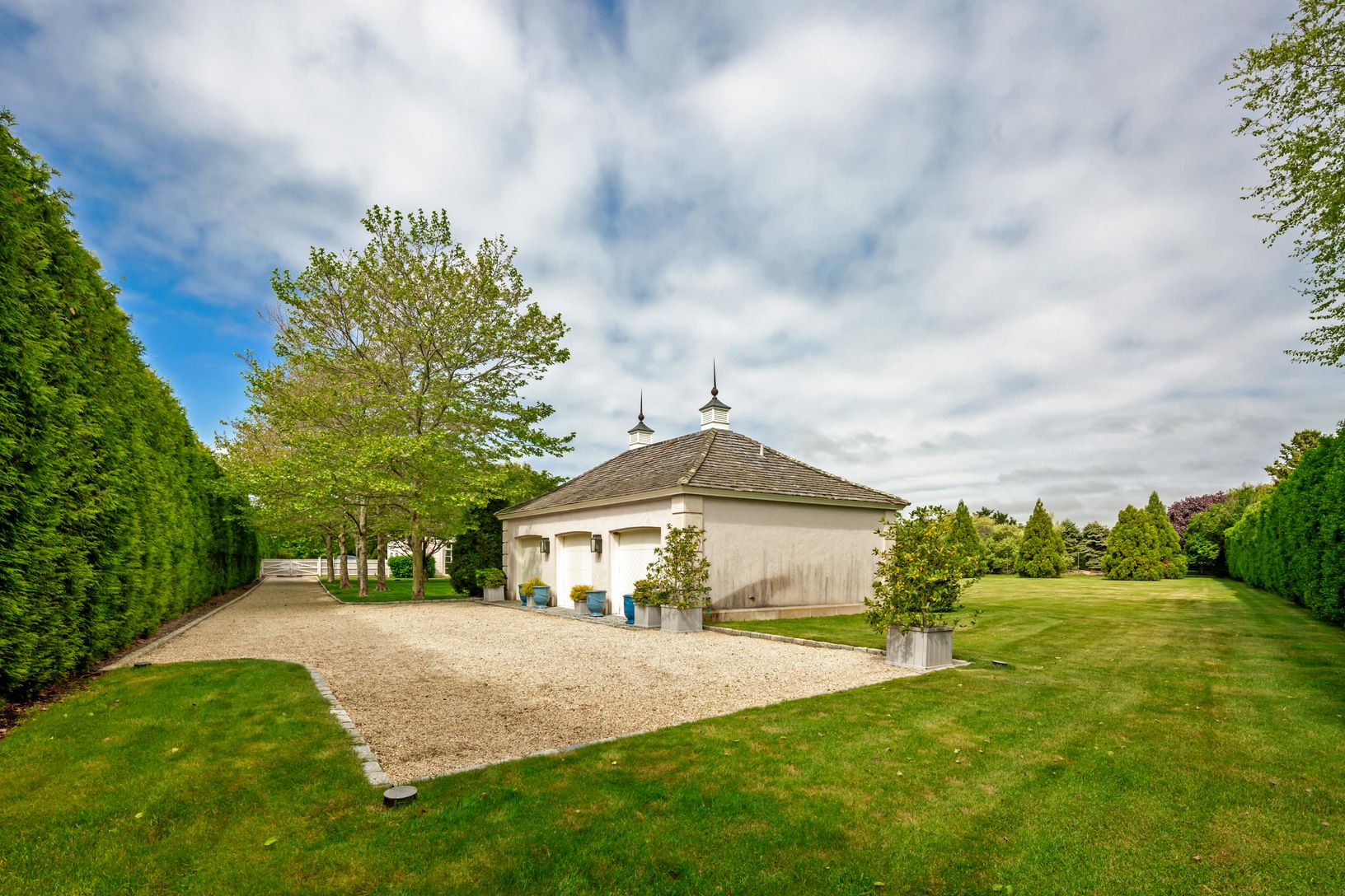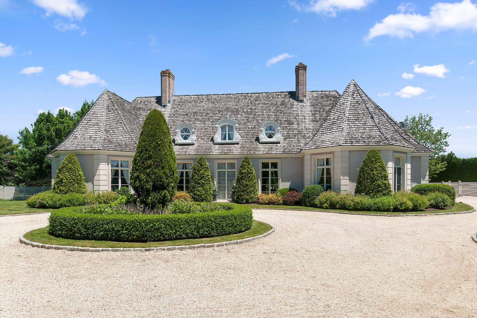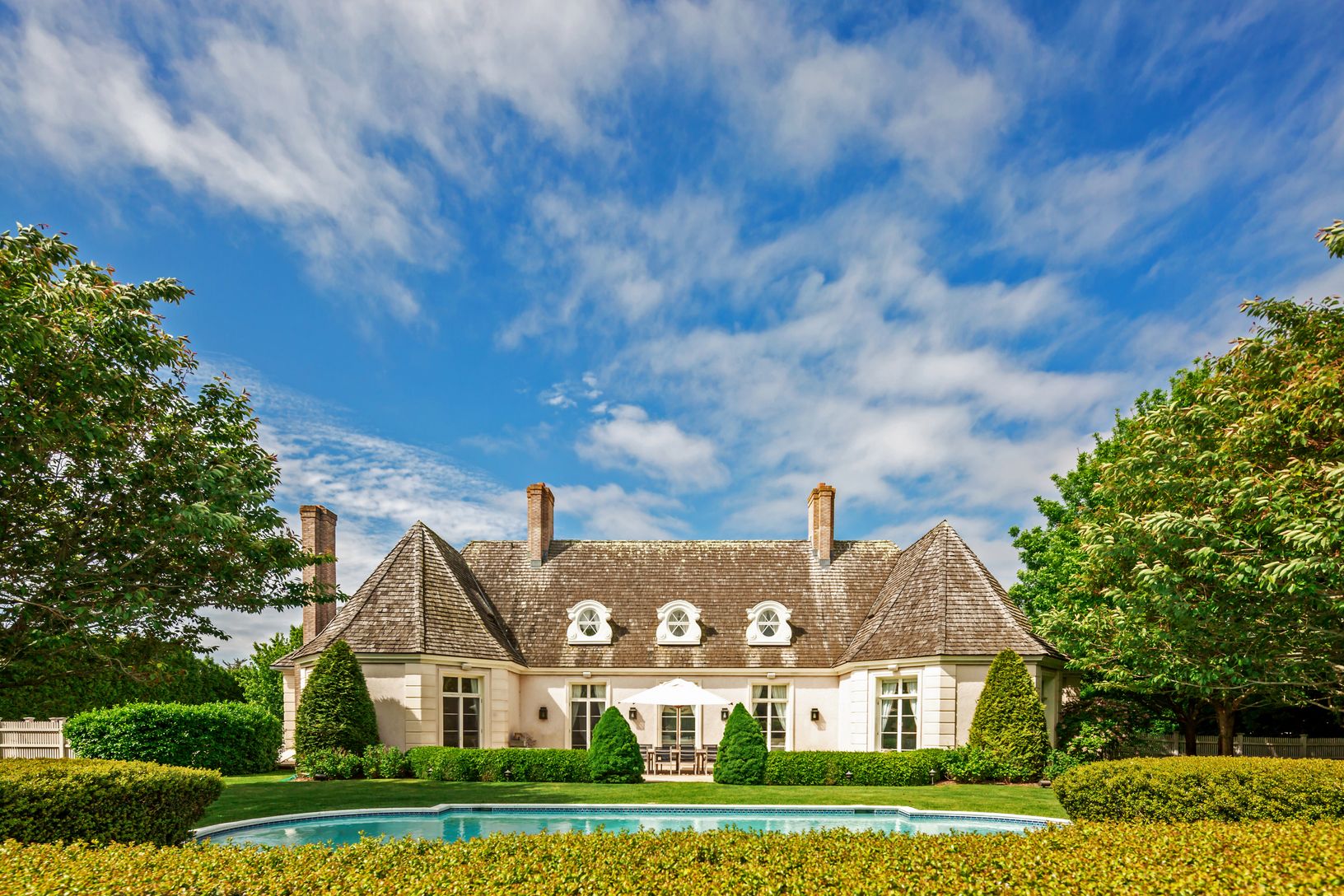 Just over a half mile to the Atlantic Ocean off one of Bridgehampton South's most desirable streets, this six-bedroom, 6,000 square foot mansard style home features a heated, gunite, salt water pool, detached 3-car garage, and room for tennis on a manicured and gated 1.4 acres. Charming dormers with oeil-de-boeuf “bull’s eye” windows, decorative quoins, and gorgeous cremone bolt doors evoke a French country estate. Soaring ceilings and walls o