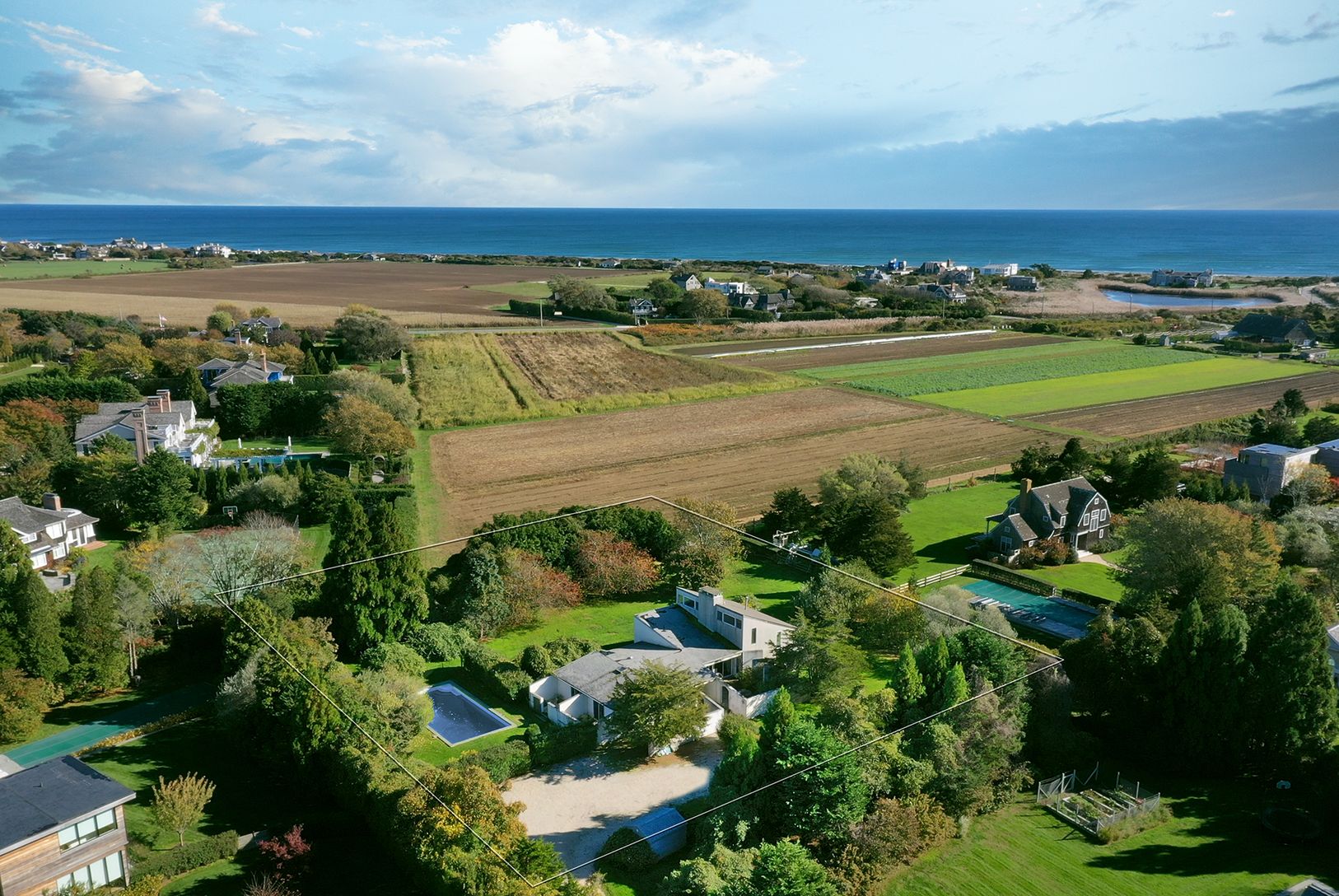 Sagaponack South flag lot for sale, adjacent and overlooking acres of picturesque farmland and approximately one mile from Sagg Main Ocean Beach.