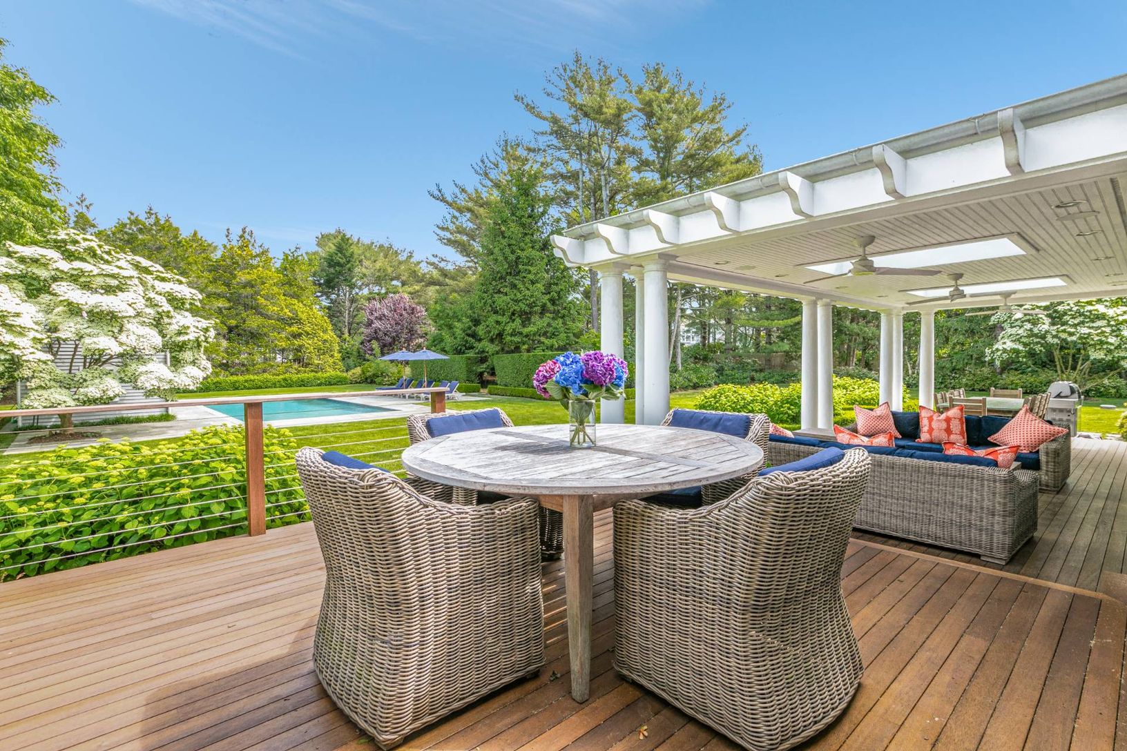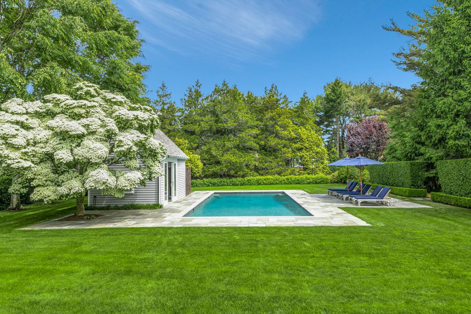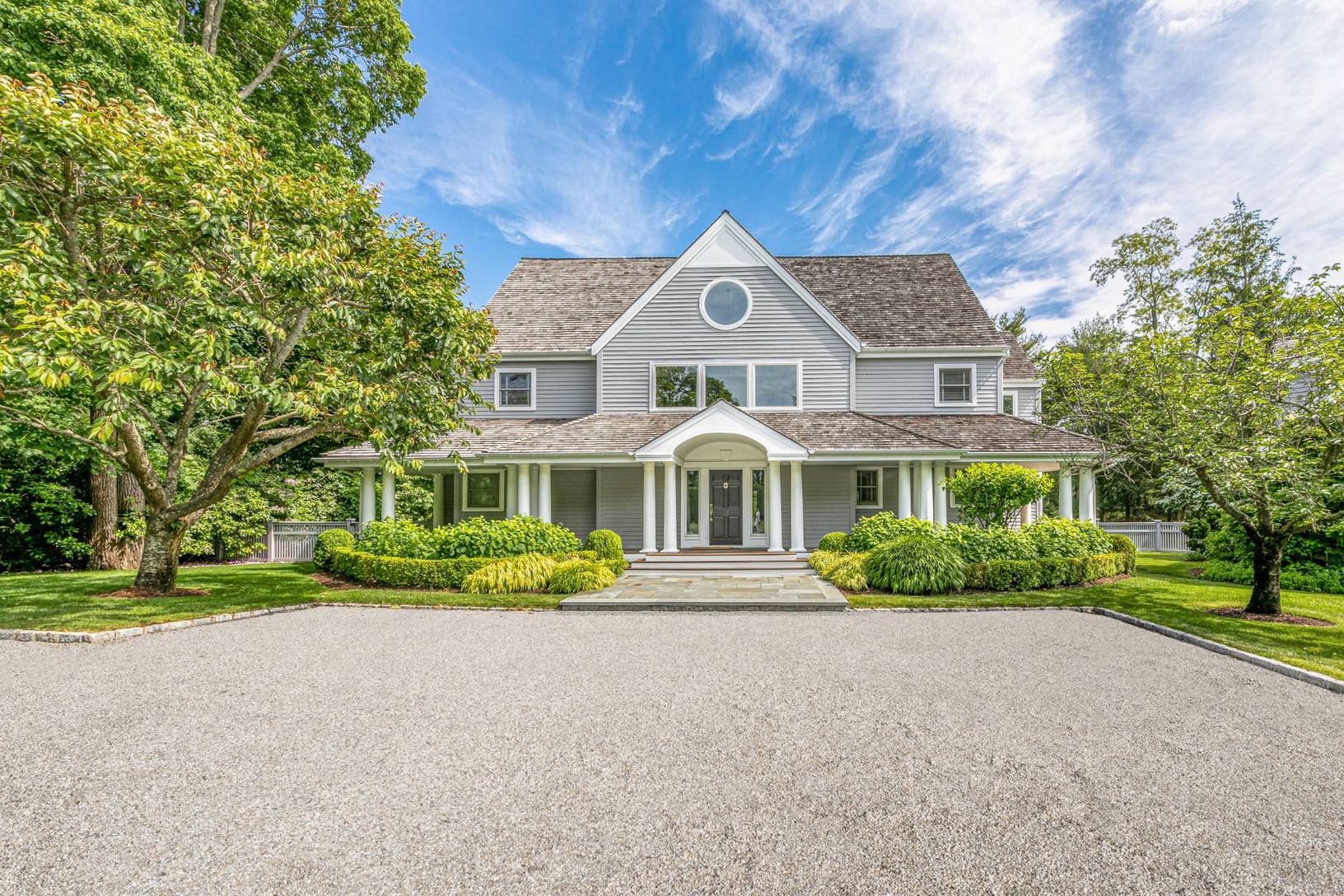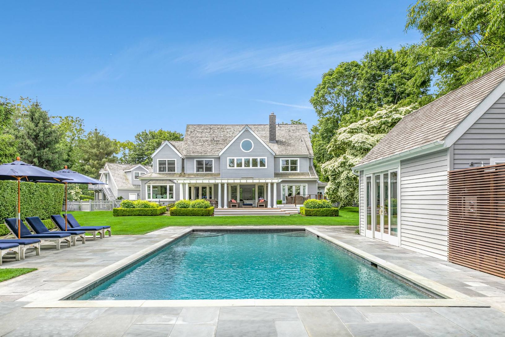 Traditional 2-story home in Water Mill, sited on 1.2+/- acres, exemplifies the Hamptons' lifestyle. This well-appointed 4,000+/- sq. ft. home has 4 bedrooms, 3.5 baths, a beautiful pool house, and a separate 2-car garage.. The sunny welcoming foyer opens to a great room with double-height ceilings and fireplace with hearth that is perfect for year-round entertaining. An eat-in chef's kitchen has high-end appliances, granite countertops, and ma
