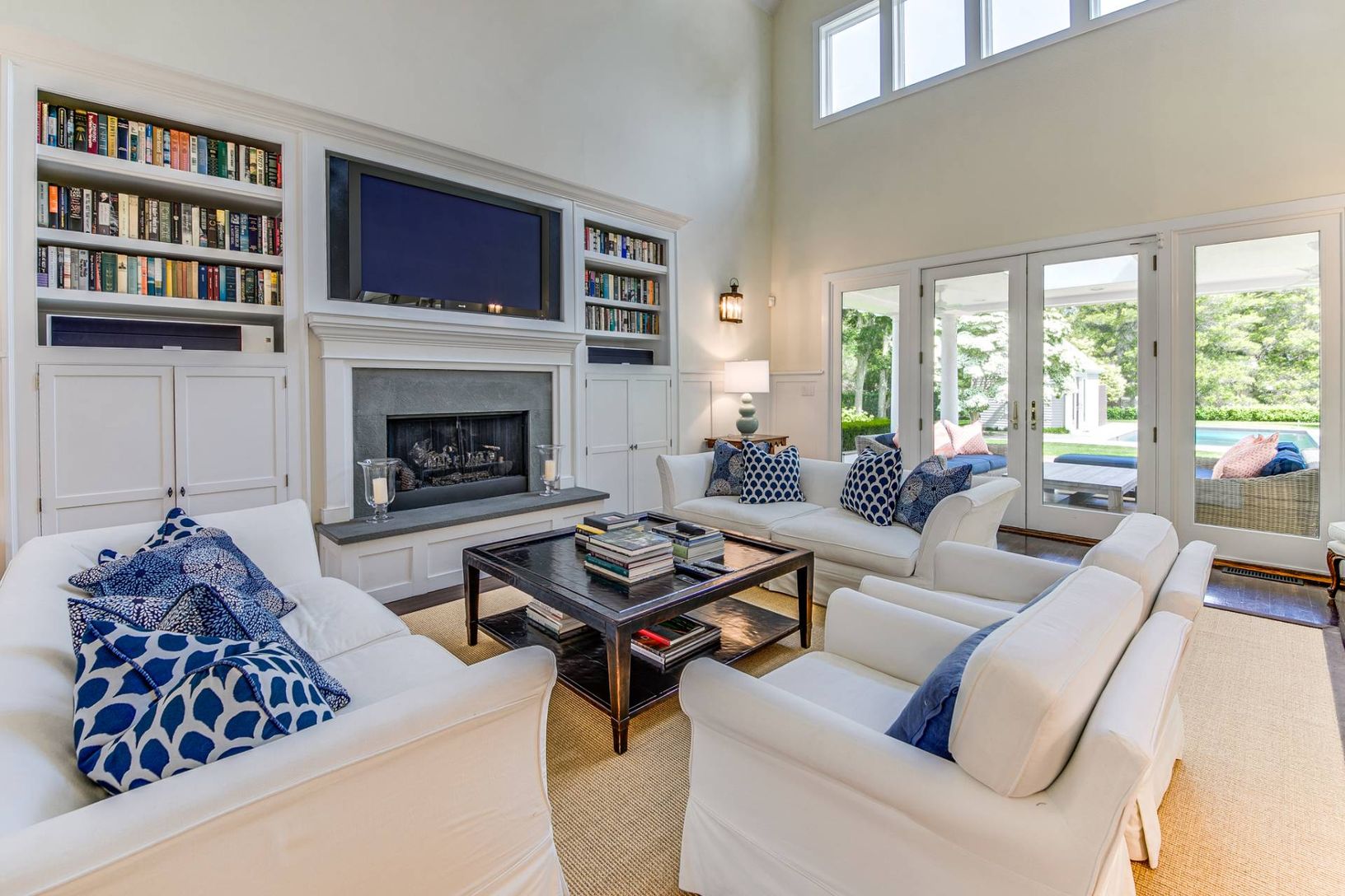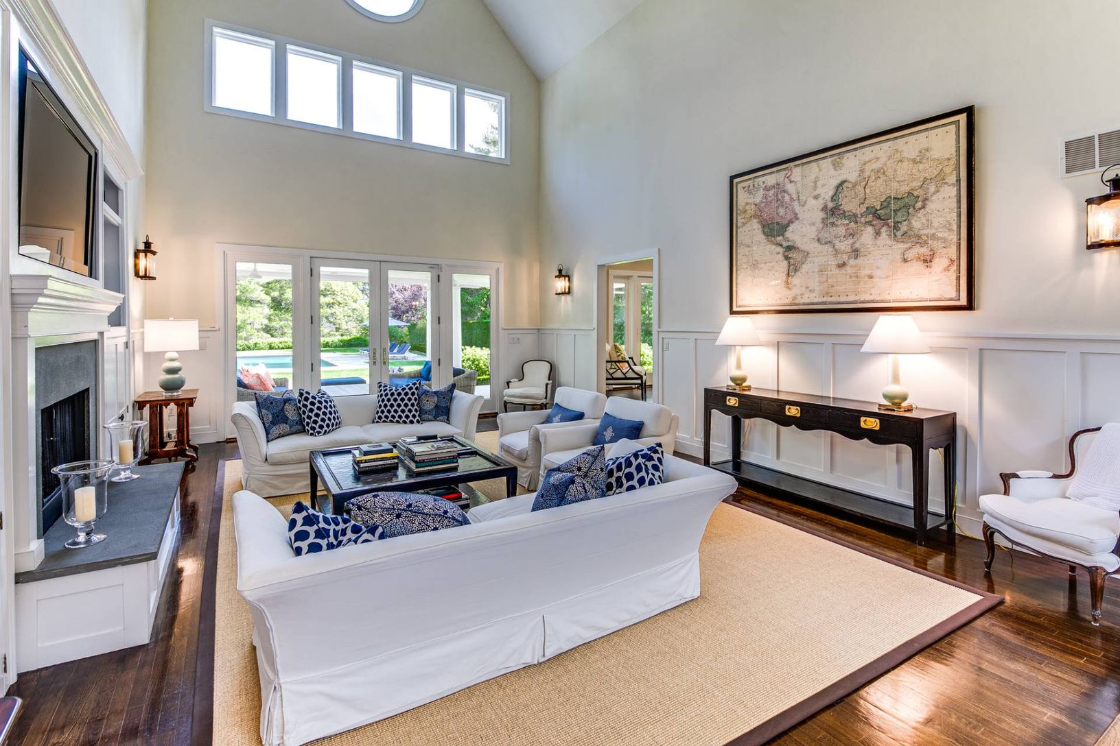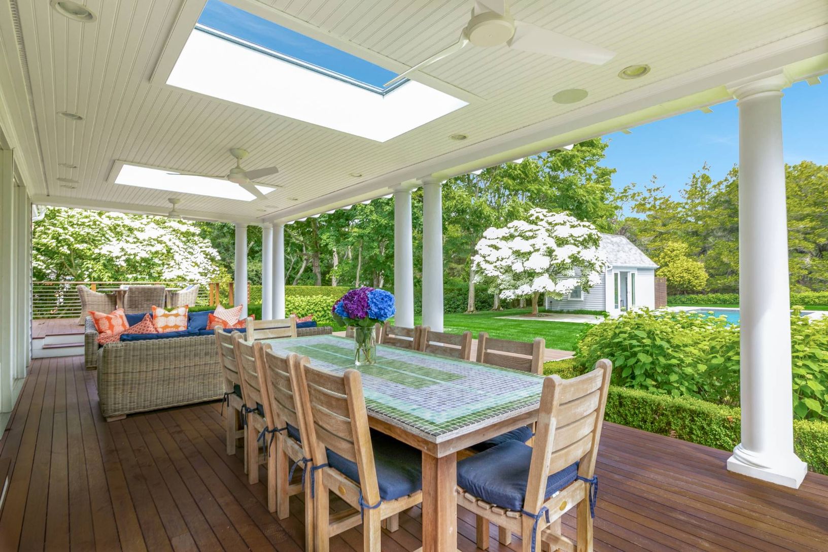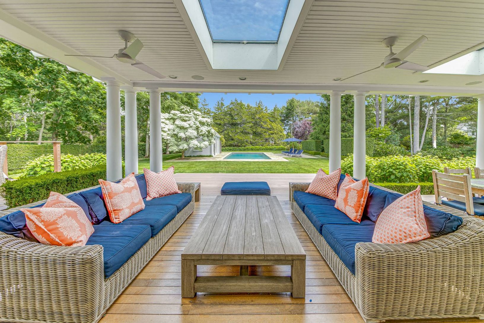 Traditional 2-story home in Water Mill, sited on 1.2+/- acres, exemplifies the Hamptons' lifestyle. This well-appointed 4,000+/- sq. ft. home has 4 bedrooms, 3.5 baths, a beautiful pool house, and a separate 2-car garage.. The sunny welcoming foyer opens to a great room with double-height ceilings and fireplace with hearth that is perfect for year-round entertaining. An eat-in chef's kitchen has high-end appliances, granite countertops, and ma