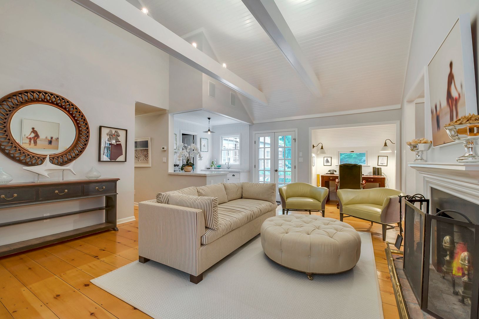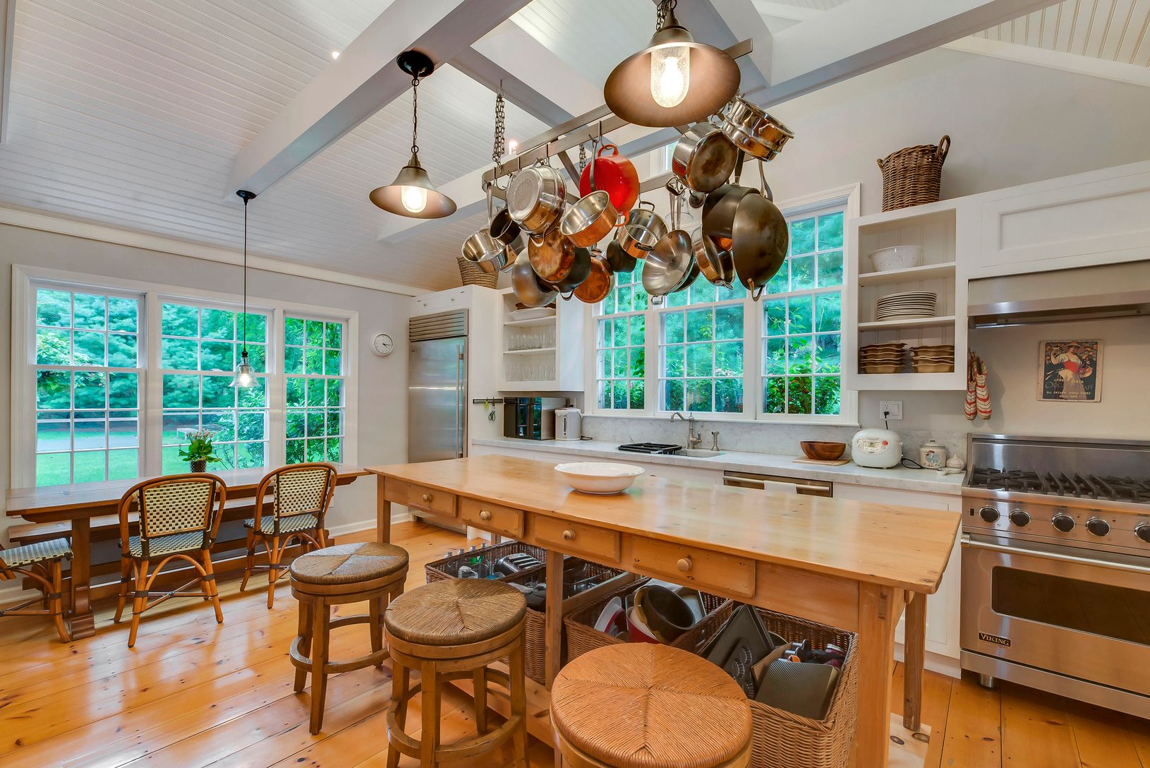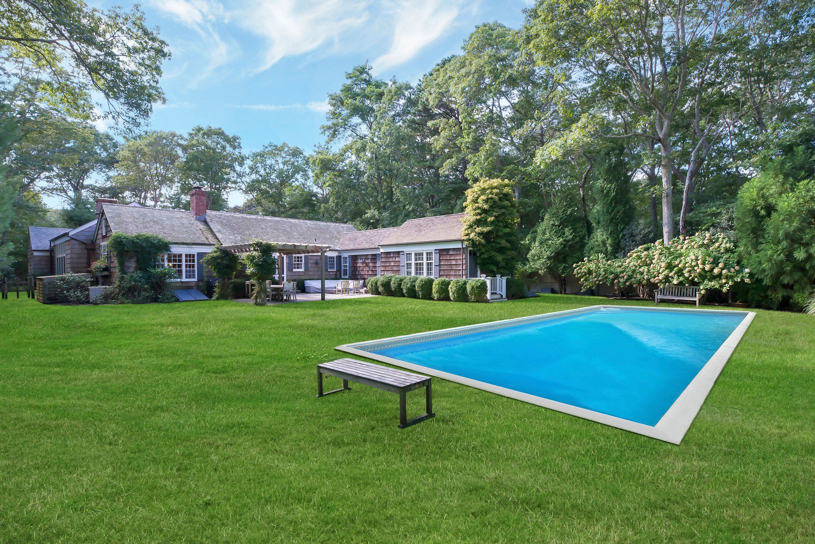 Perfectly situated on a half-acre south of the highway, in the coveted Hamlet of Wainscott-this spacious, rambling cedar shingled home showcases luxurious architectural details with just a touch of modernity. Expertly renovated in 2016 with a barn-style addition, this 3bd 3.5ba, 3250sqft gem features wide plank pine floors and shiplap cathedral ceilings with exposed beams throughout, honed marble in the kitchen, laundry and baths, plus perfect