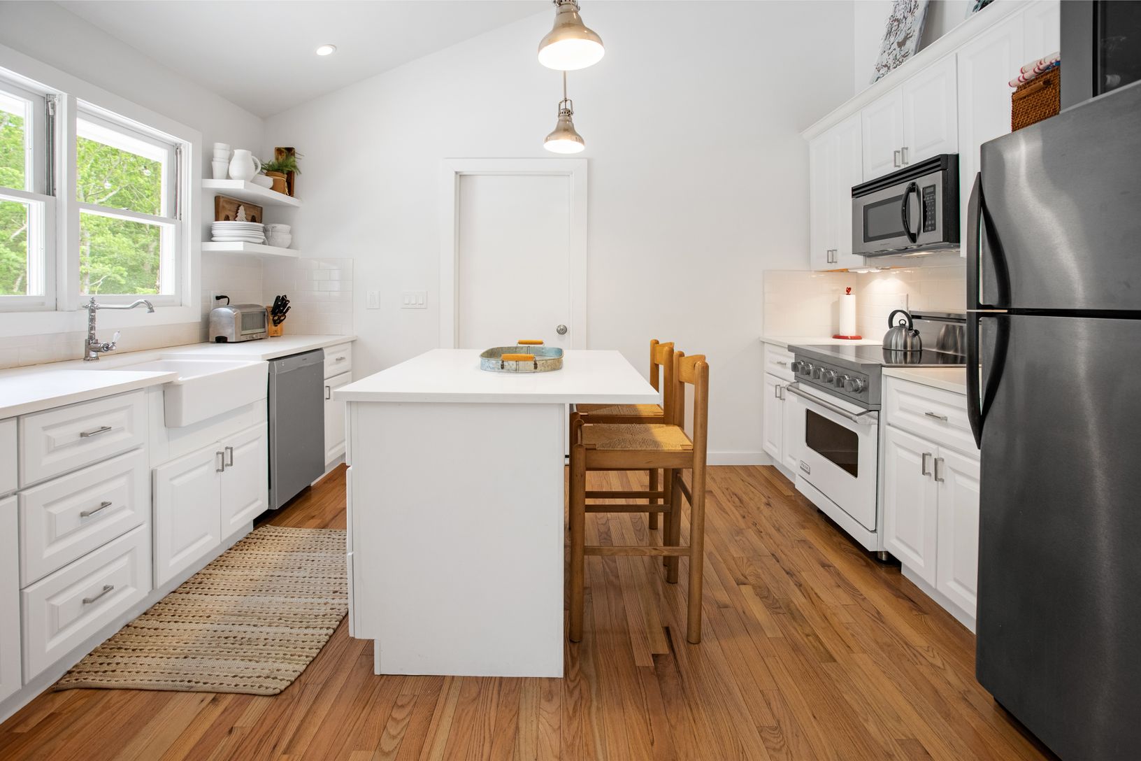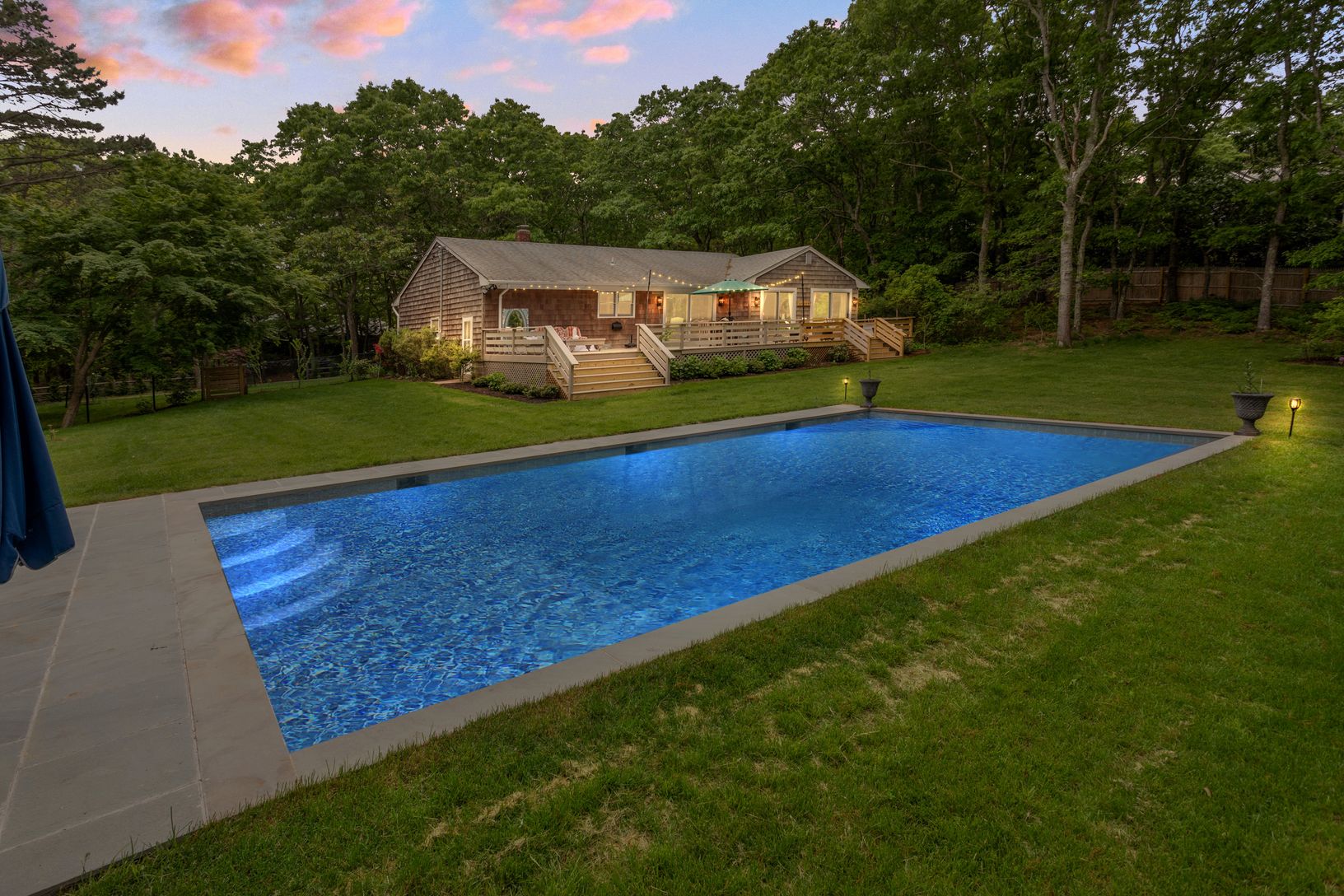 Water Mill romantic beach cottage in secluded, private location at the end of a private road, nestled among multi-million dollar properties on Edge of Woods Road. Renovated kitchen and baths; large wrap around deck overlooking 40 by 20 foot gunite pool and blue stone pool patio. Excellent location and impecable furnishings make this property an idilic summer rental. Completely fenced-in back yard is ideal for families with pets. Available for