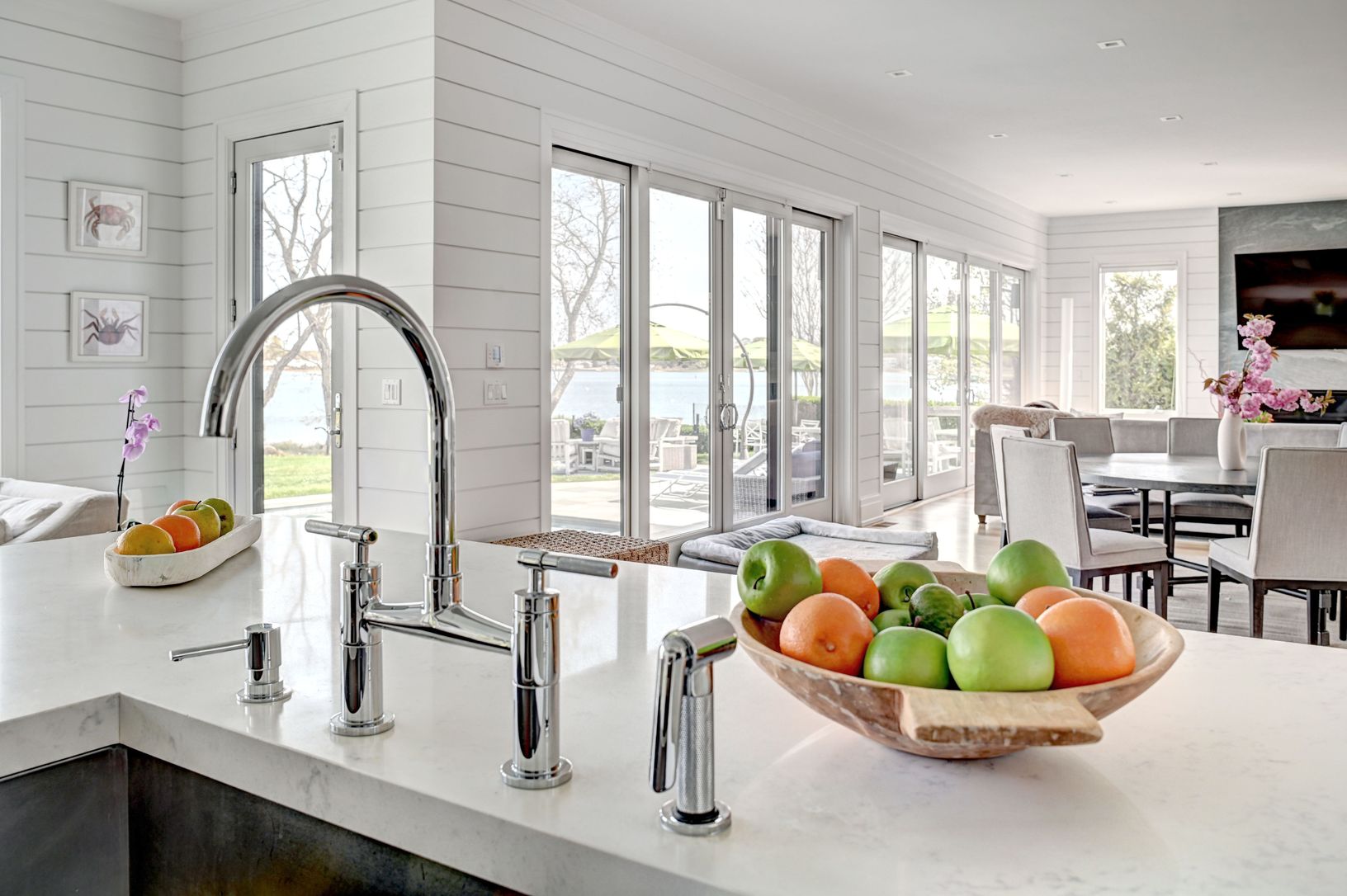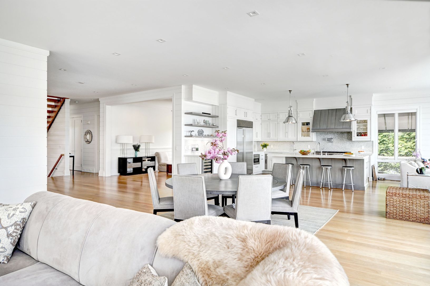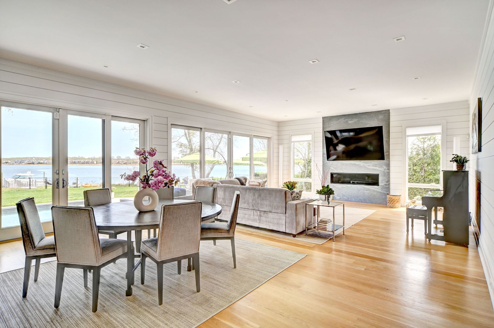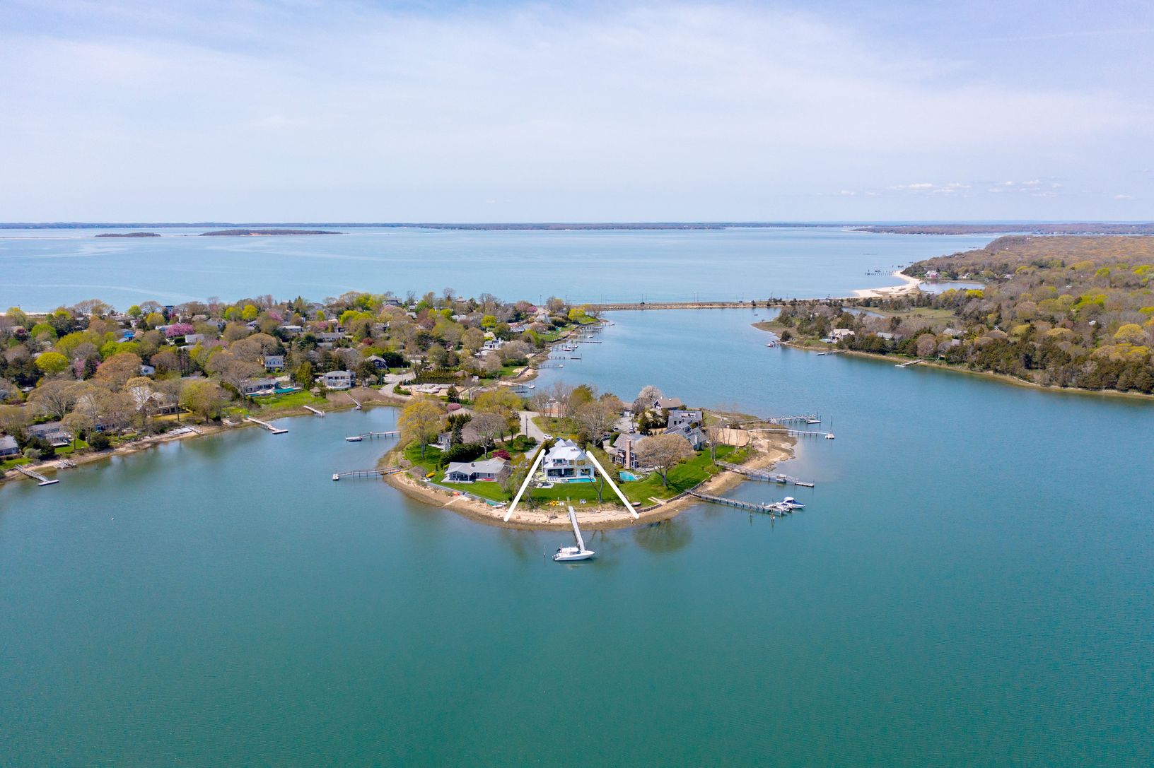 Set on a manicured 0.60+/- acre waterfront parcel on a secluded Bay Point peninsula with dramatic water views of Sag Harbor Village, this recently built and immaculately maintained, 6 bedroom, white shingle traditional, with a stylish, standing seam metal roof, offers a 115+/- foot deep water dock, waterside heated, gunite, salt water pool and spa, finished lower level, and an attached garage. Designed to maximize water views, the home opens o