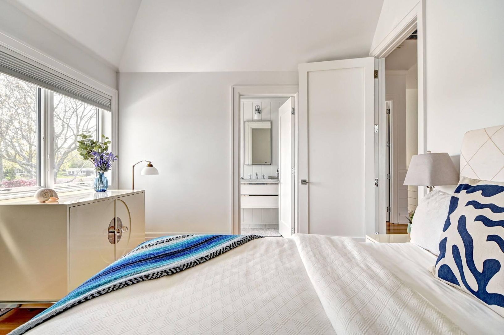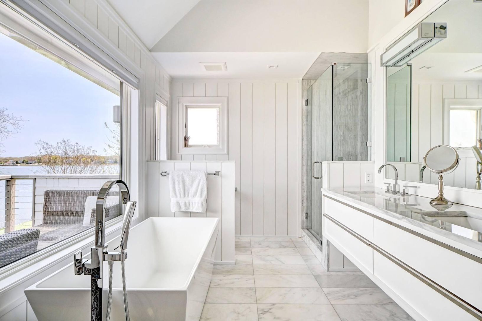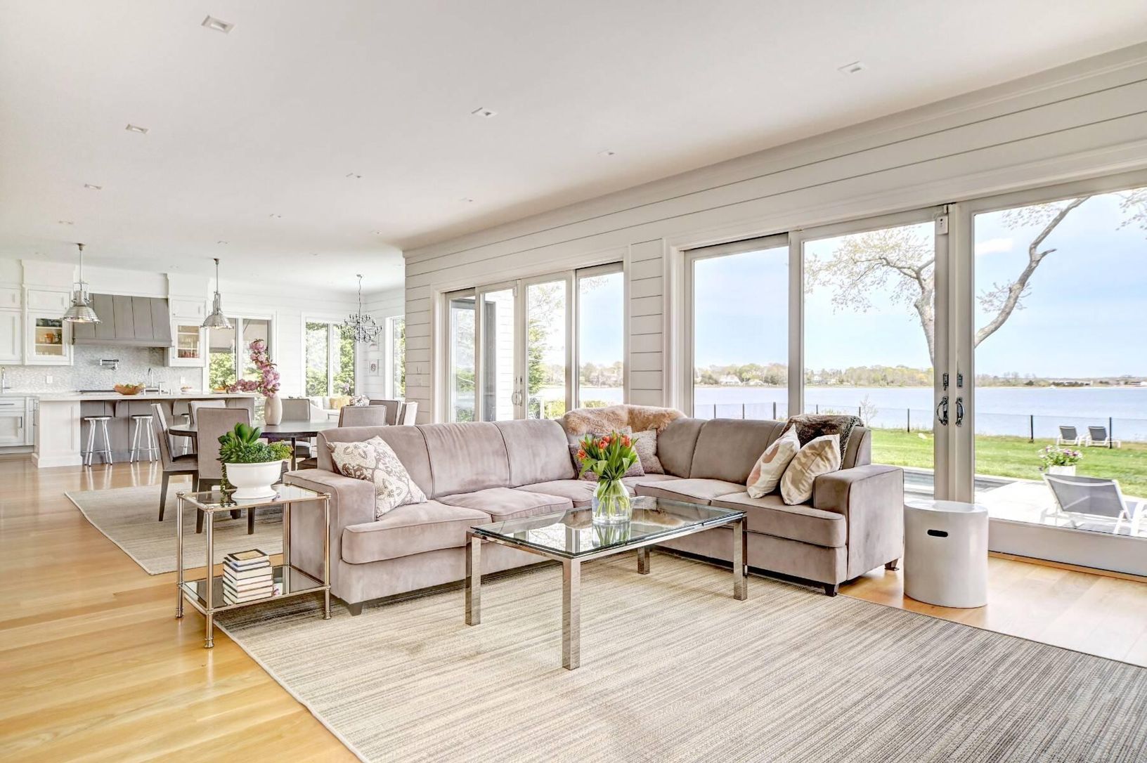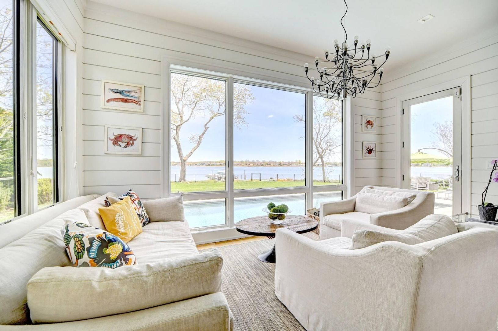 MD-June $90,000; September $50,000; 2 Weeks $45,000 Set on a manicured 0.60+/- acre waterfront parcel on a secluded Bay Point peninsula with dramatic water views of Sag Harbor Village, this recently built and immaculately maintained, 6 bedroom, white shingle traditional, with a stylish, standing seam metal roof, offers a 115+/- foot deep water dock, waterside heated, gunite, salt water pool and spa, finished lower level, and an attached garage