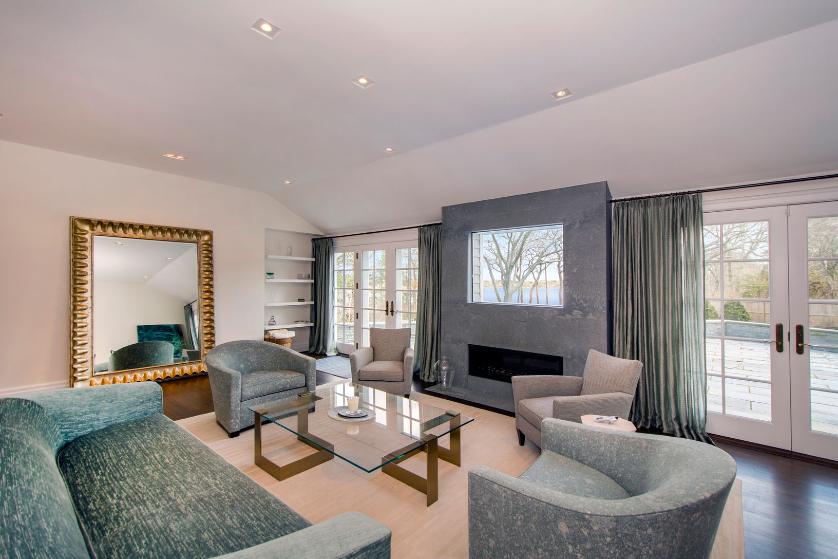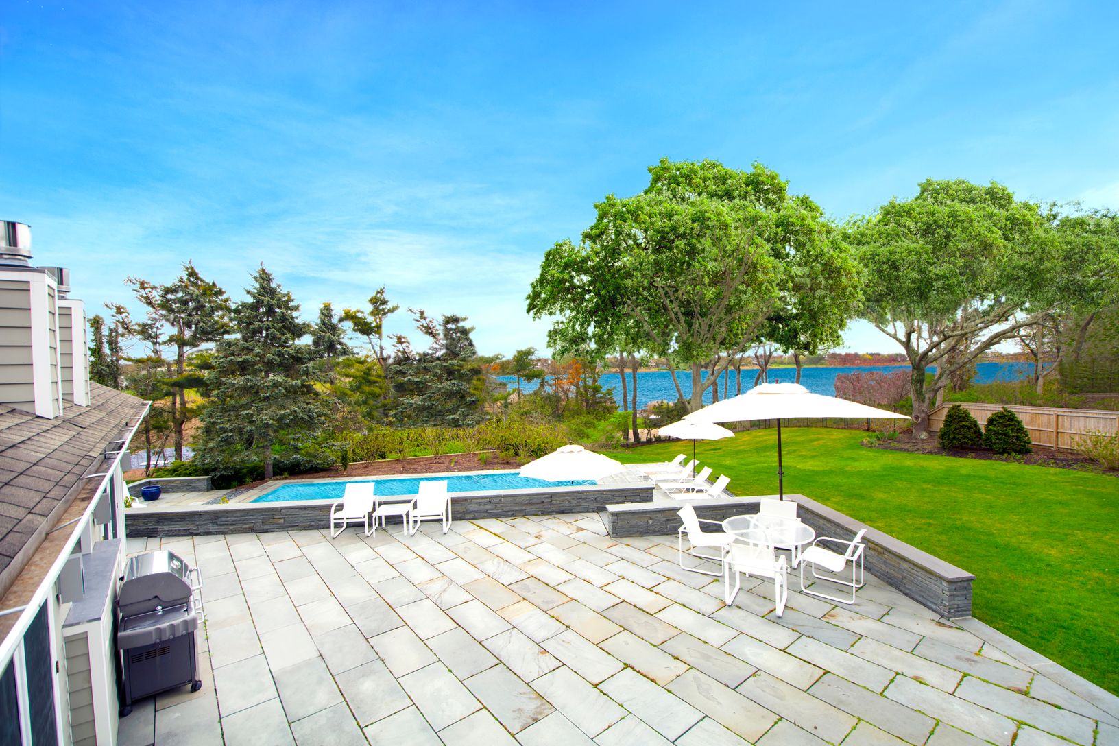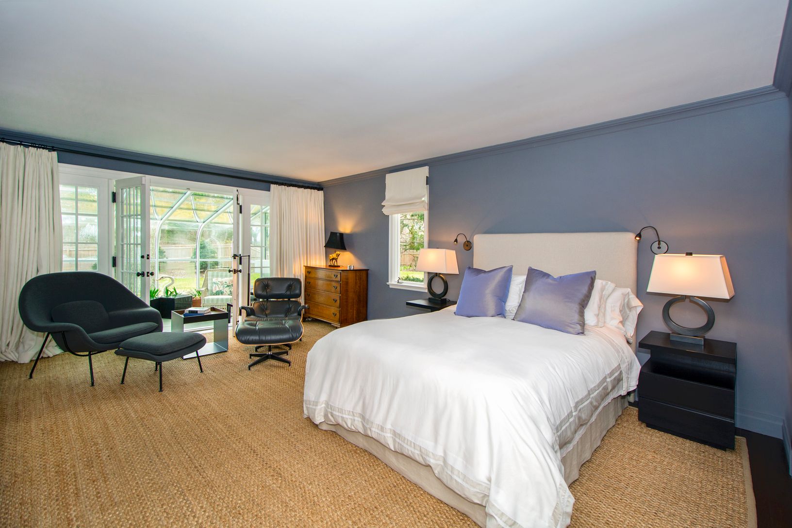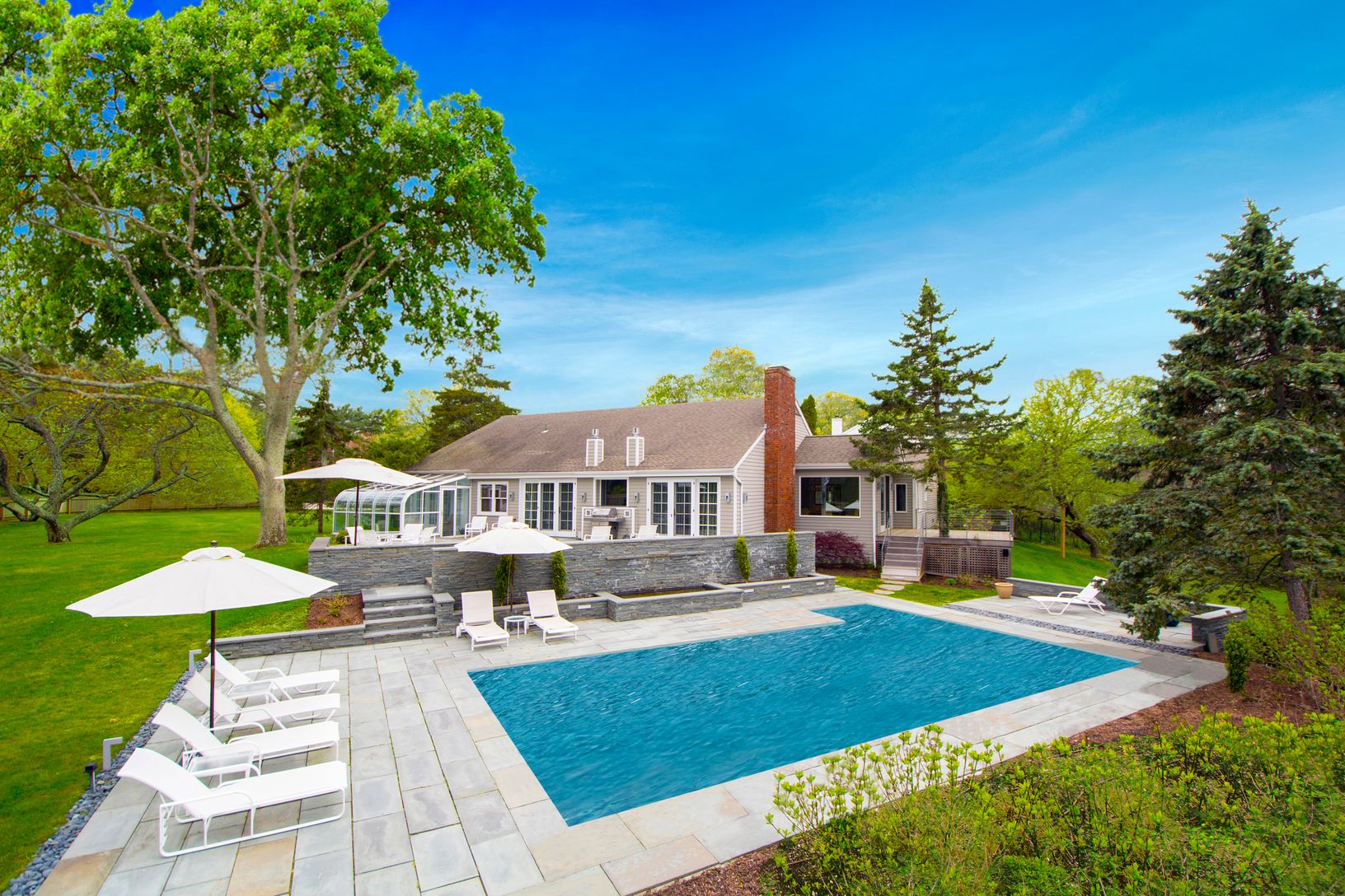 Renovated, super-chic four-bedroom residence, south-of-the-highway with custom heated pool, water views of Hayground Cove, and award-winning landscape design, is now offered for rent. Beyond serene, enjoy world-class design, both inside and out. Everything on one level, the main entry offers a view directly to the outside decking. The remodeled kitchen now includes a modern plan and professional appliances. The living room with sleek built-in