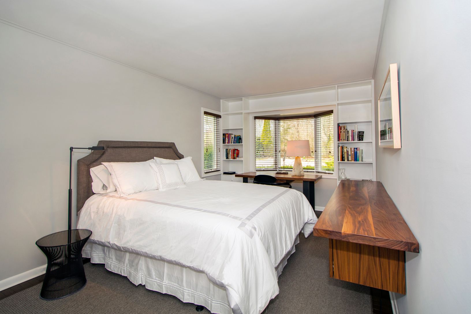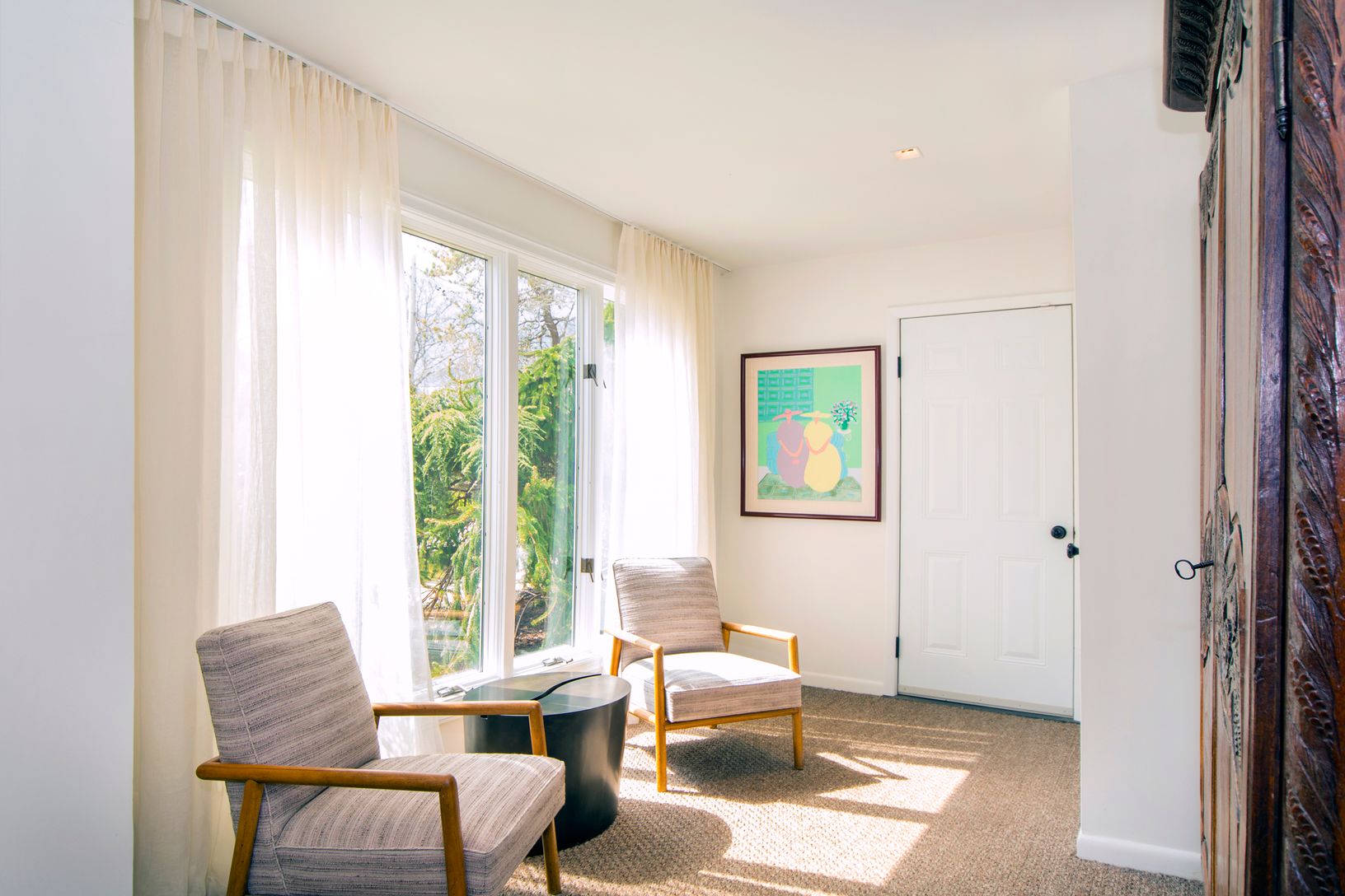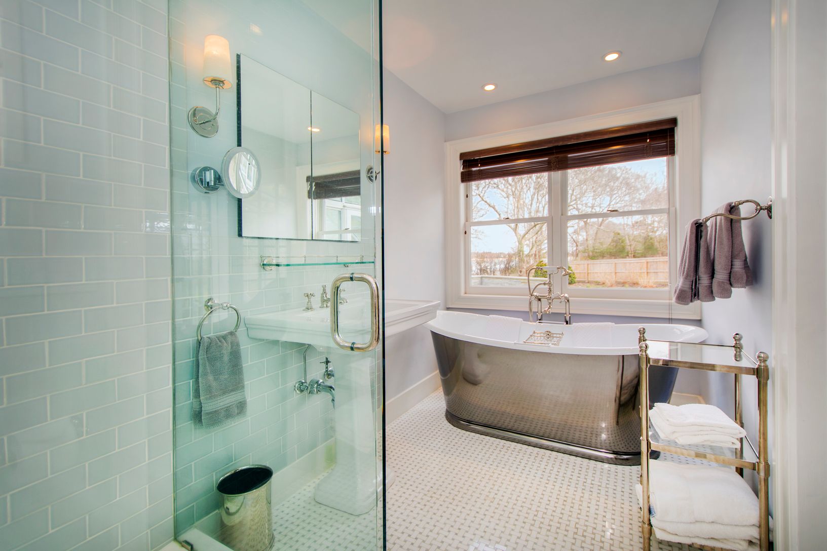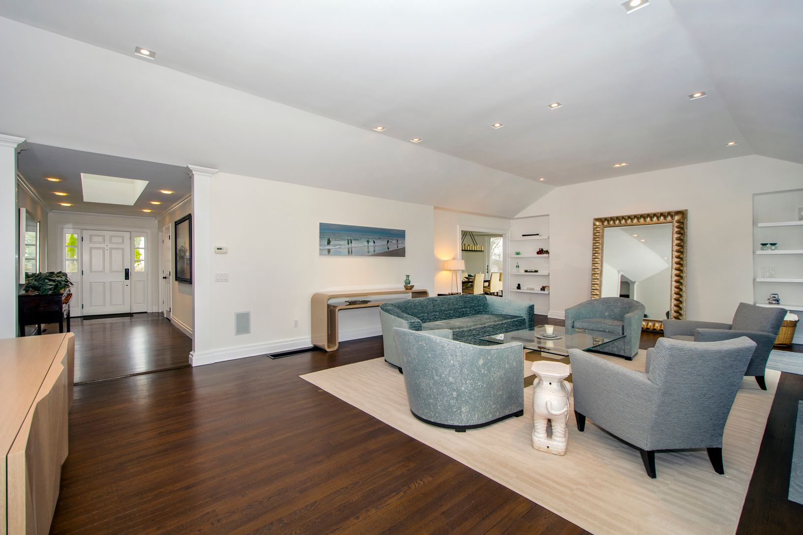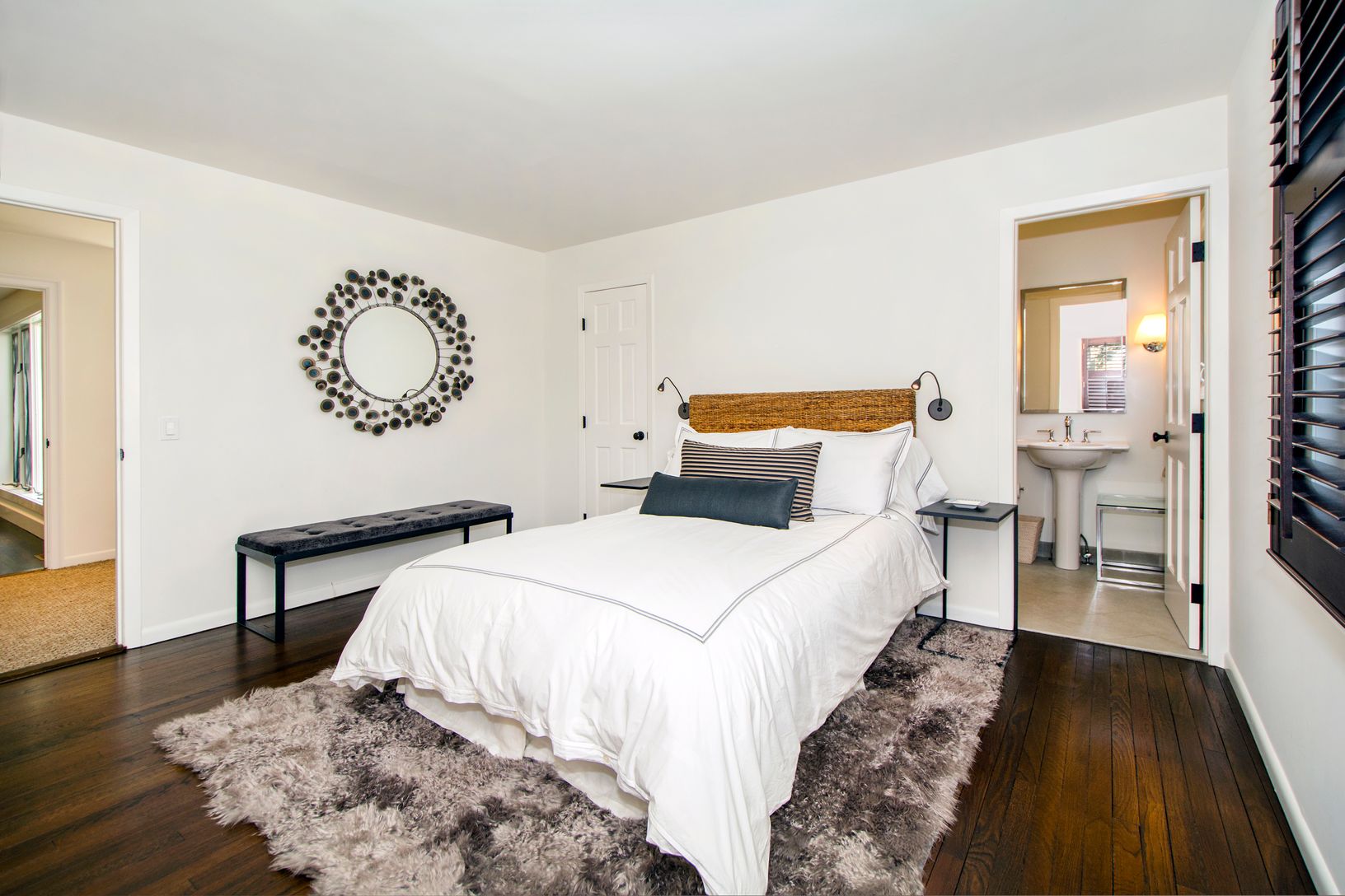 Renovated, super-chic four-bedroom residence, south-of-the-highway with custom heated pool, water views of Hayground Cove, and award-winning landscape design, is now offered for rent. Beyond serene, enjoy world-class design, both inside and out. Everything on one level, the main entry offers a view directly to the outside decking. The remodeled kitchen now includes a modern plan and professional appliances. The living room with sleek built-in