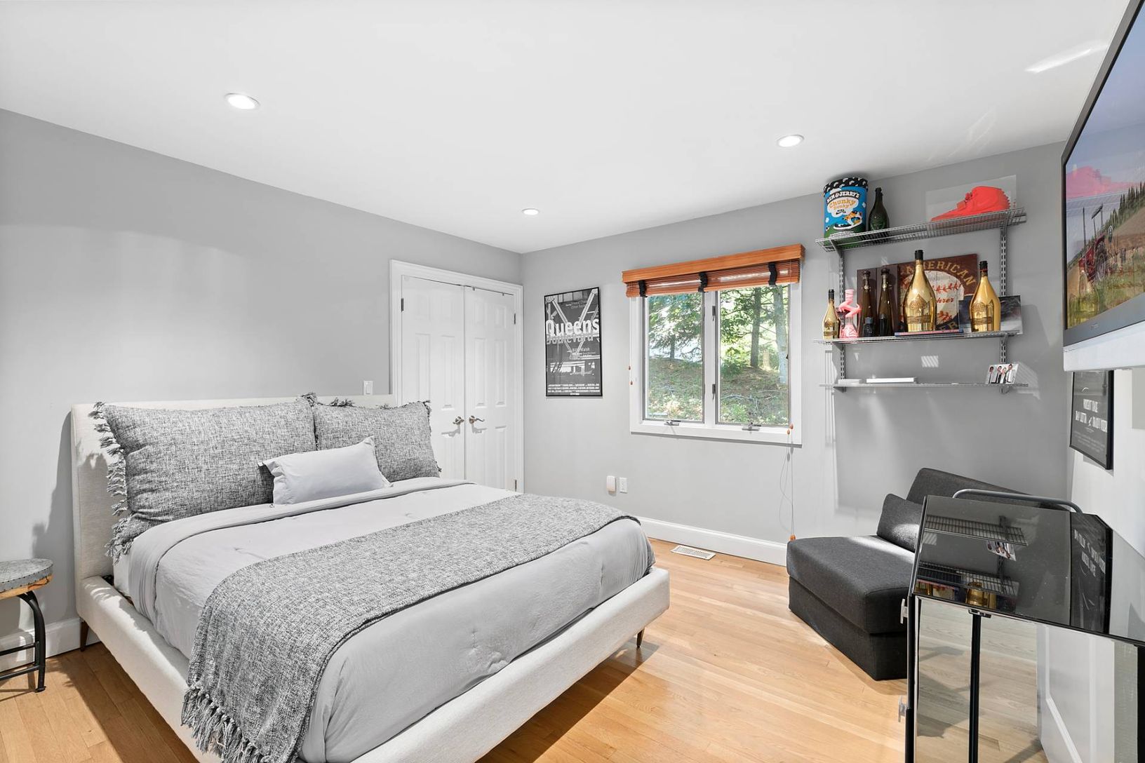 Privacy abounds in this modern Amagansett retreat at the end of a cul-de-sac on Scrimshaw Lane. Set on 1.2 lush acres with mature landscaping, 4 bed, 2 bath home on two levels is the perfect rental. Enter from the covered porch into the bright and airy double-height living area with fireplace and glass doors opening to the deck and pool. Off the living area is the well-appointed kitchen complete with stainless steel appliances, breakfast and l