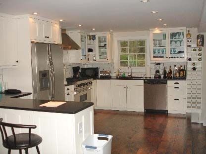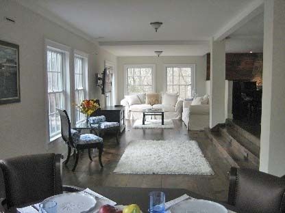 Perfect Sag Harbor location- this residence was completely renovated in 2006 (down to studs), with front and rear additions. Dramatic grand entry with white tongue and groove bead-boarding on the double-height entry ceiling, lots of windows, and impressive black slate flooring. Double-glassed French doors lead from the entry into spacious and inviting living areas. Wide 10" pine plank flooring in the double-height great room and dining room, w