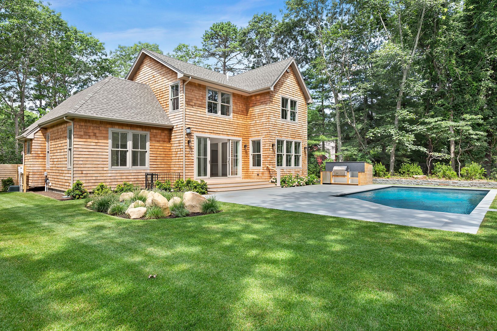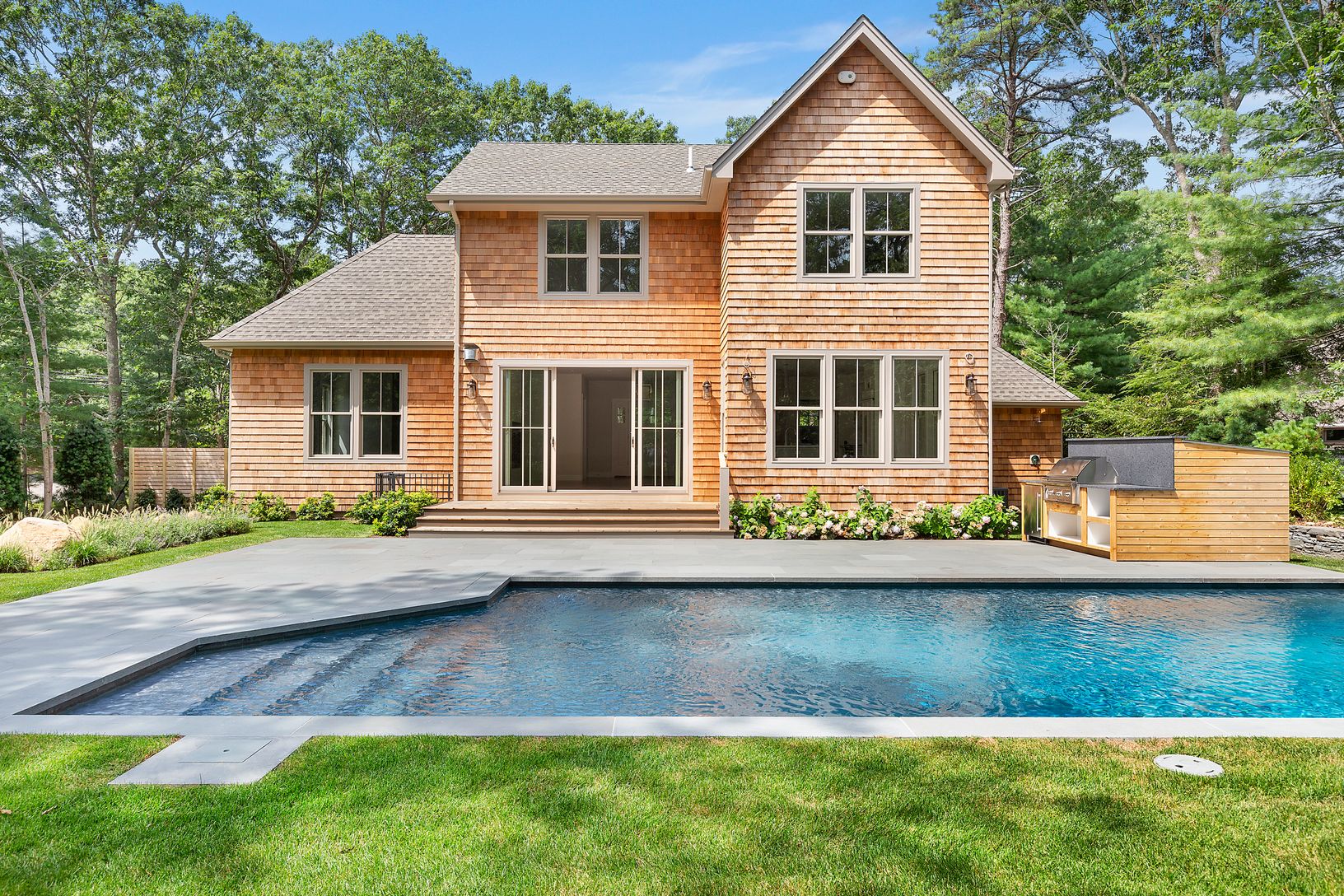This 3500 +/- sq ft house has been recently completed by renowned East End builder, Forst and Silverblank, Inc. Featuring 5 bedrooms and 4.5 baths on 3 levels of living space on .49 acre, the open floor plan in conducive to entertaining. The first floor features a spacious master suite boasting a spa like bathroom with steam shower, open flow living room, dining area and gourmet kitchen all opening to the landscaped yard with heated gunite poo