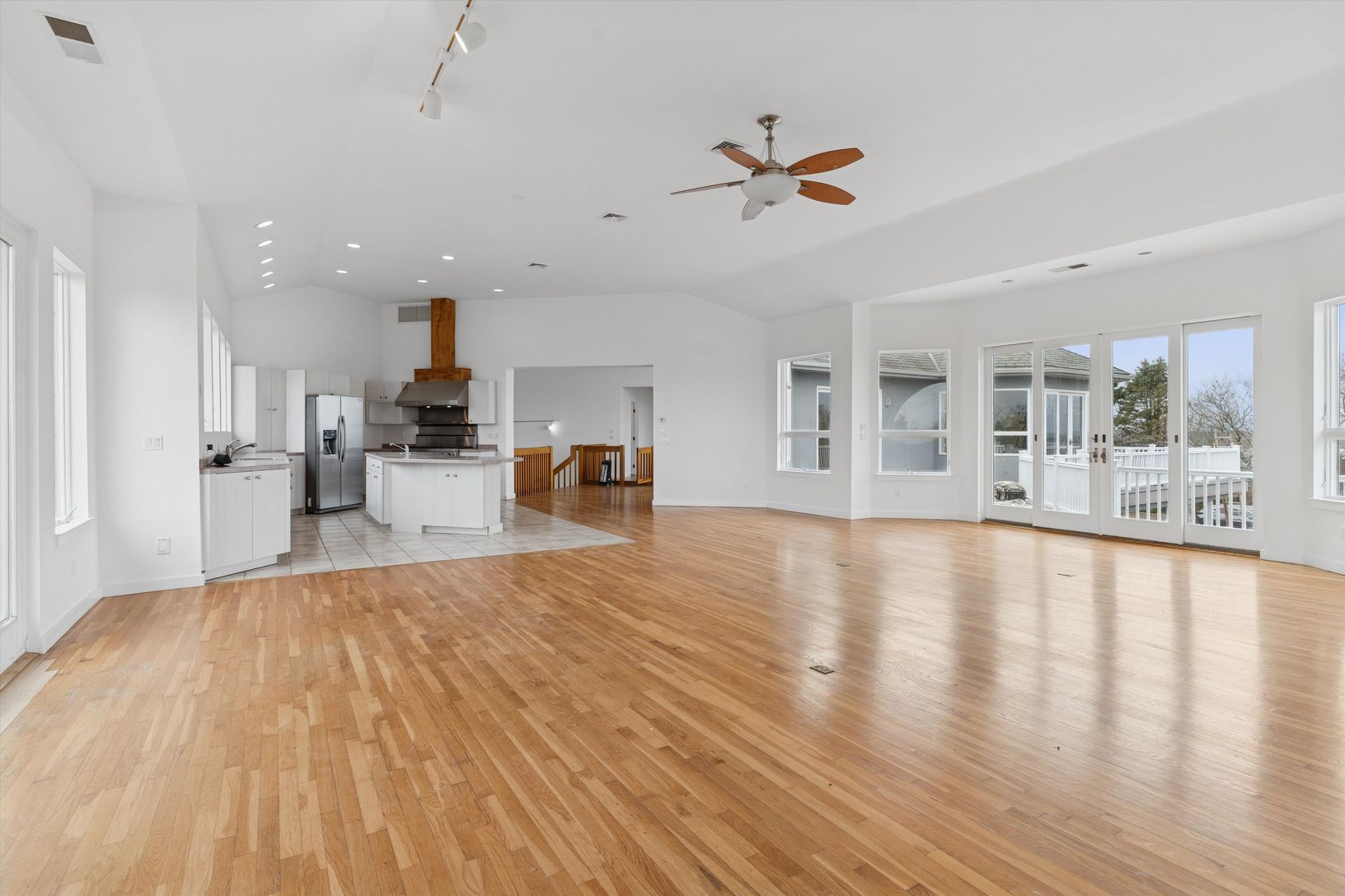 The dramatic central staircase leads to a breathtaking landing with unobstructed lake vistas, revealing three spacious bedrooms incl