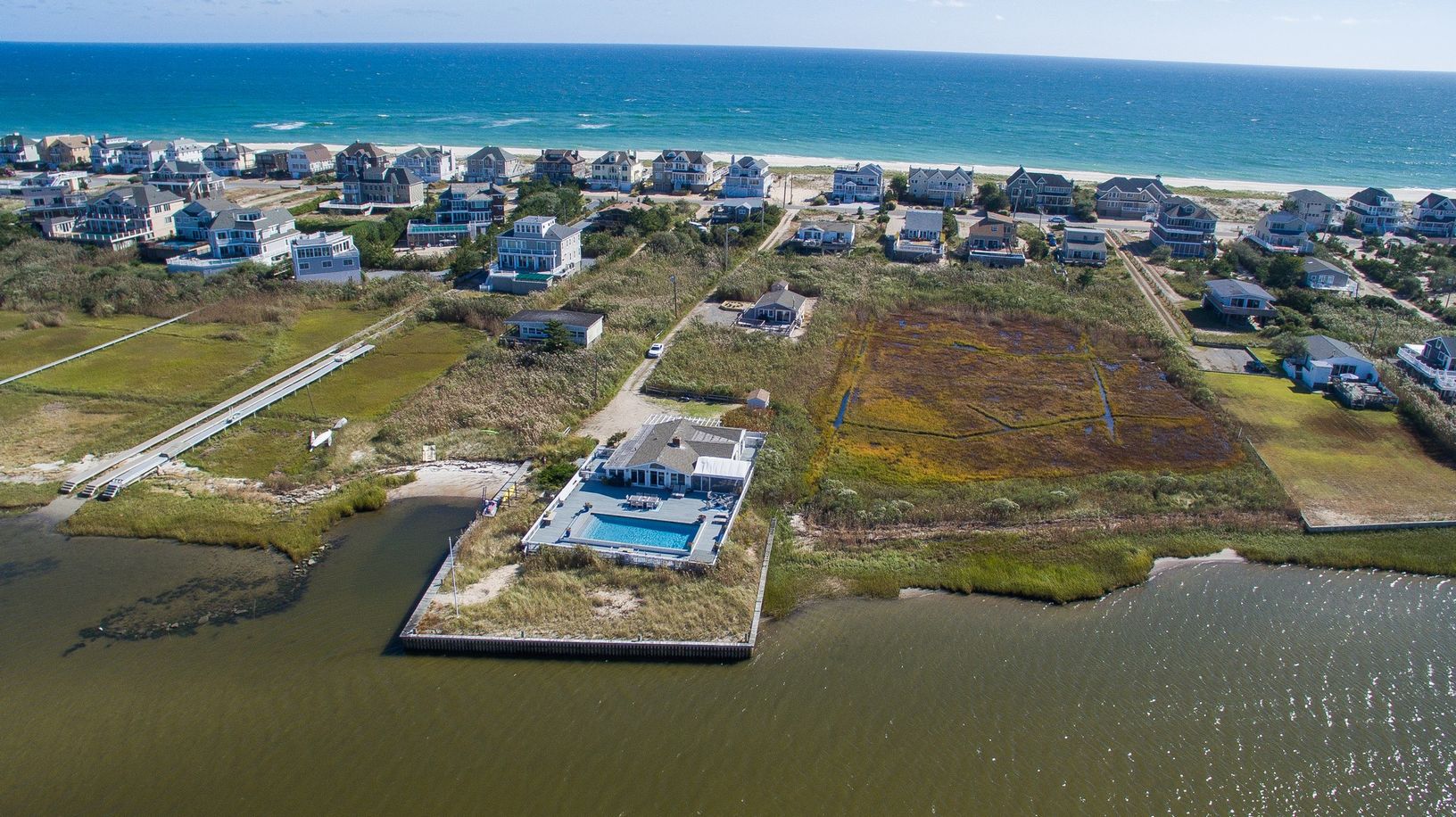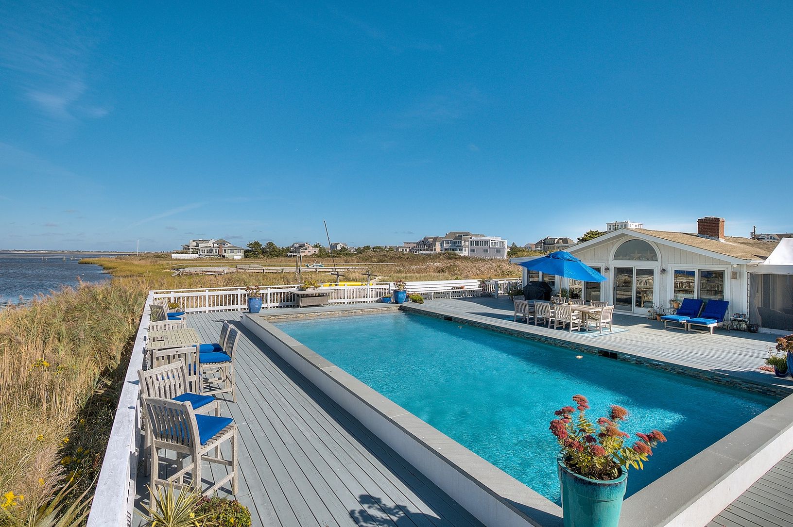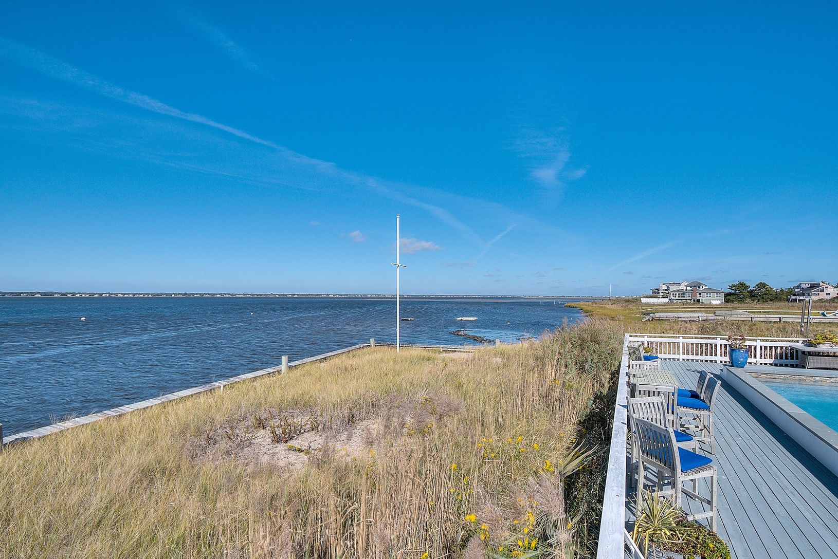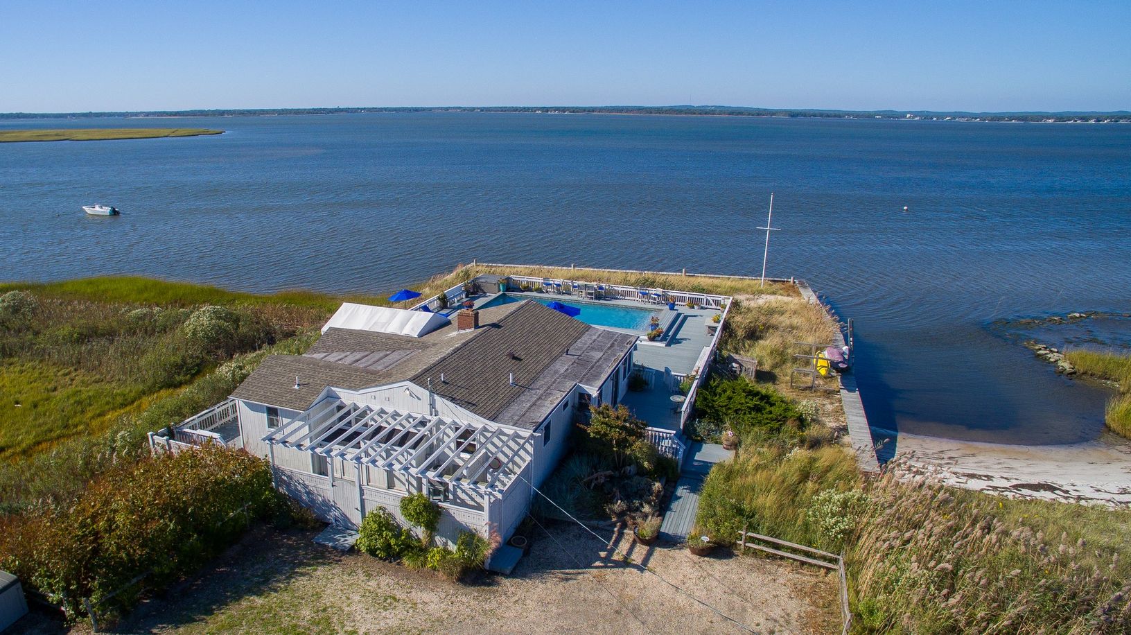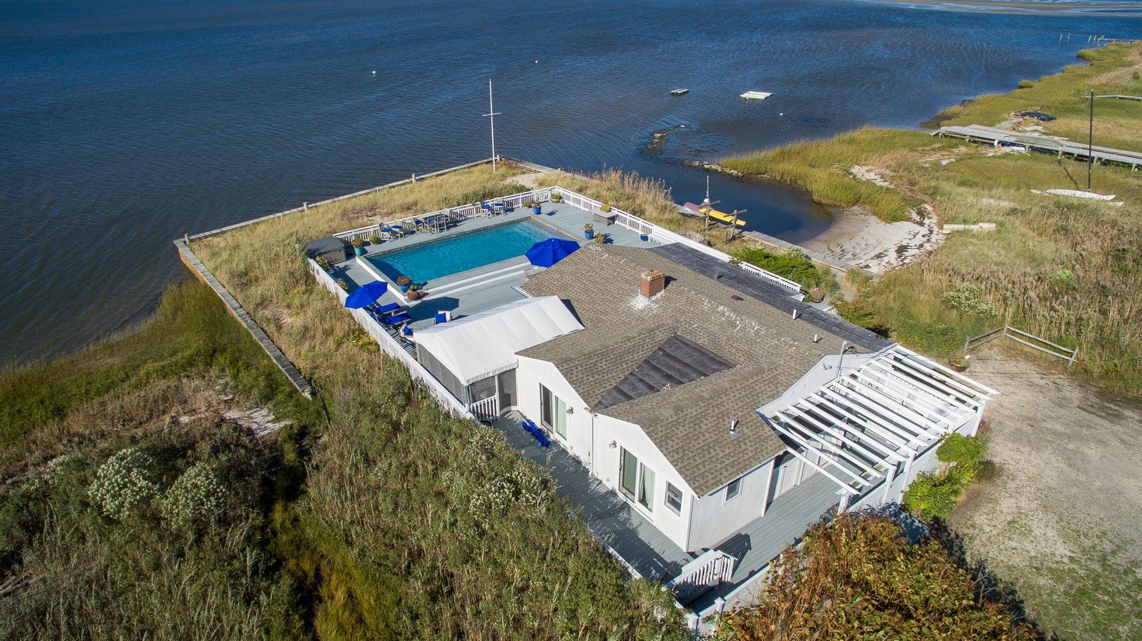 One of a kind location with 360 degree views & simply amazing sunsets. Your own bay front peninsula. This open and light filled beach house has 5 bedrooms, 3 baths, a bright updated kitchen with marble counters and stainless appliances that flows into the dining area and living room with fireplace, a sun drenched enclosed porch, oversized outdoor shower with dressing area, a huge bayside deck with gunite pool. A right of way to the ocean c