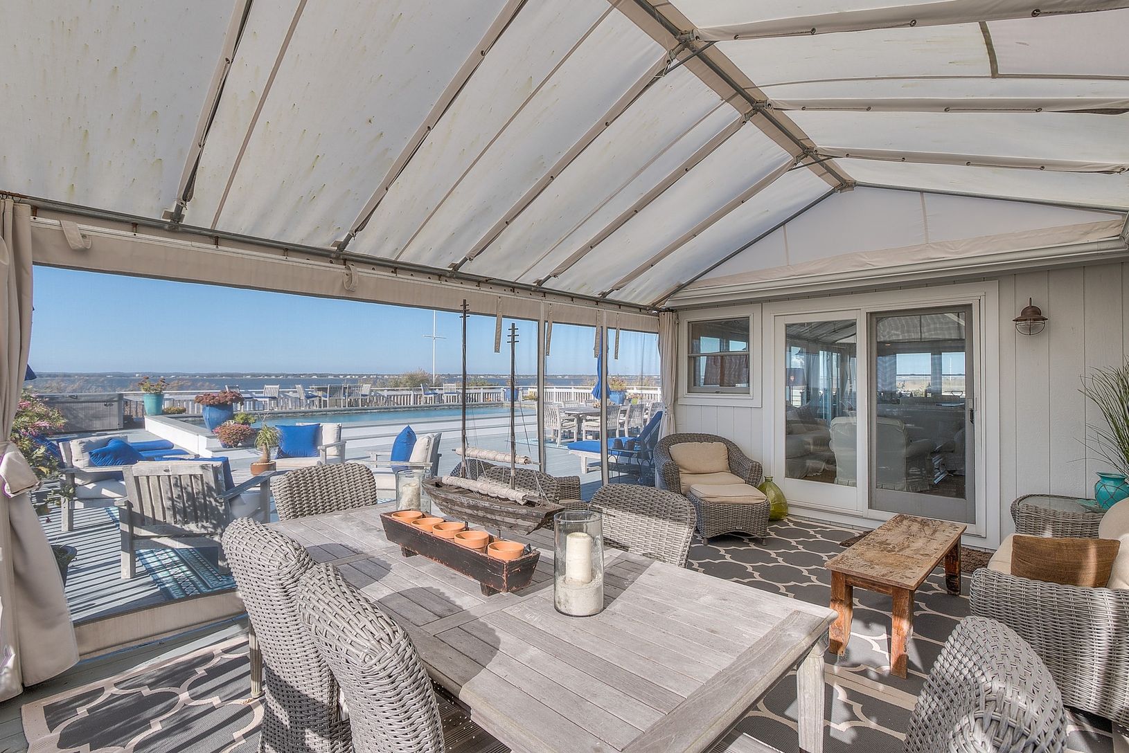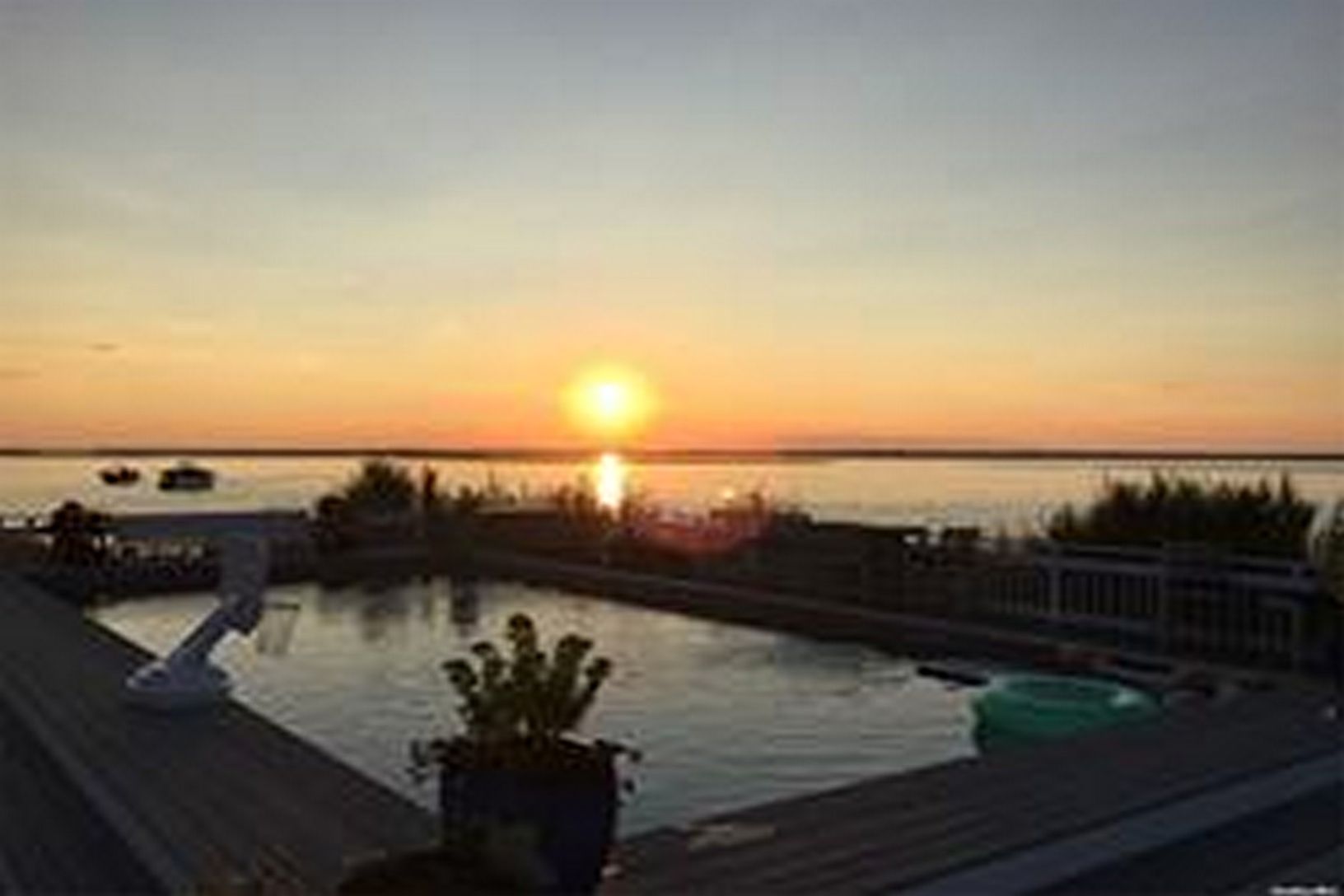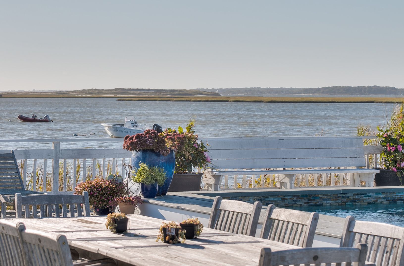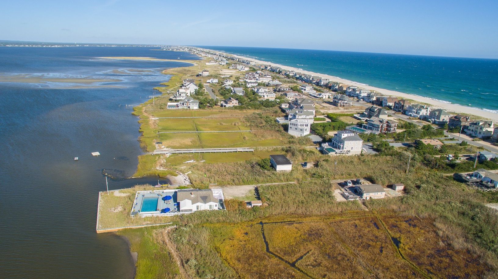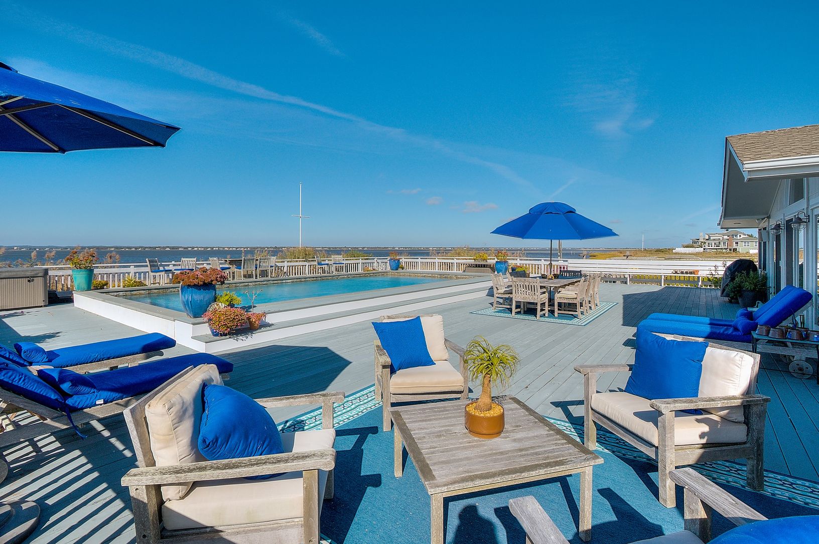 One of a kind location with 360 degree views & simply amazing sunsets. Your own bay front peninsula. This open and light filled beach house has 5 bedrooms, 3 baths, a bright updated kitchen with marble counters and stainless appliances that flows into the dining area and living room with fireplace, a sun drenched enclosed porch, oversized outdoor shower with dressing area, a huge bayside deck with gunite pool. A right of way to the ocean c
