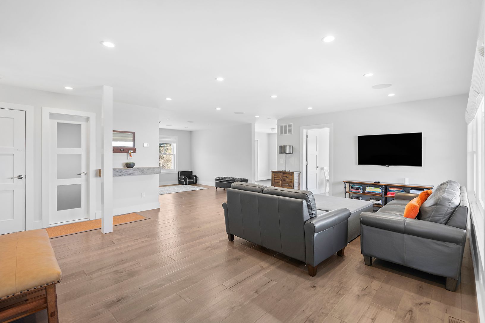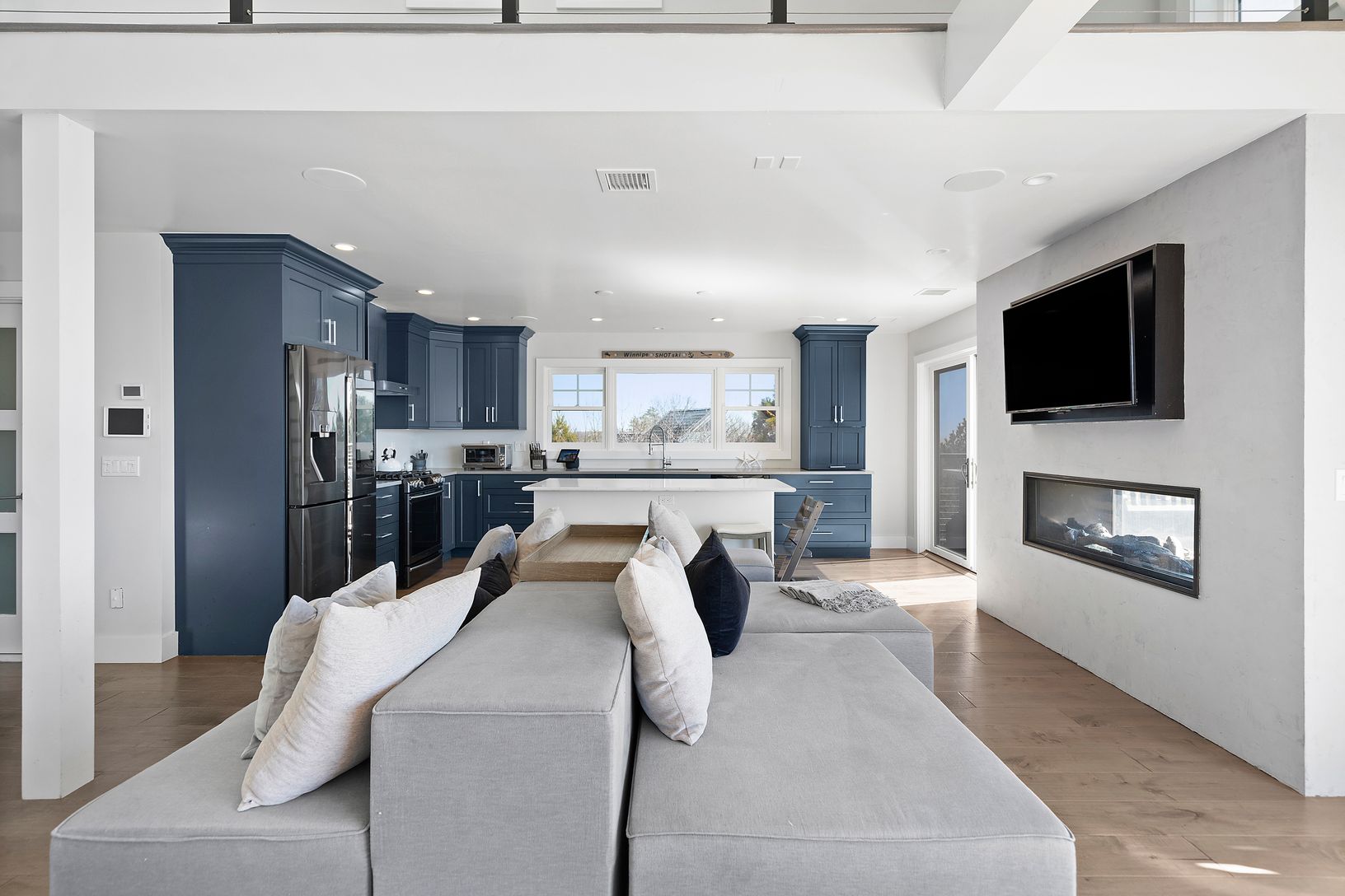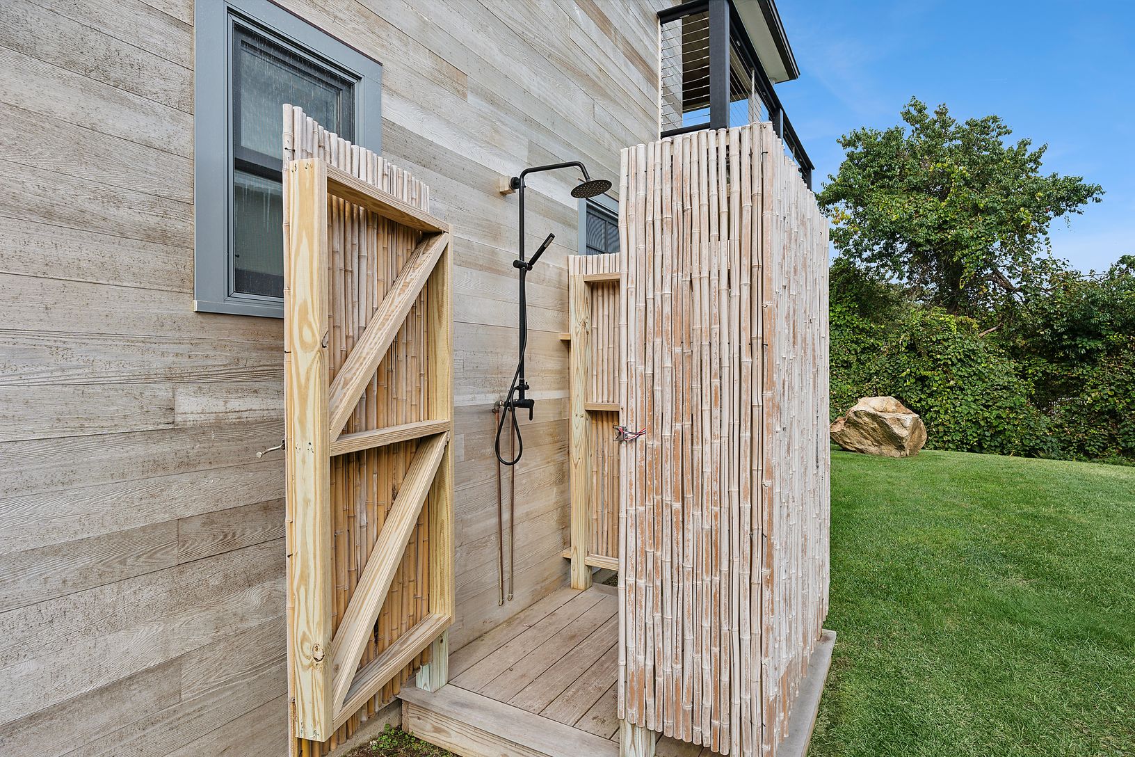 This newly constructed home in Hither Hills combines modern comfort with a prime Montauk location, just steps away from ocean access. The first floor includes a spacious den that can serve as a bedroom, a bright open living area, a gym with convenient outdoor access, a full bathroom, and two guest bedrooms. Upstairs, the airy living room features an indoor/outdoor gas fireplace and multiple sliders that lead to a wraparound deck offering stunn