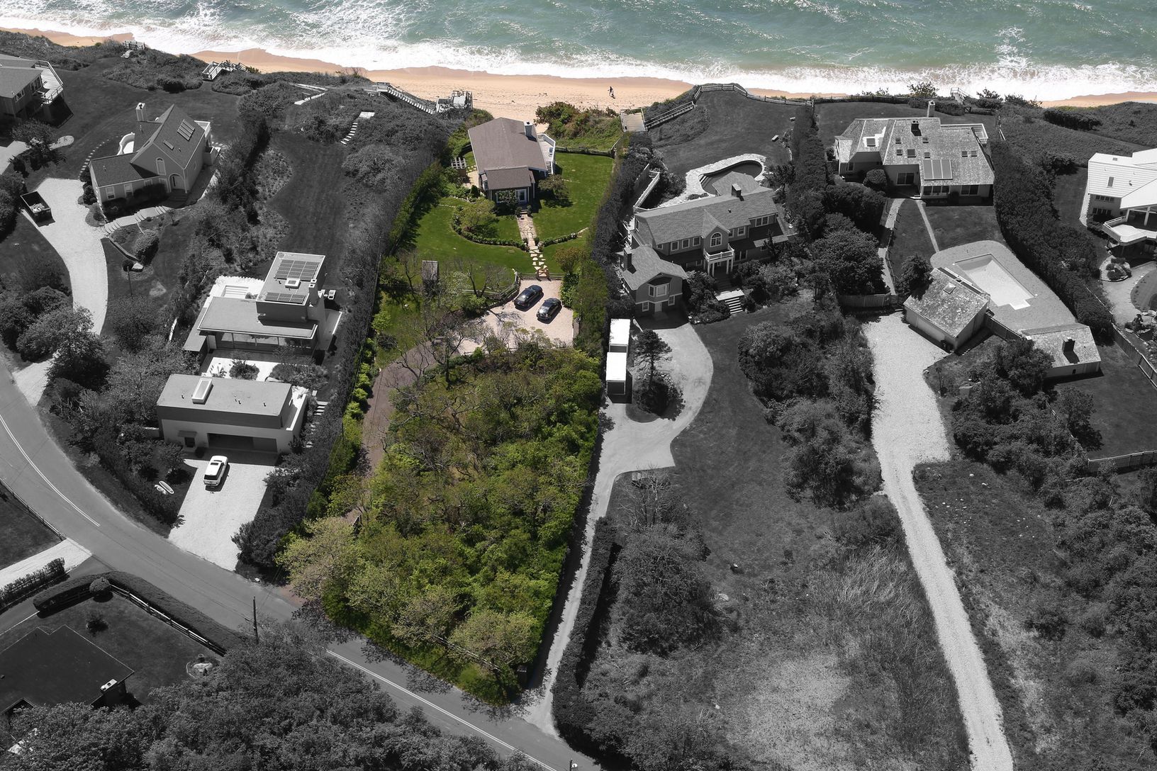Oceanfront location on a dead-end street with private access to the best, little known (except by the pros) surfing break on the East End of Long Island. Full deep acre extends 400 FT. back with elevation over 50 Ft. above sea level. There is a moderate slope to the Atlantic Ocean. Sweet soft postmodern on two levels features a thoughtfully designed living area. First time available in 35 years