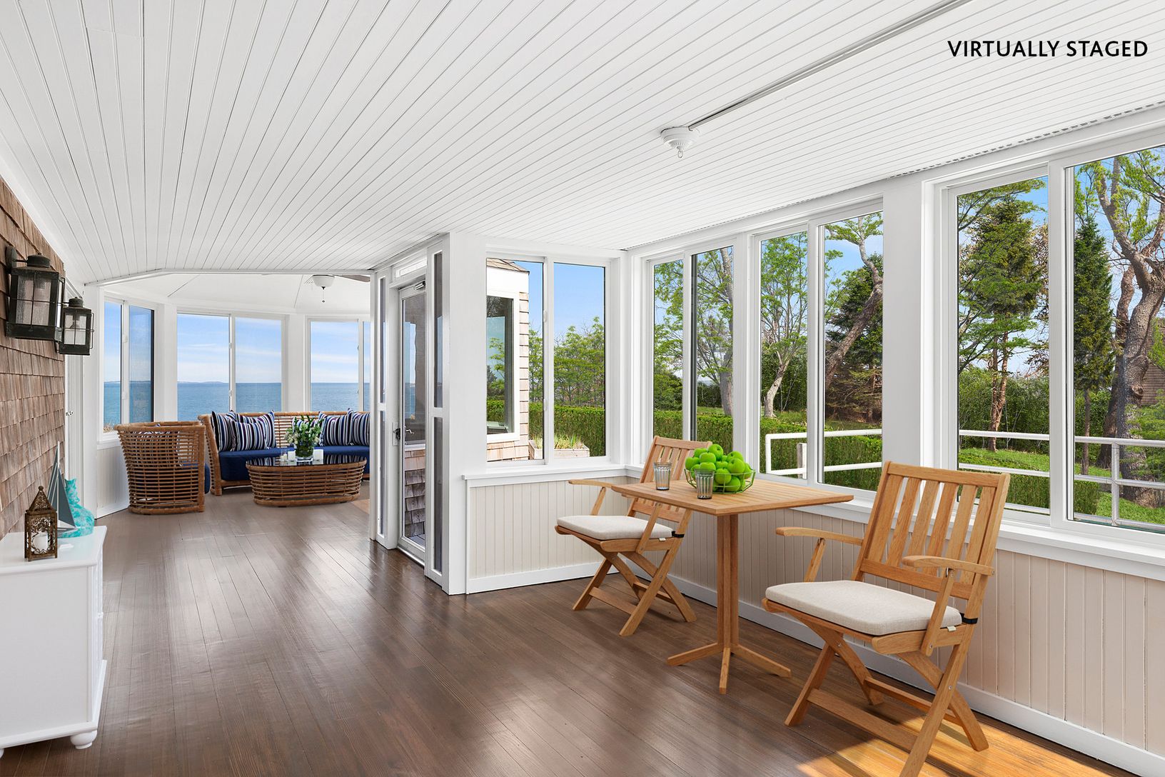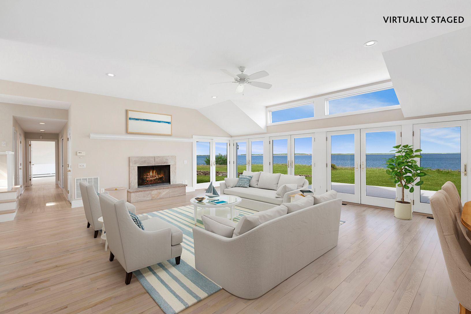 With views of both sunrises and sunsets over Gardiners Bay on desirable Little Ram Island on Shelter Island, sited on 3 +/- acres atop a bluff, this classic shingled styled traditional is what living on the beach is all about. Set away from the road, the driveway wends up to the pebbled driveway and open decks. At the front foyer, dramatic views of the water are an immediate sensation. There is an open layout for the living and dining areas wi