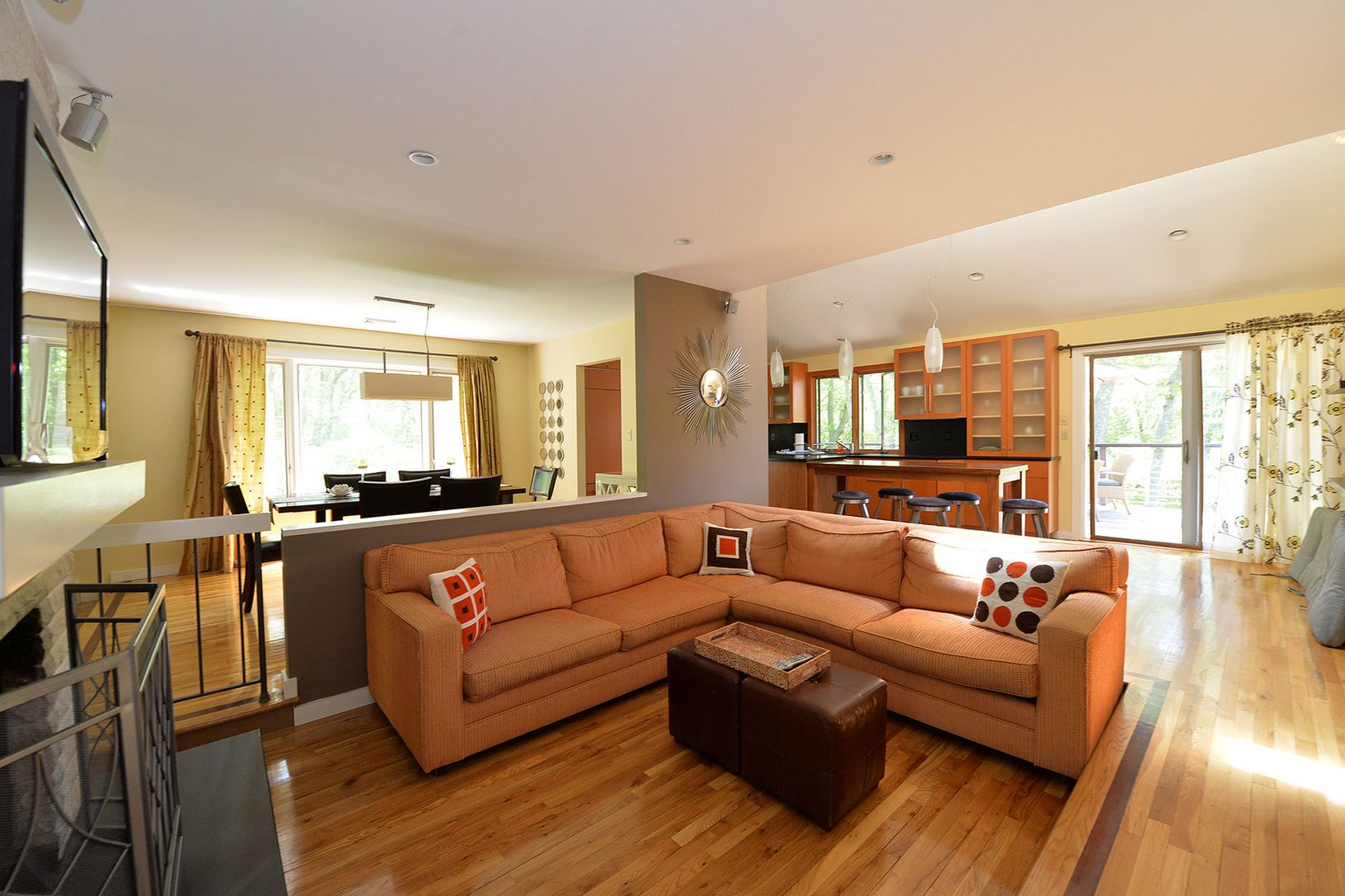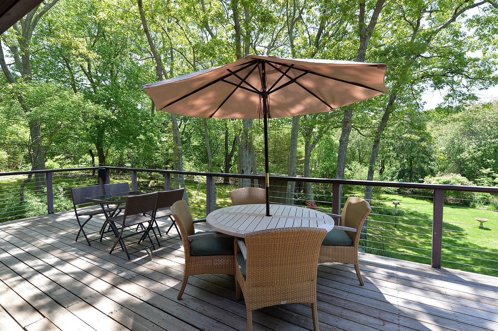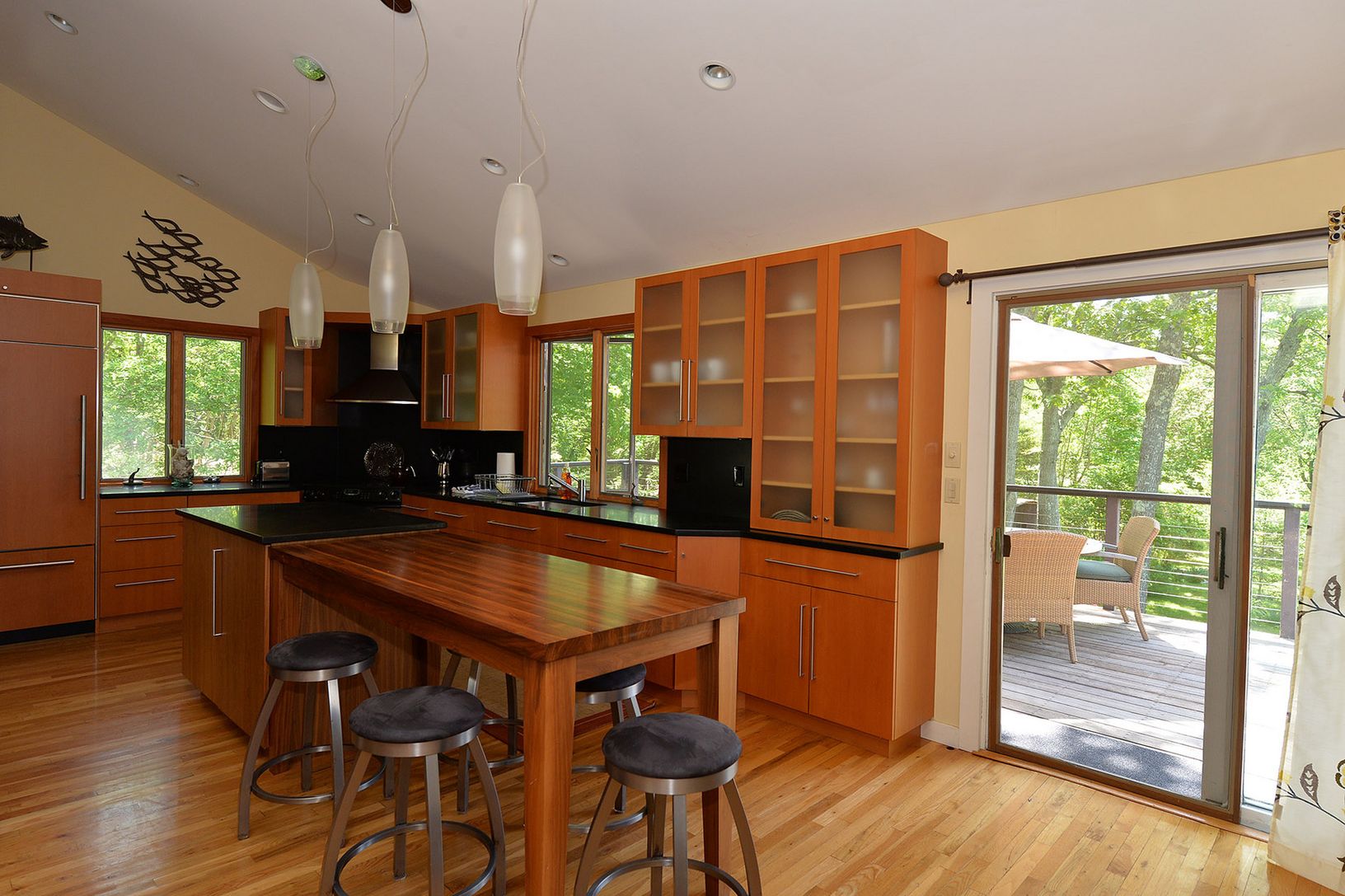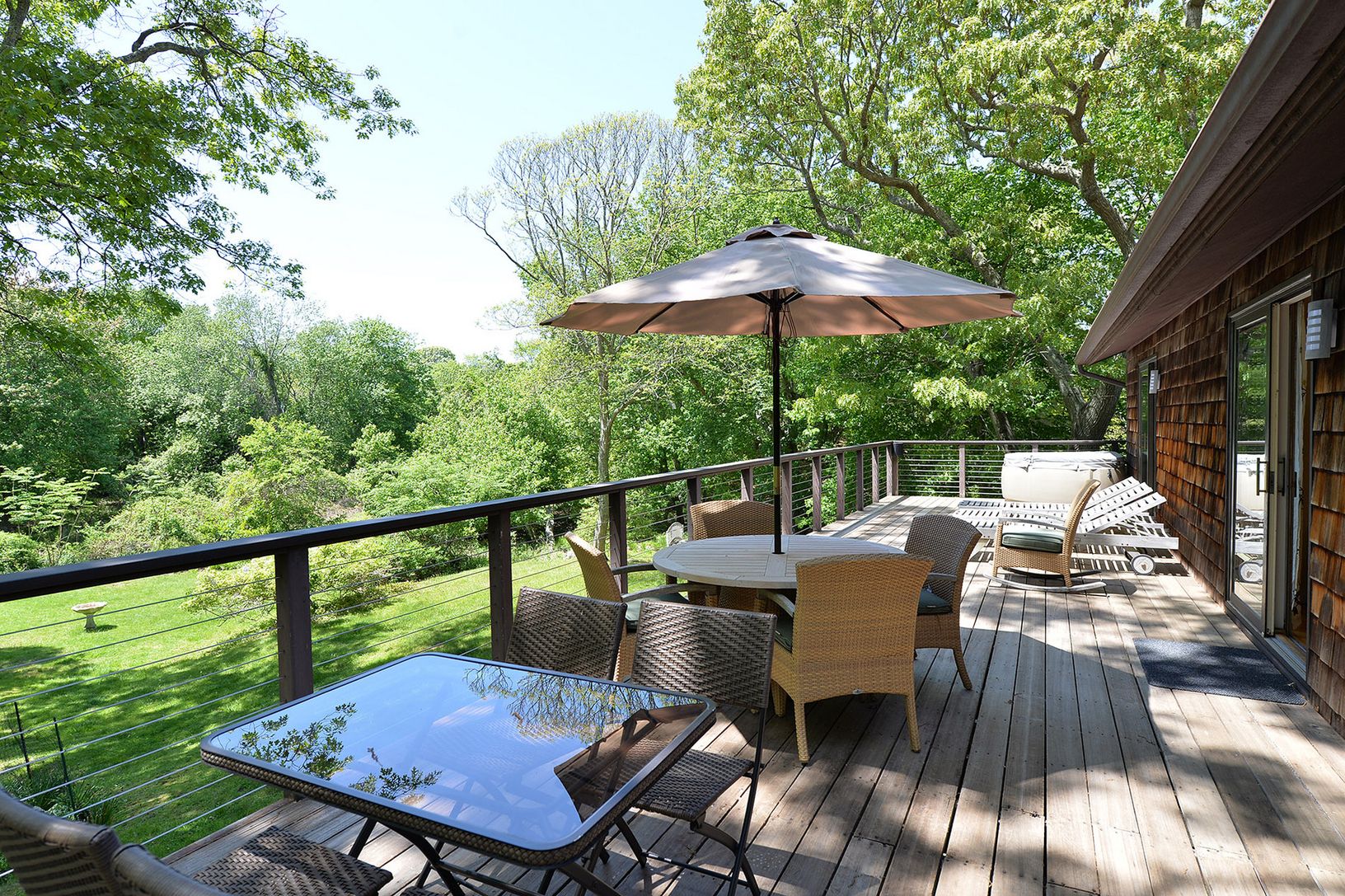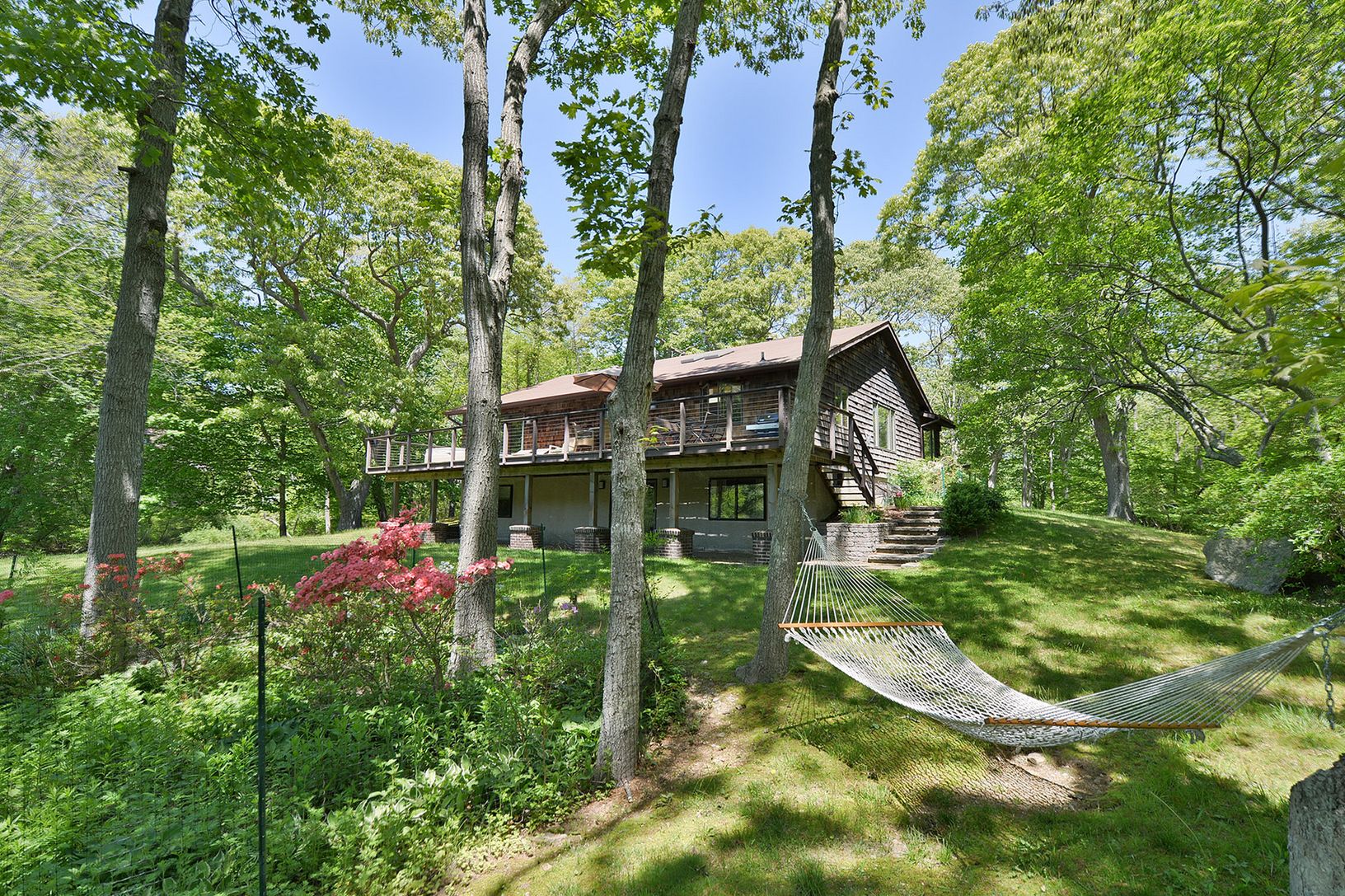 Peace, tranquility, and privacy abound at this magnificent 2.50 acre parcel. Nestled in the center of this serene setting is a sprawling cedar Ranch home with many features including a spacious living room, separate dining room, exquisite kitchen with top of the line stainless steel appliances, honed granite counters, and breakfast bar which overlooks family area with gas fireplace and bar. Sliders from kitchen open to extensive decking. The o