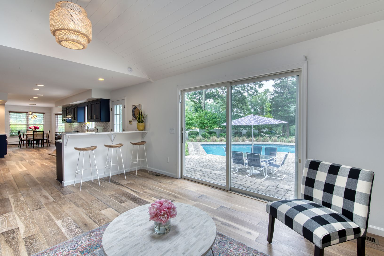 Renovated 4 bedroom 2.5 bath Aquebogue oasis situated on 2.49 mature landscaped acres featuring a large in ground swimming pool, attached 3 car garage and detached 2 car garage with a loft office or studio space above. The interiors of this home have been completely renovated: new wood floors though out, central AC, custom wood work in the primary bedroom, formal dining room, primary bathroom and 1/2 bath. Outside features include: large in-gr