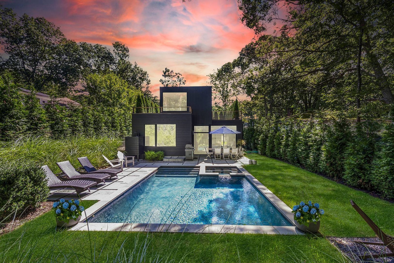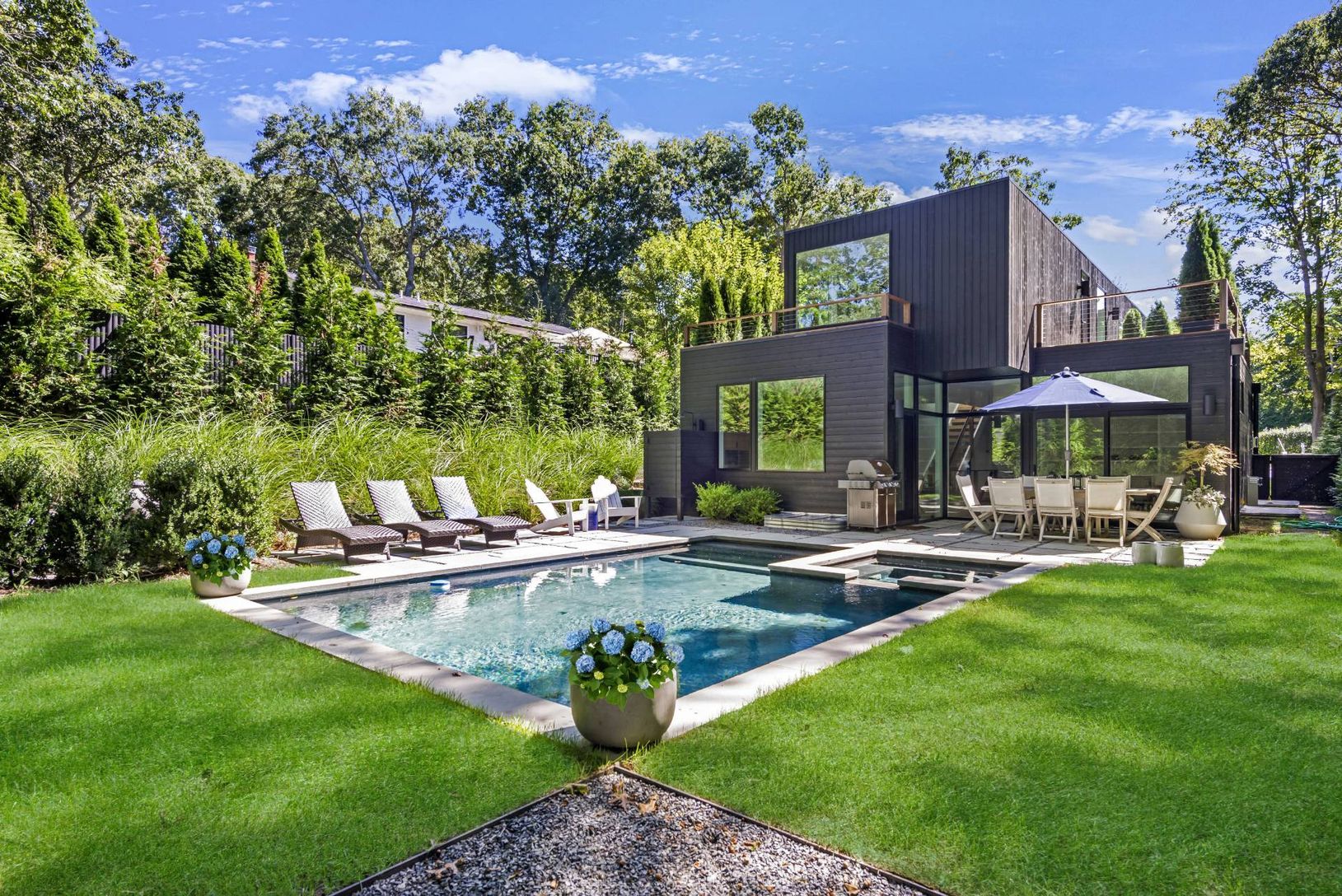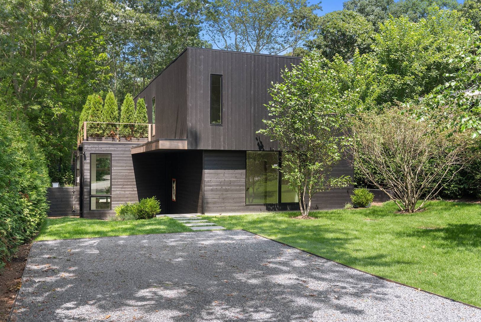 This beautiful, modern new construction, by famed architect Mark Mancuso of Thread Collective, is now complete. Located in the hottest village of the Hamptons, with an expansive open living concept including a finished lower lever for a total SF of about 3,250sf +/- on three levels. There is a floating white oak staircase, three roof decks, and four large bedrooms and four baths with radiant heated floors. The flooring is natural white oak. Th