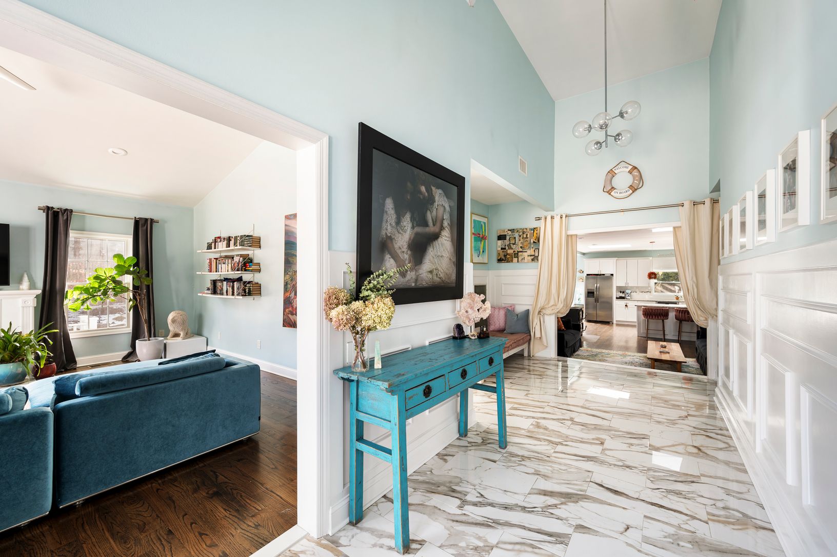 A double-height foyer sets a welcoming tone, opening to a sun-filled living room with soaring ceilings, oversized windows, and a gas fireplace that anchors the space