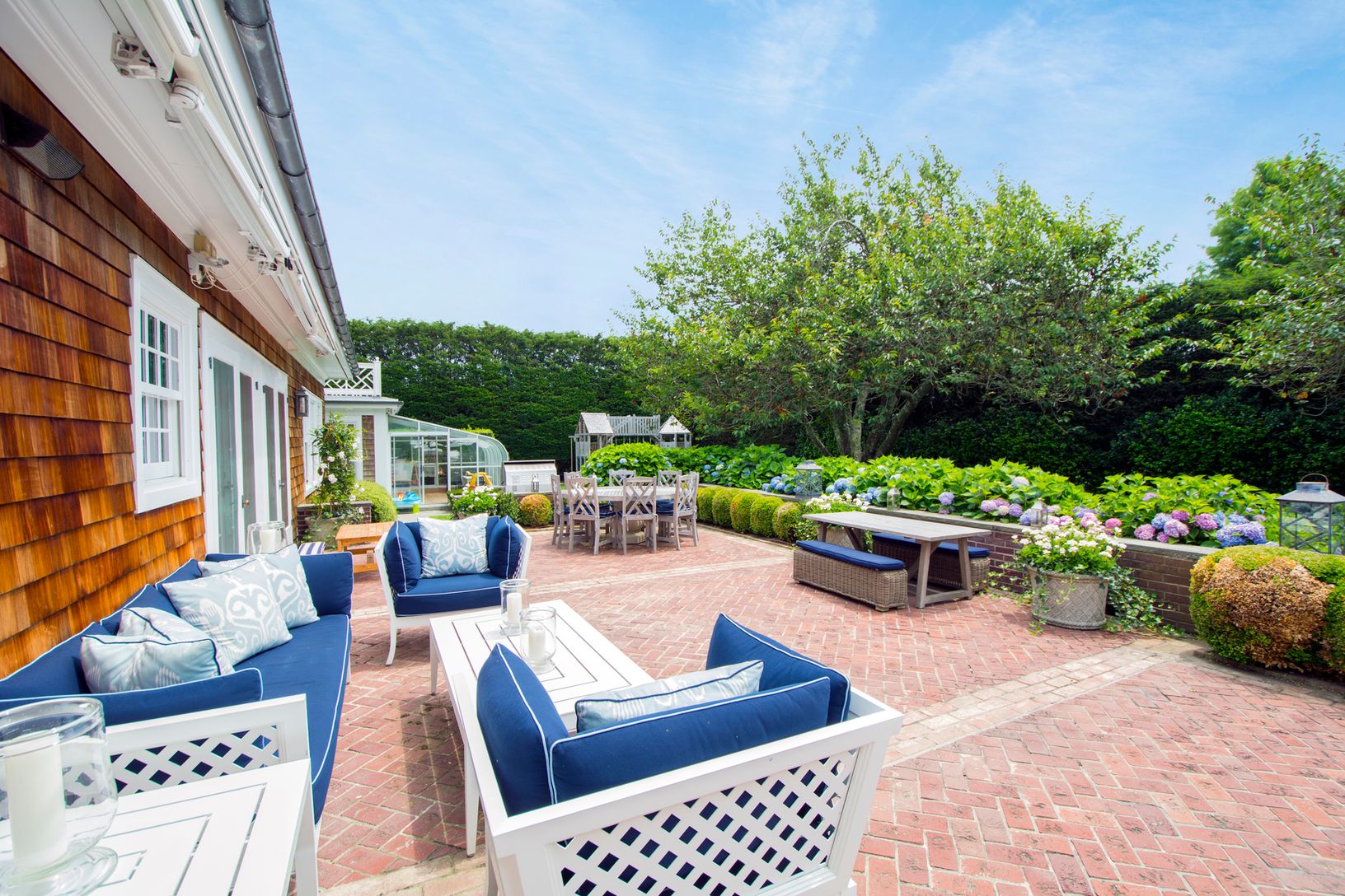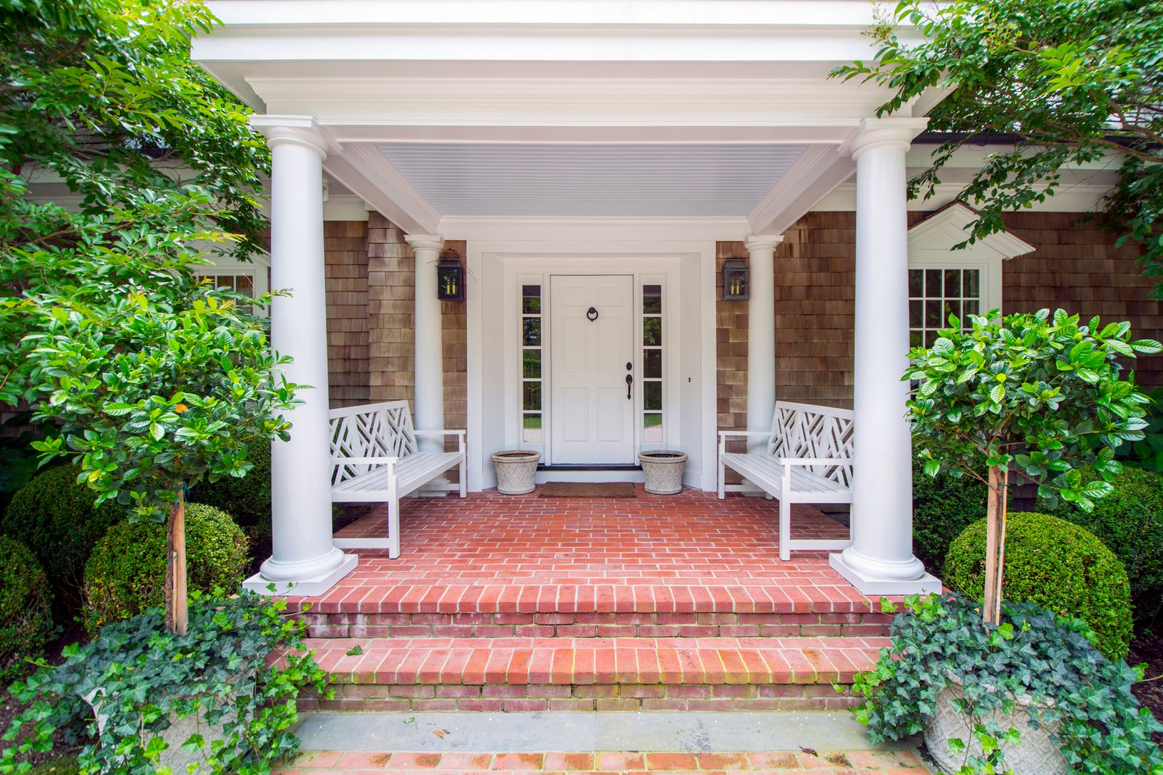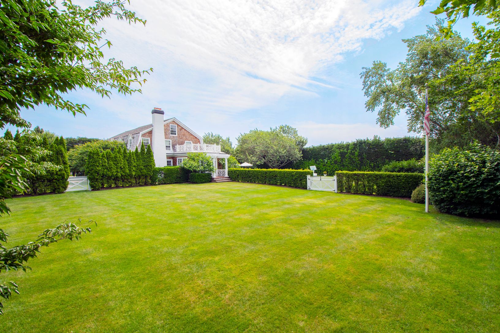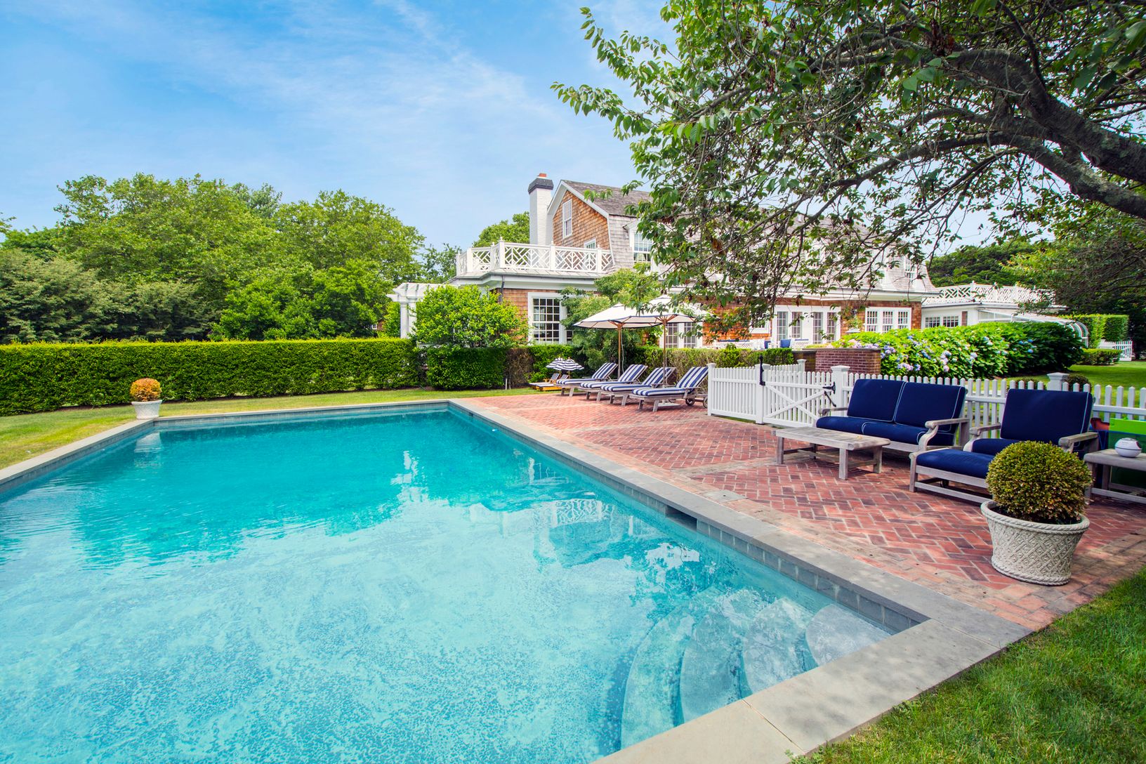 The sound of ocean waves wafts across this lovely Southampton Village home set on one +/- beautifully landscaped acre with heated 40'x20' Gunite pool. High hedges and two gates open to a half-moon gravel drive to the front brick walkway and covered front porch of this shingle-sided traditional residence. With six bedrooms and 6.5 bathrooms in all, the interior spaces are marked by dark polished wood floors and detailed white painted wainscoti