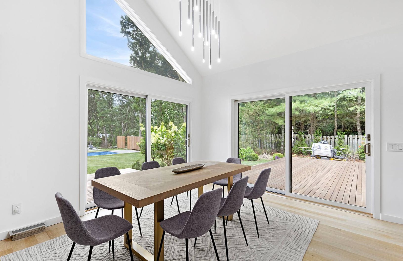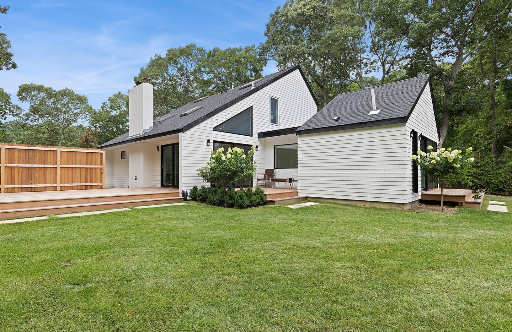 This newly finished 4 bedroom home in Hampton Waters is move in ready. The main floor enjoys an open concept living room with high ceilings and wood burning fireplace. Adjacent is the dining area and a kitchen with Sub Zero refrigerator and Wolf cooktop. The primary en suite bedroom is fitted with a walk in closet and doors to the outside mahogany deck. A guest en-suite bedroom and half bath complete the first floor. The second floor houses tw