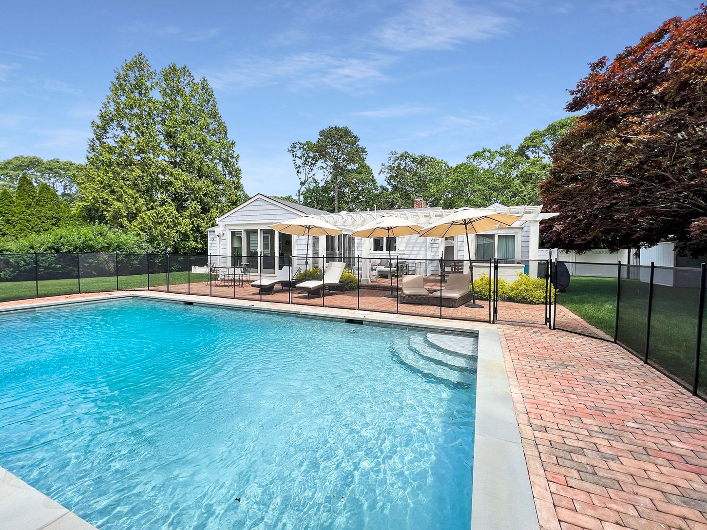 Gorgeous renovated 5 bedroom, 4 bath expanded ranch 1/2 mile to Main Street, Westhampton Beach, and 2 miles to Rogers Beach. The home is set up for outdoor living and relaxing after a day at the beach. There is a beautiful brick patio with a dining table that seats 8 comfortably and a large lounge area with outdoor couches. The brick patio extends to the gunite pool. This is summer living at its best! Available August through LD for $45,000