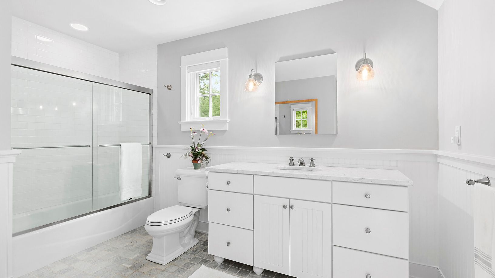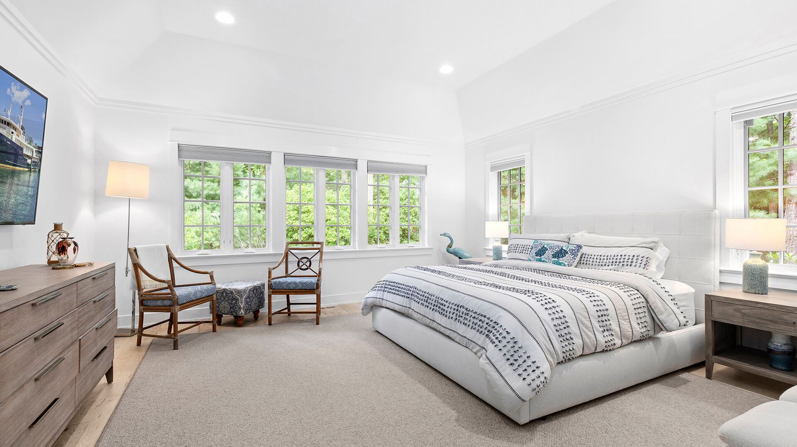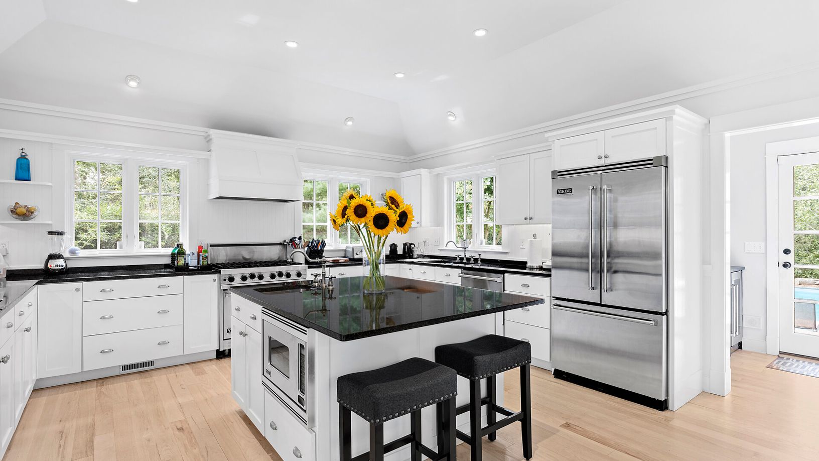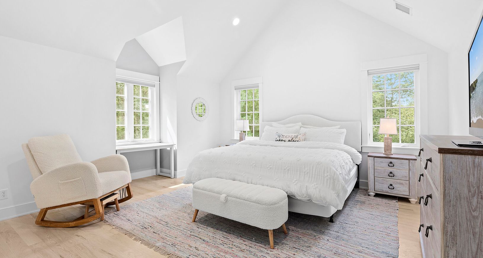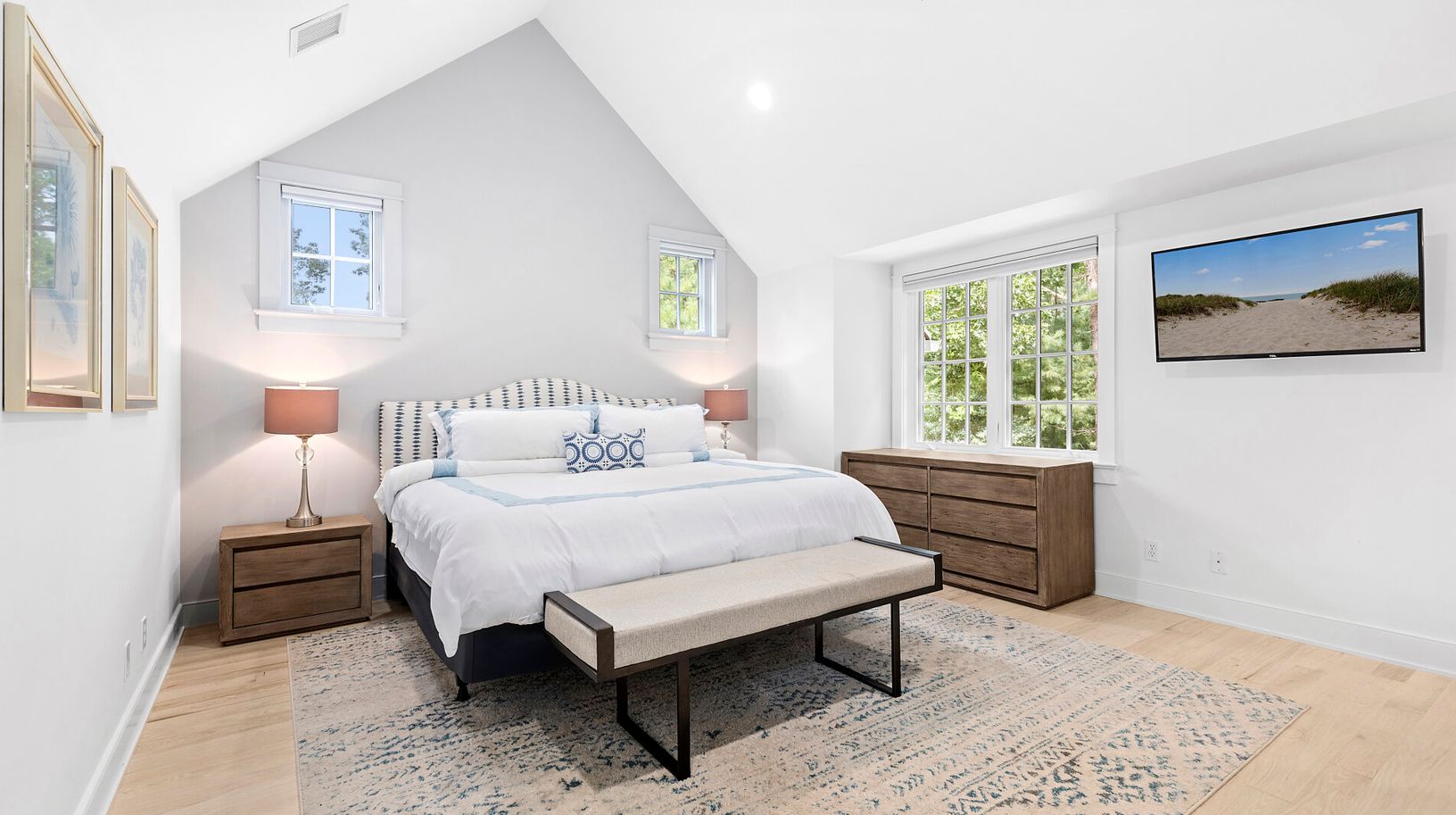 In the heart of East Hampton, a gem of modern living awaits. This recently renovated home boasts a sleek, modern design, complete with vaulted ceilings on the first floor that amplify the spaciousness of its open floorplan. Featuring four bedrooms and five bathrooms, this property comfortably accommodates up to eight guest