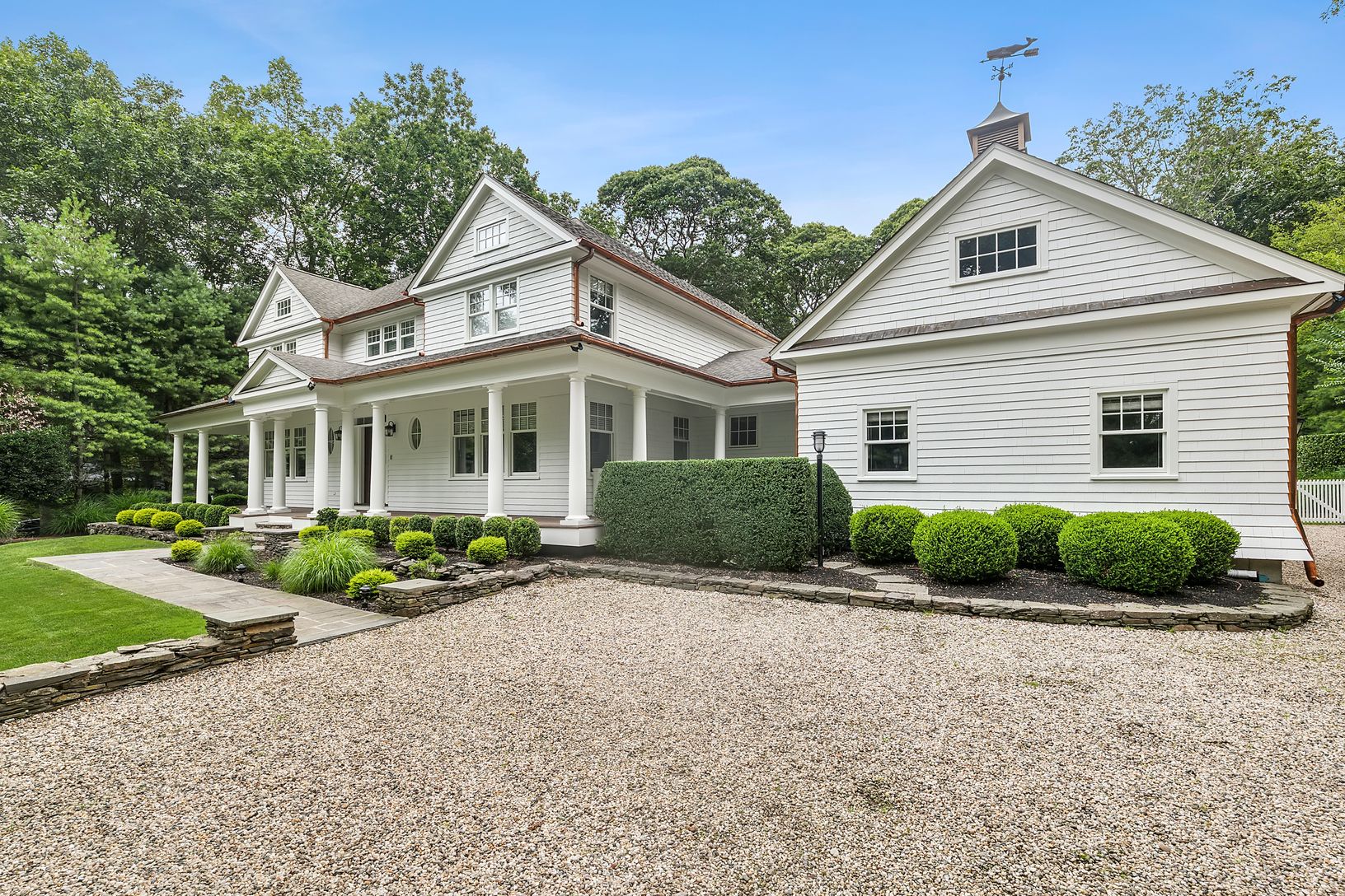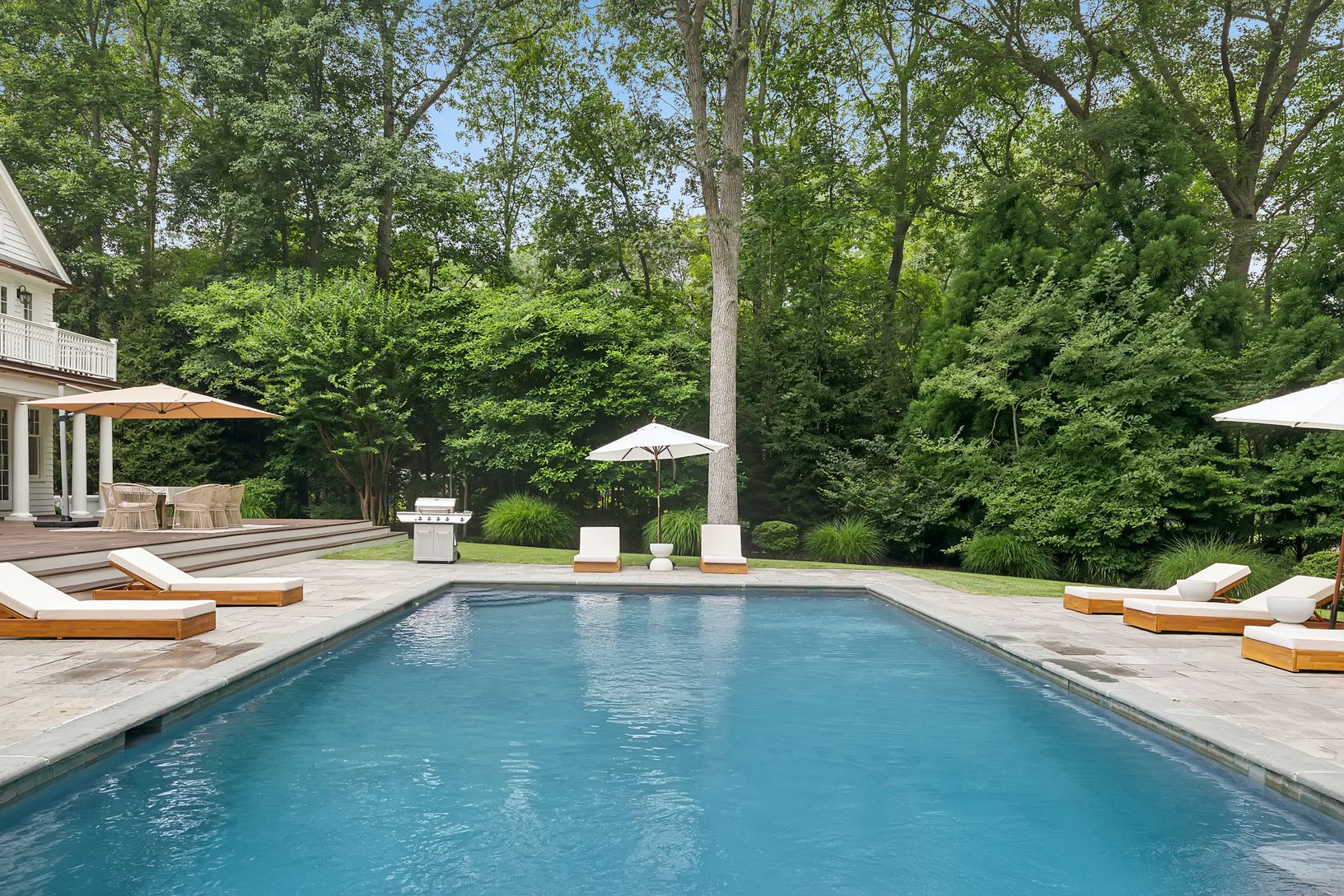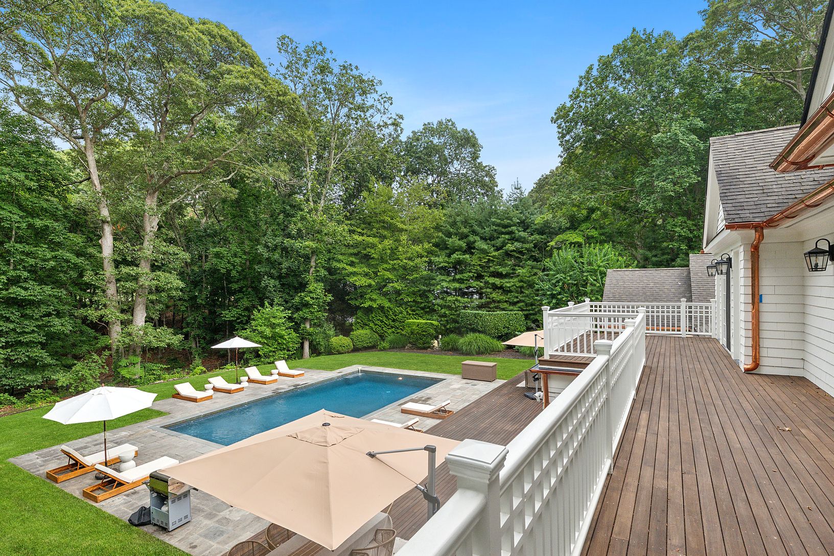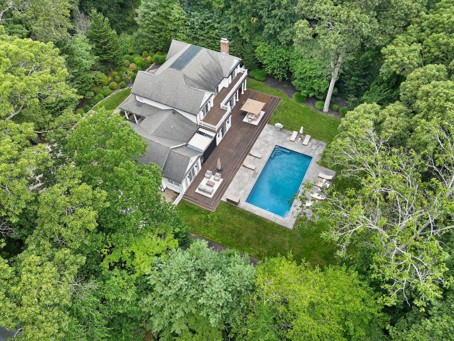 Classic 5,800 +/- sq. ft. Traditionally designed home on three+/- private acres with enlarged mahogany decks, both open and covered, additional stone pool-side patio, 20x 40 heated gunite pool, new decorative and privacy landscaping throughout. Kitchen has custom wood cabinetry, black granite counter tops, institutional grade appliances including 48" Sub-Zero refrigerator/freezer, 48" Viking six-burner range/oven with grill, central vacuum sy