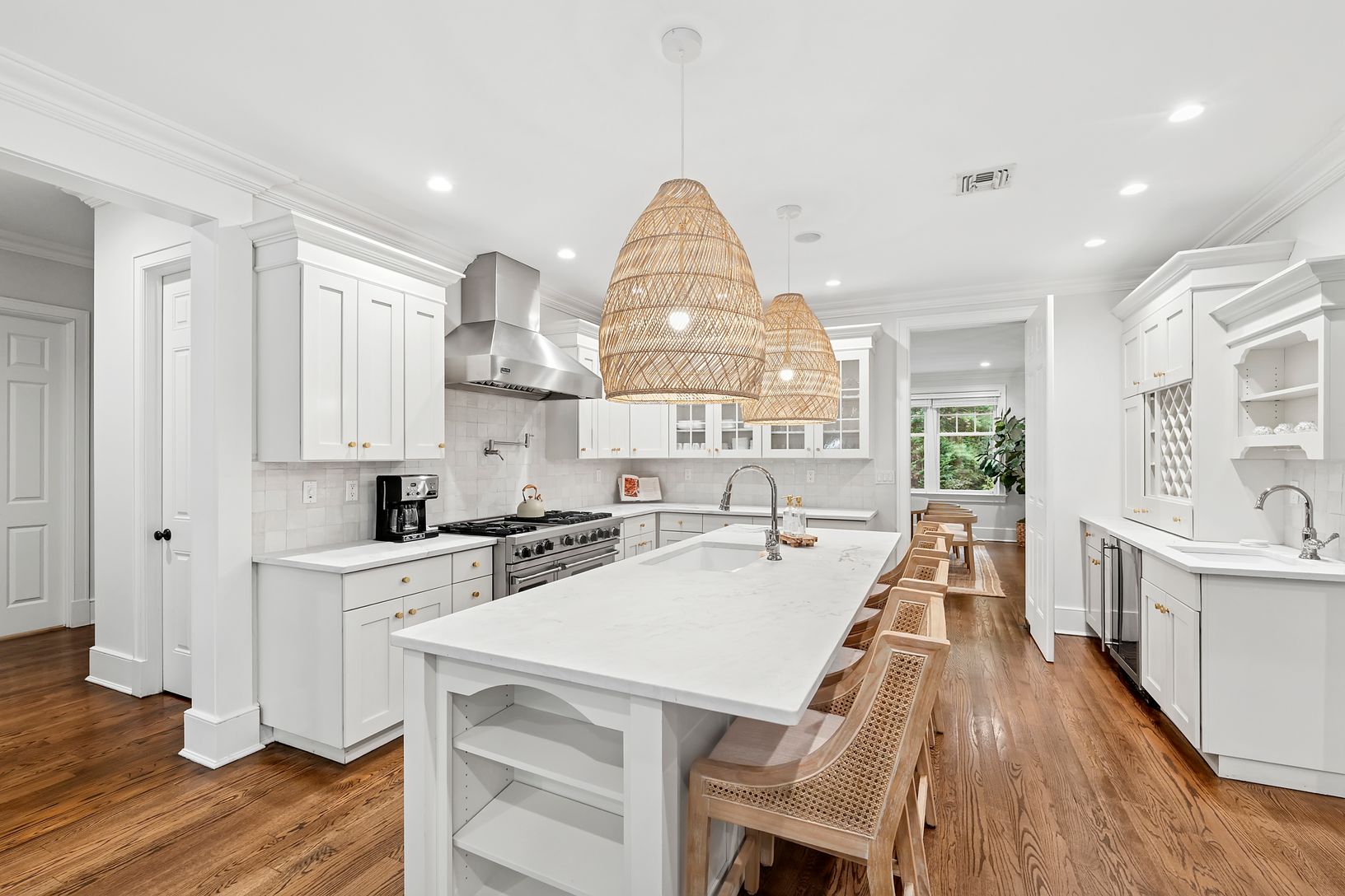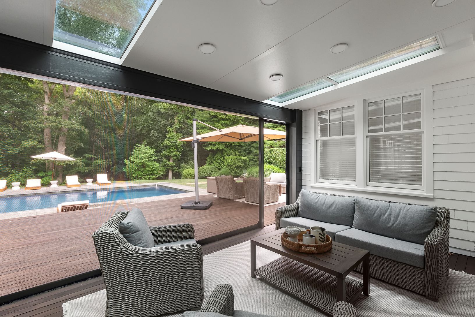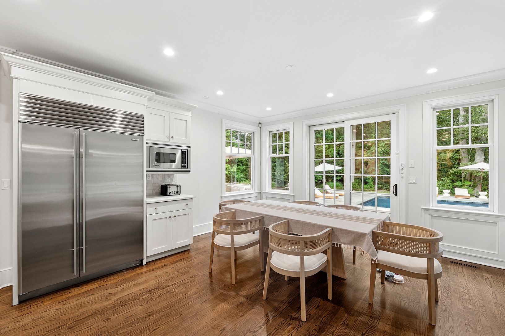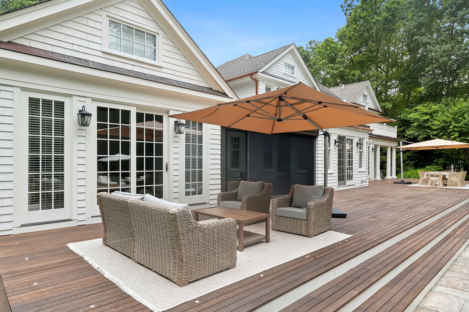 Classic 5,800 +/- sq. ft. Traditionally designed home on three+/- private acres with enlarged mahogany decks, both open and covered, additional stone pool-side patio, 20x 40 heated gunite pool, new decorative and privacy landscaping throughout. Kitchen has custom wood cabinetry, black granite counter tops, institutional grade appliances including 48" Sub-Zero refrigerator/freezer, 48" Viking six-burner range/oven with grill, central vacuum sy