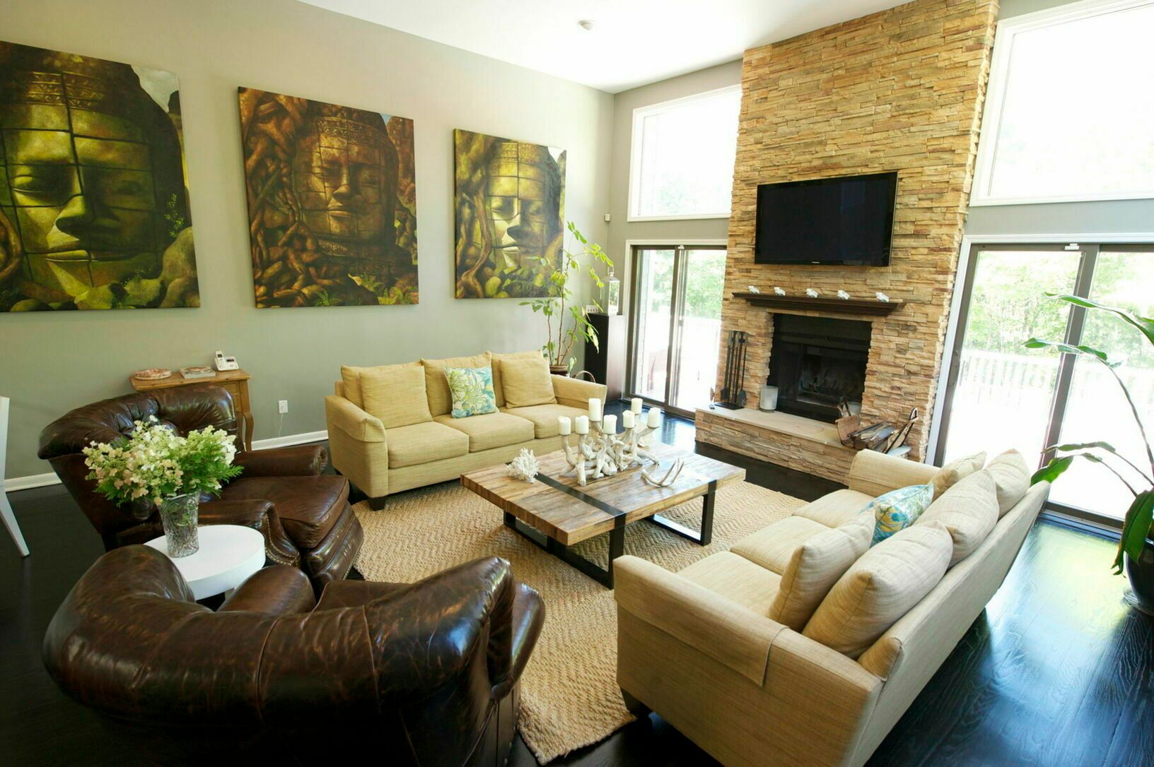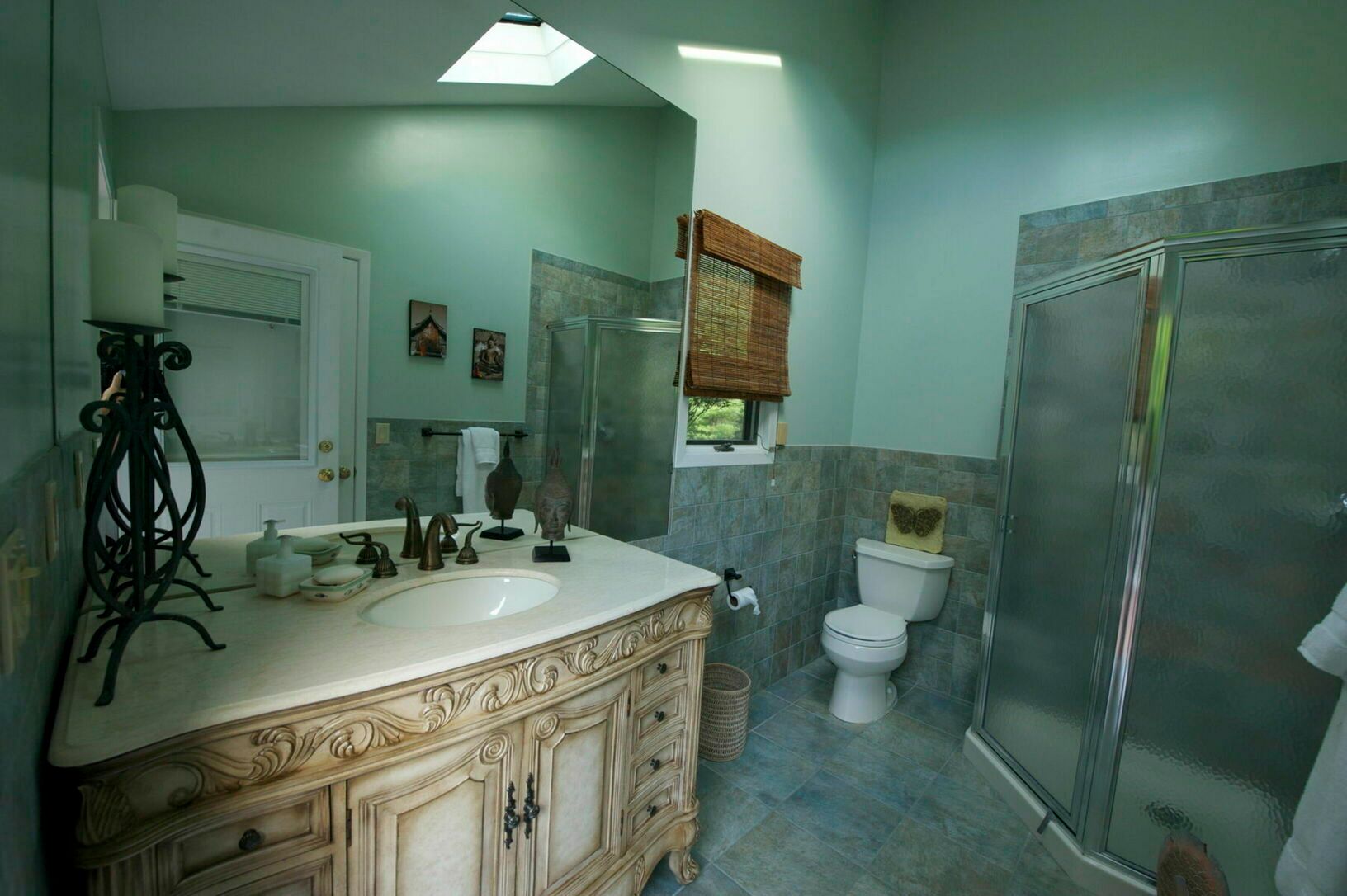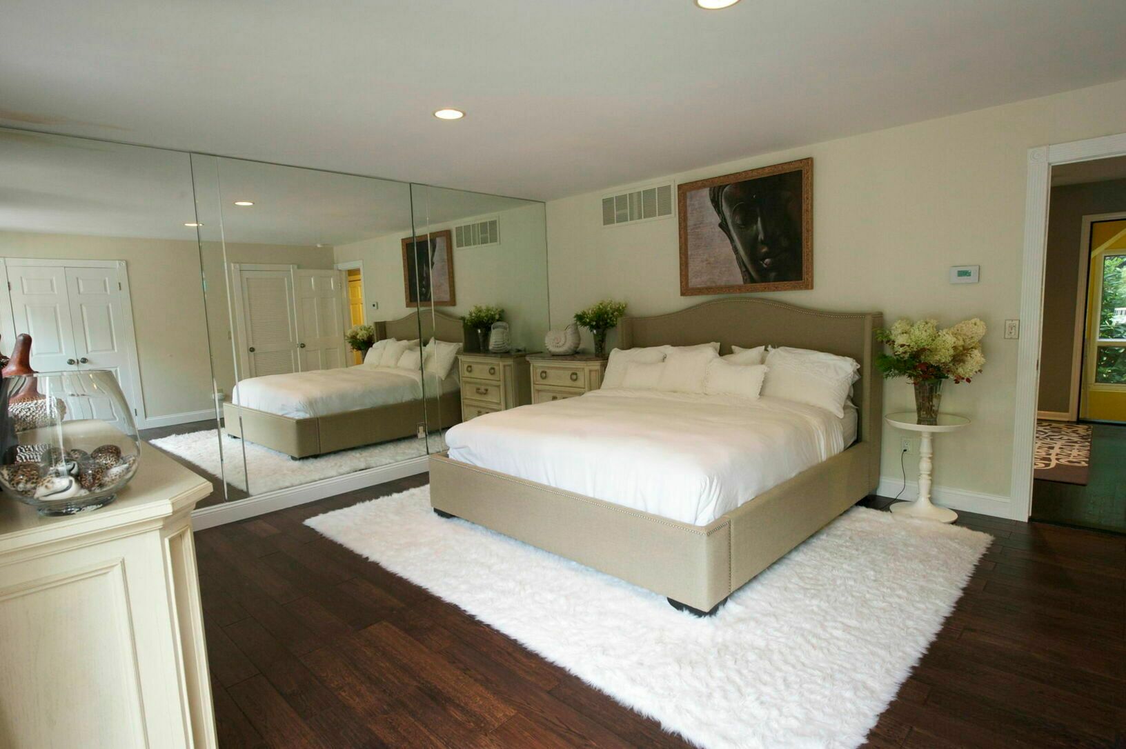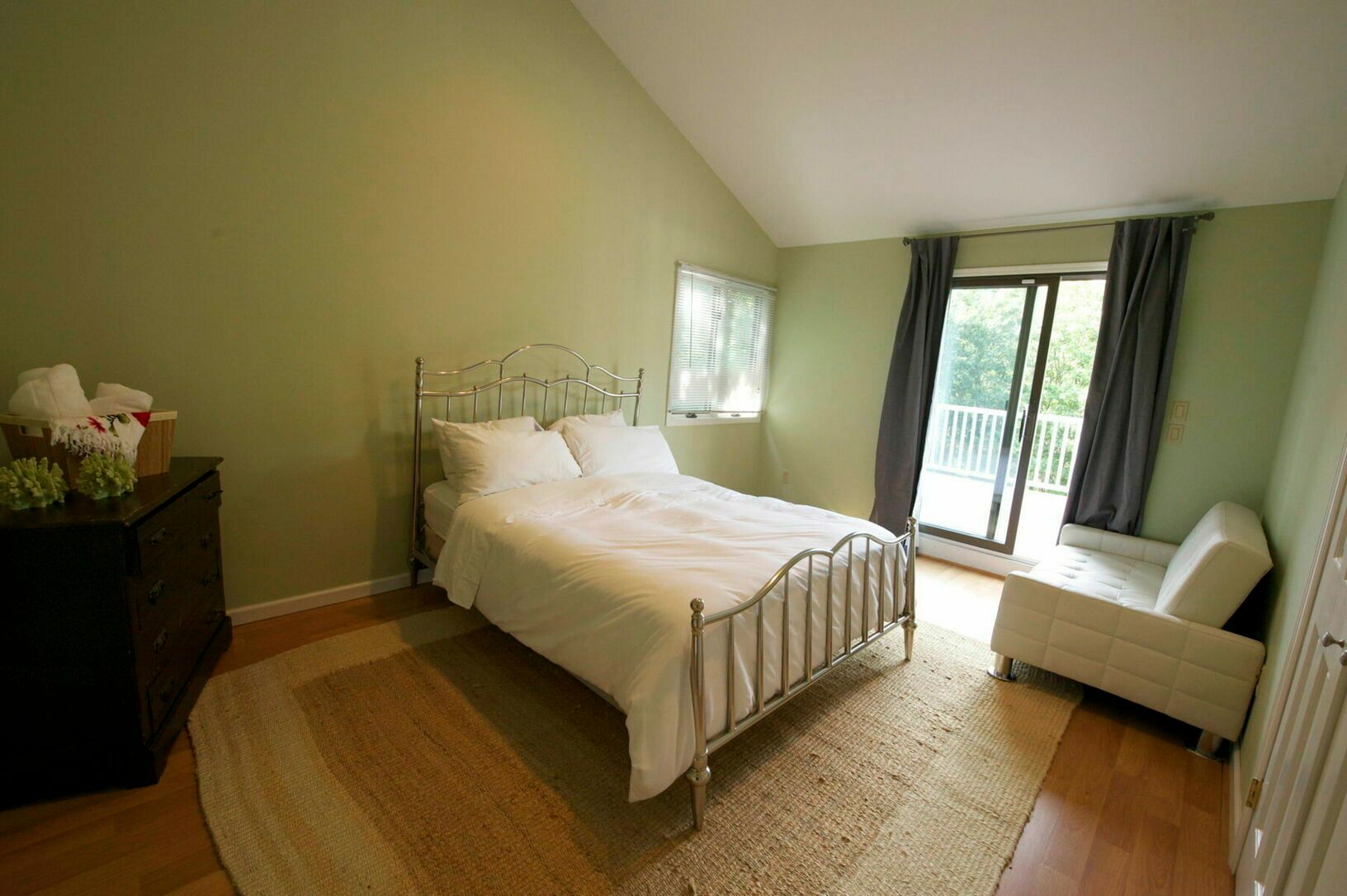 Contemporary eight-bedroom, five-bath house has huge double-height living room with formal dining room, chef's kitchen with granite counters, top-of-the-line stainless appliances including wine cooler. The decor has dramatic Eastern artifacts and handsome furnishings. There is a first floor master suite with marble bathroom. There is also an additional bedroom downstairs and three bedrooms upstairs with marble baths. The ground level is off t
