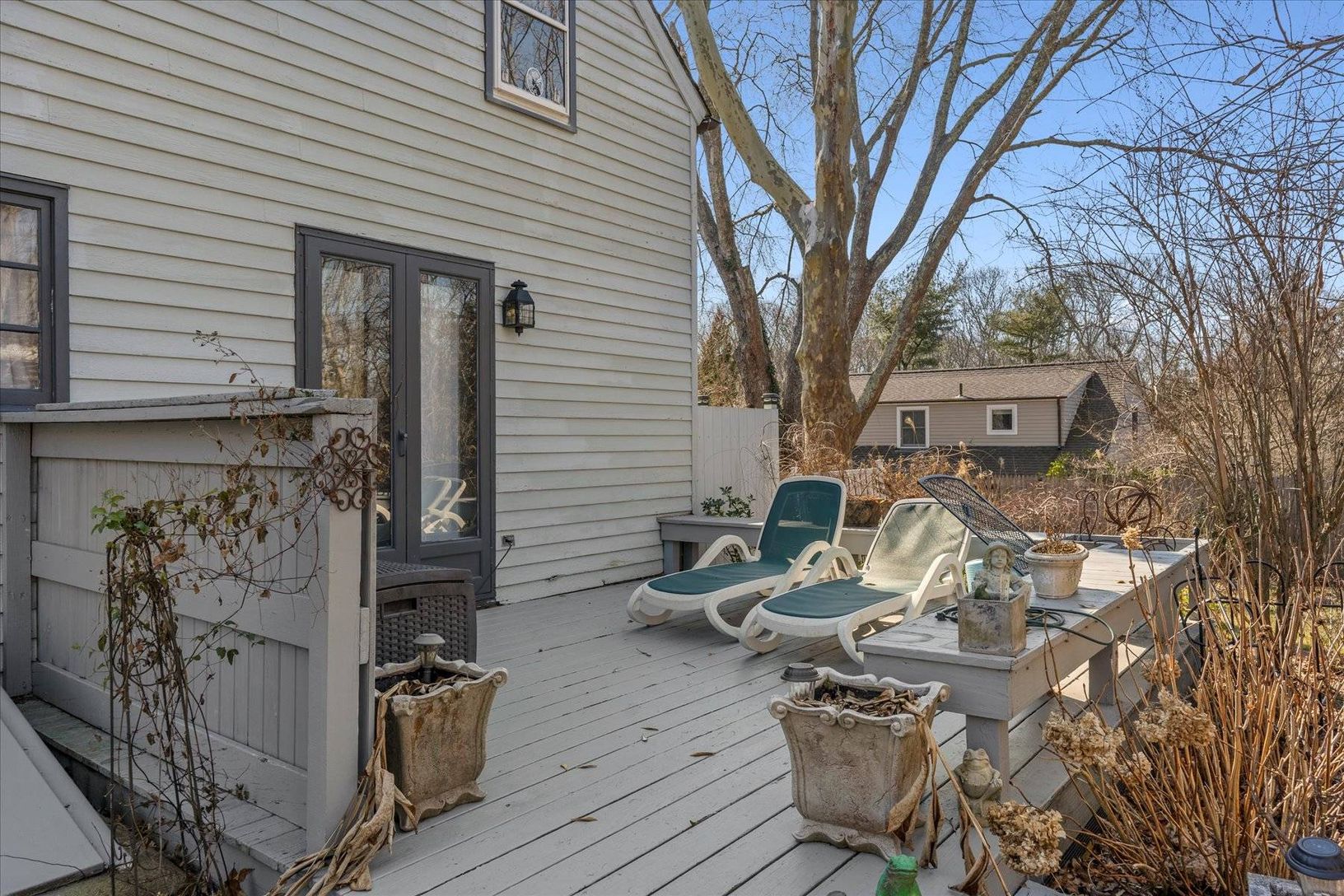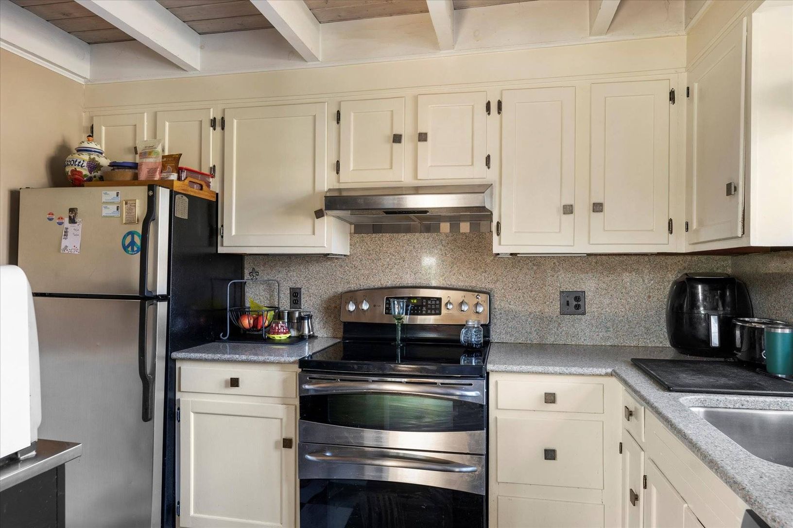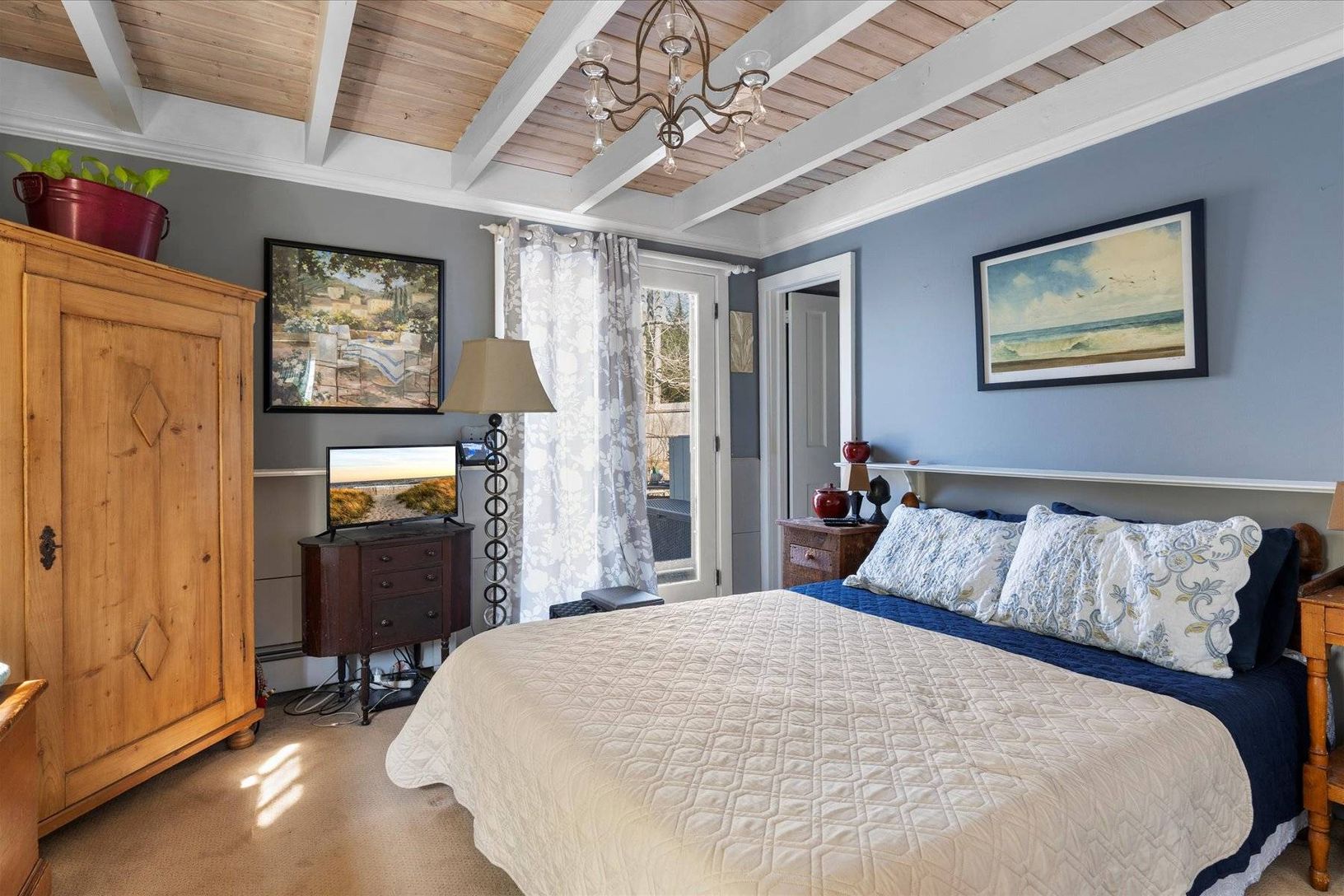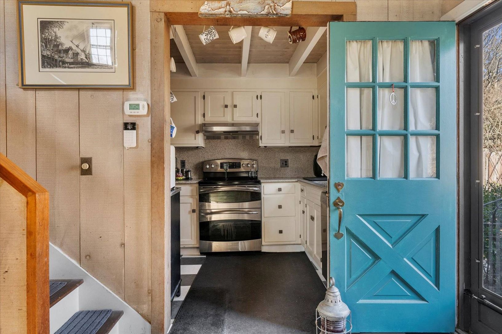 Located 1 mile from Business District this adorable 912sf home has 2 bedrooms and 2 renovated bathrooms, Living dining room has a cathedral ceiling old wood floors and a brick fireplace which goes to the ceiling. Small but fully equipped kitchen, Main bedroom and bath complete the main floor. Open staircase overlooking the living-dining room takes you to the guest bedroom & bath. Full basement with bilco doors. Mature landscaping with irri