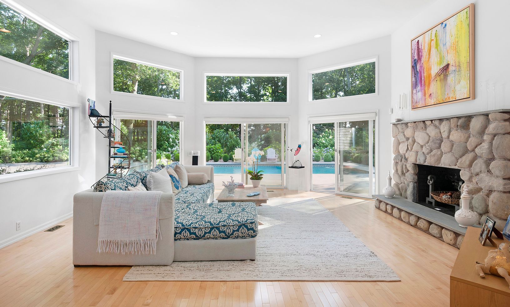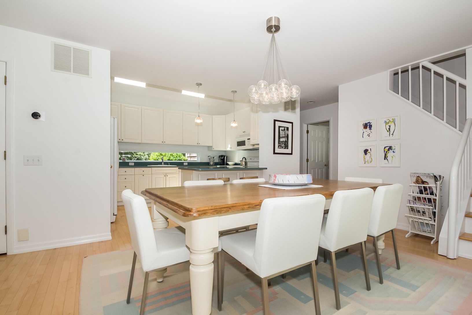 This beautiful post modern house is very close to East Hampton village (approx 2 miles), and to Sag Harbor village too. It is also close to the ocean (Main Beach is approx. 3 miles), local golf courses, tennis clubs, and easy access to the bay and marinas for boating enthusiasts. The four bedroom, three bath home has a large open plan living room, kitchen and dining. The living room has a vaulted ceiling and fireplace overlooking the landscape