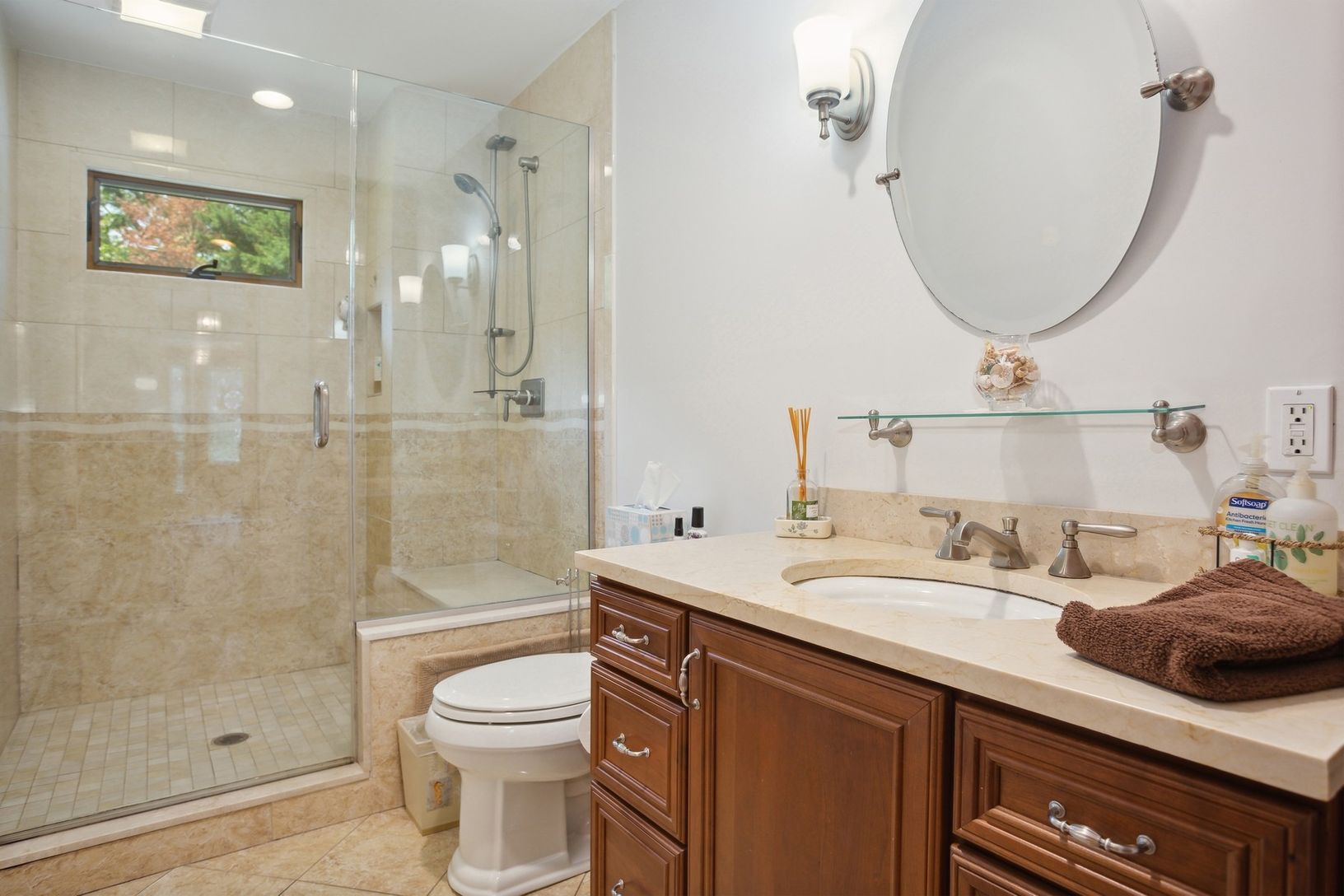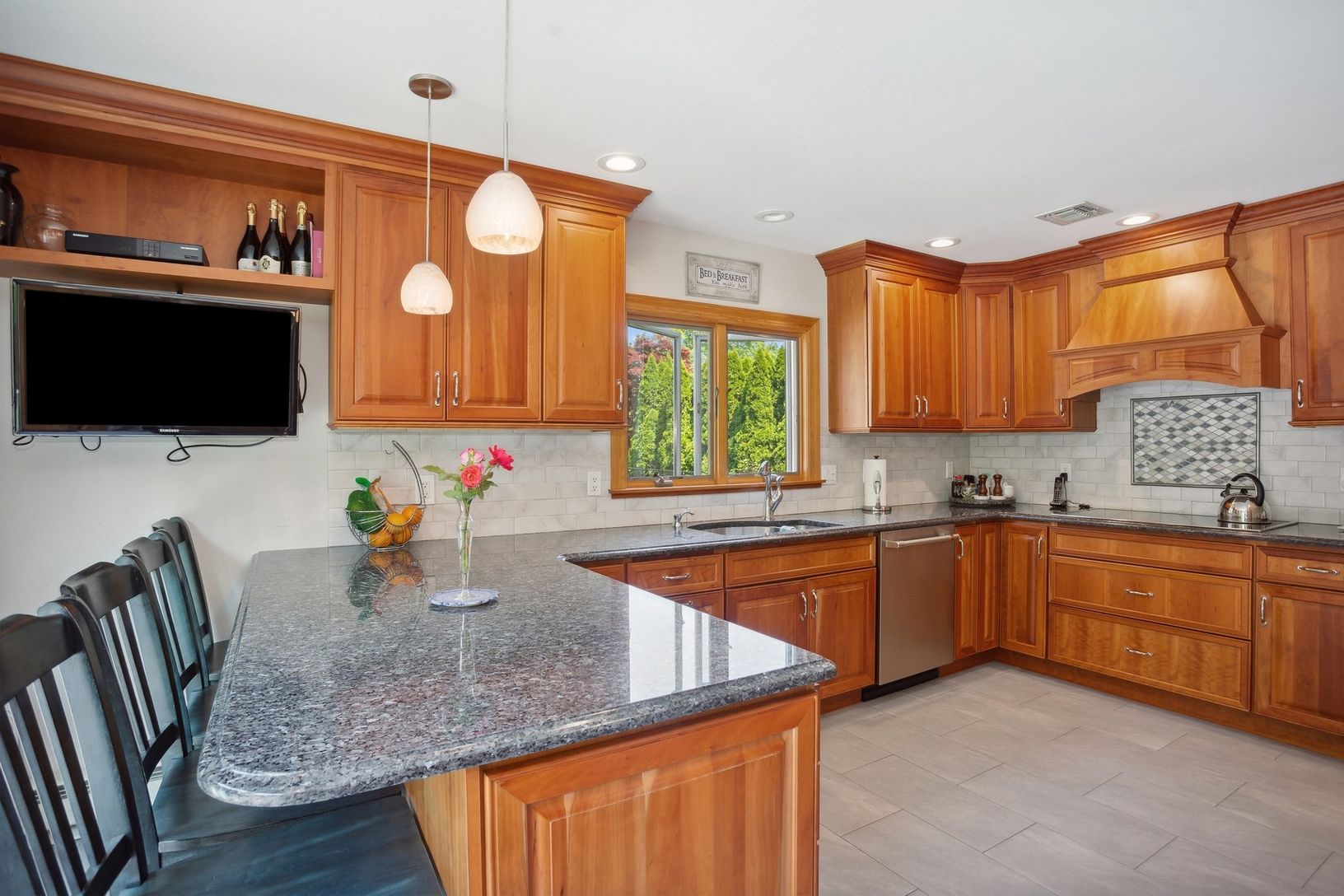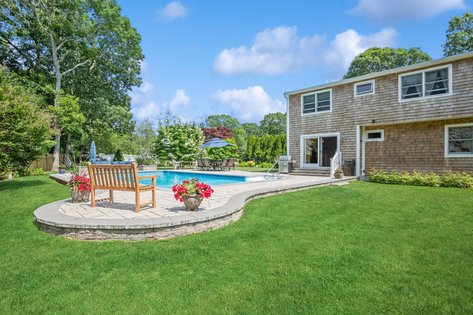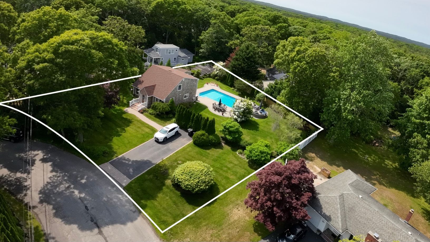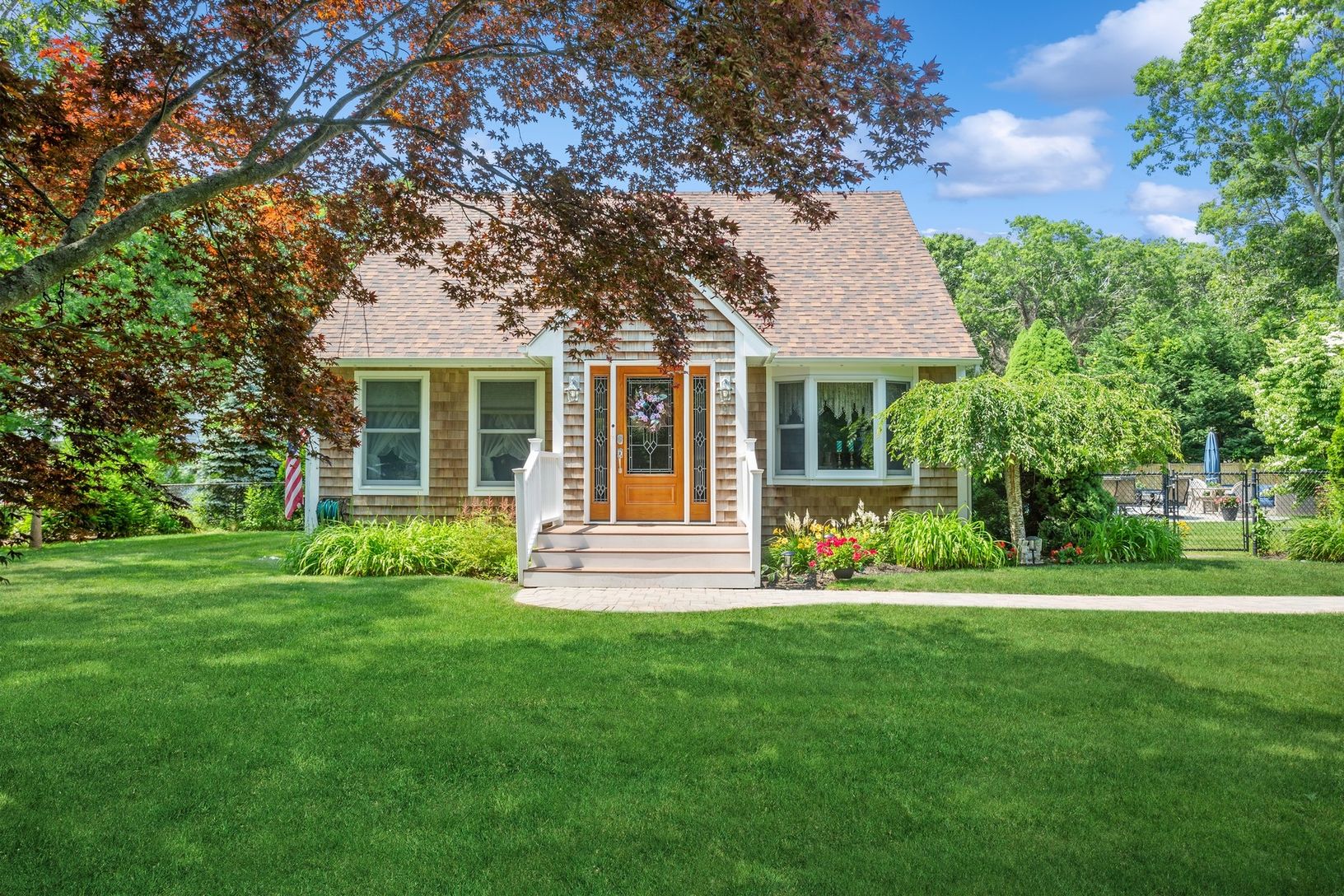 Beautiful Cape Cod styled cedar-shake home with double-sized living room, formal dining room, entry foyer and downstairs full bath. Spacious eat-in kitchen has custom cherry cabinets, expansive granite counters, maximum storage with roll-outs, stainless steel appliances including double oven. Upstairs the Primary Bedroom has two separate closets, 3 additional bedrooms and hall bathroom. Property is .39 acre with fenced-in back yard, shed, larg