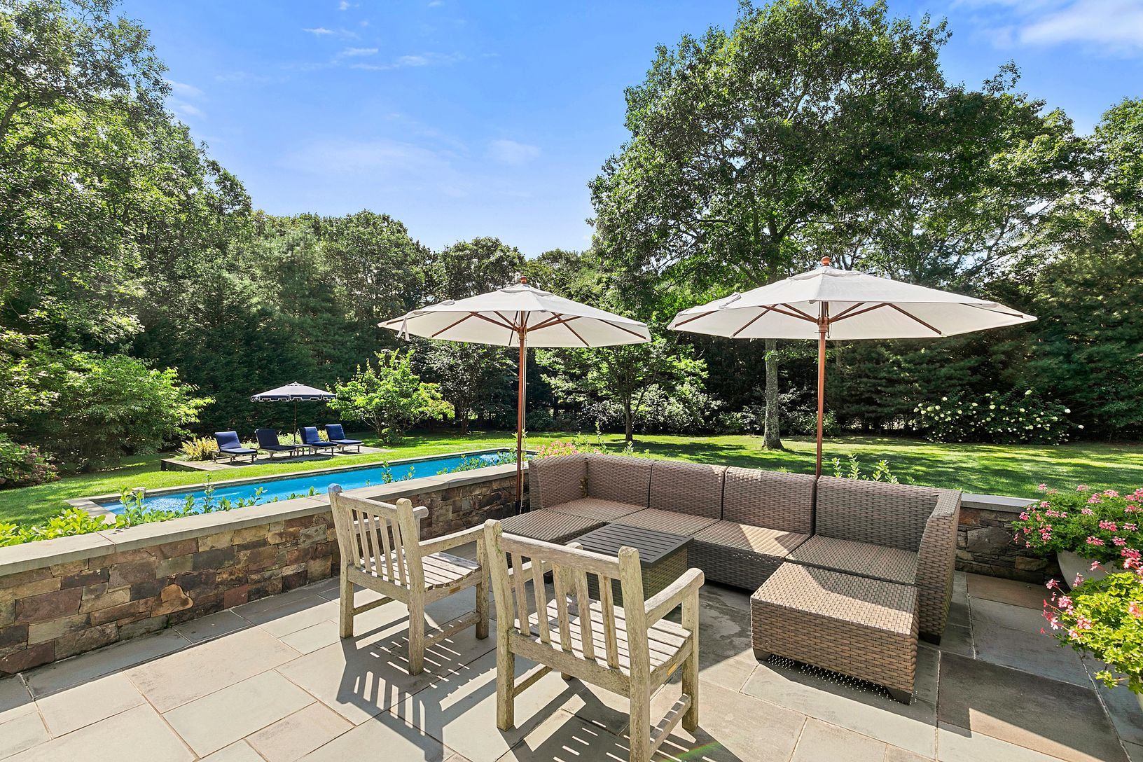 Located at 9 Oakwood Ct. in Wainscott South on 1.3 manicured acres, this beautiful property offers a dramatic and spacious backyard with heated pool, in-ground trampoline and multiple entertaining areas- a blue stone patio off the kitchen, an outdoor dining area and a shaded sitting area by the pool. The home which features five bedroom and four and a half baths- includes a first-floor master bedroom that opens out to the patio, as well two ad