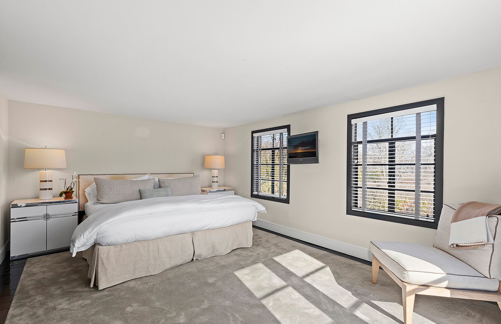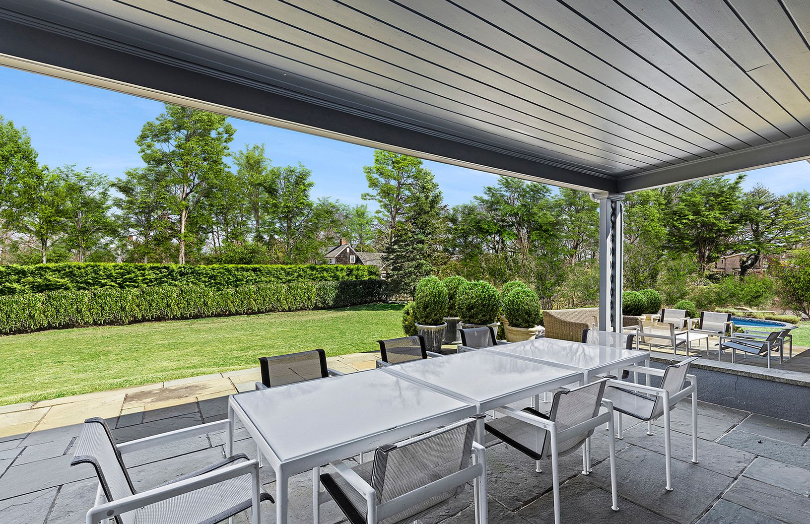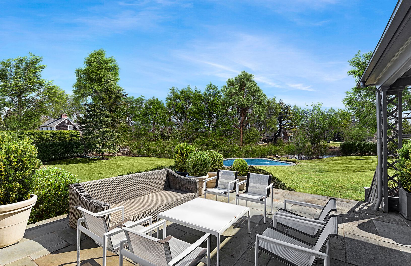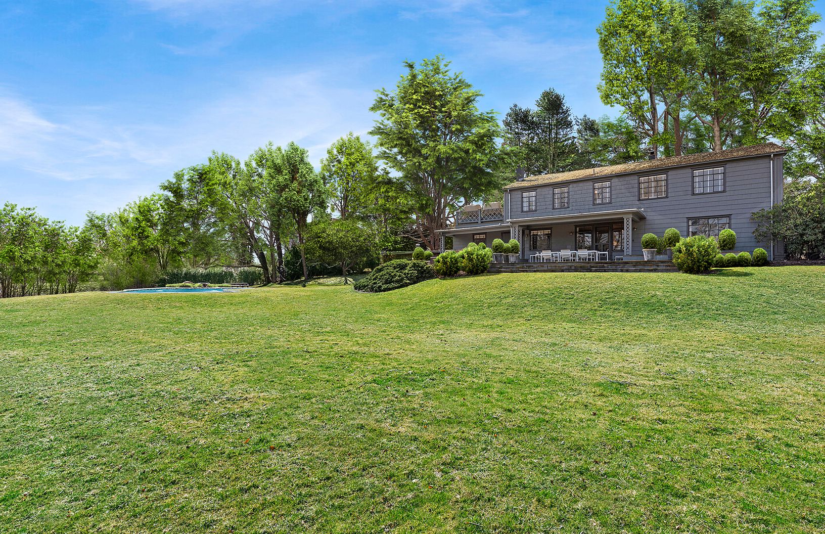 Hidden behind tall hedges and trees, this warm and inviting one-plus acre south of the highway house opens to a covered patio overlooking the lush landscaping and rolling lawns. This private and tranquil setting offers 5 bedrooms and 4.5 baths. A small bedroom, bath and powder room are on the first floor. The second floor has a primary bedroom ensuite with a private study & terrace. There is also a guest bedroom ensuite with a sitting are