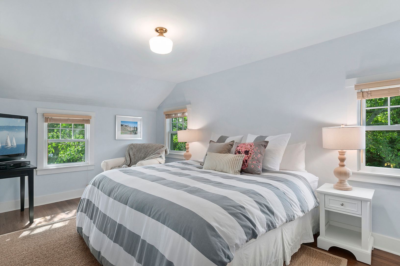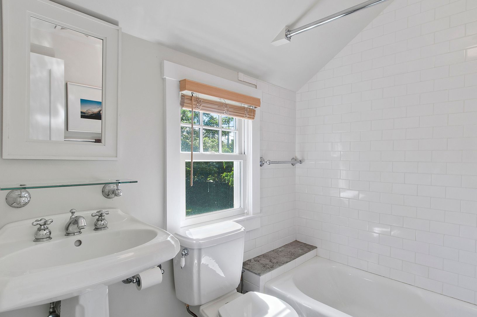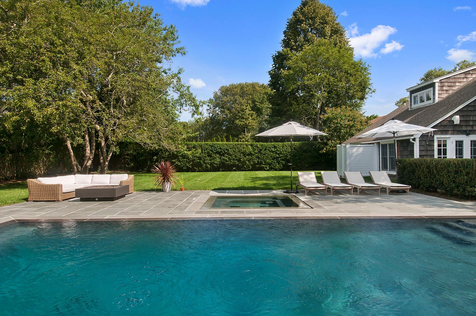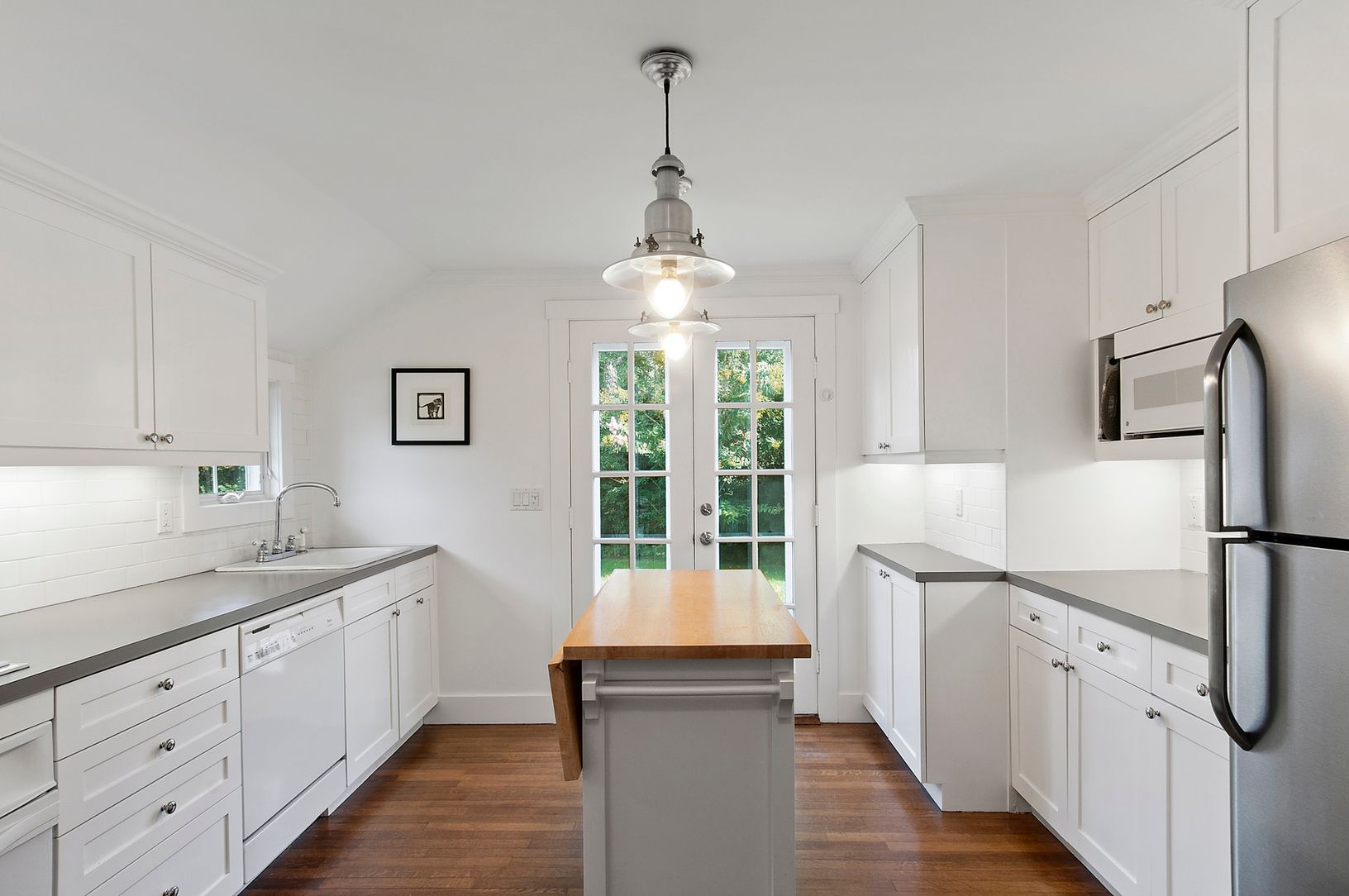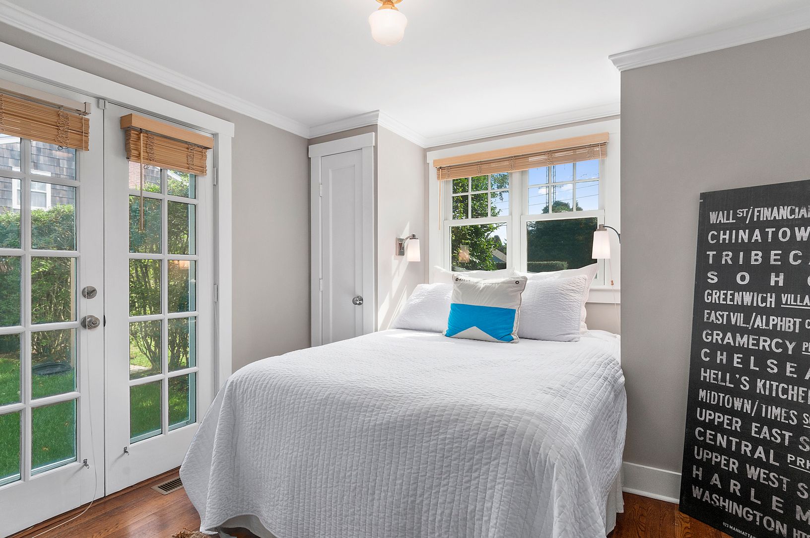 This chic traditional home is ideally situated just steps to everything that East Hampton Village has to offer. Spread out over 1,800 sq. ft. this open layout features a main floor centered around the living room with wood-burning fireplace. An open dining room with views of the property beyond is perfect for summer dinner parties or a cozy night for two and sits adjacent to the spacious kitchen. A guest bedroom with french doors out to the