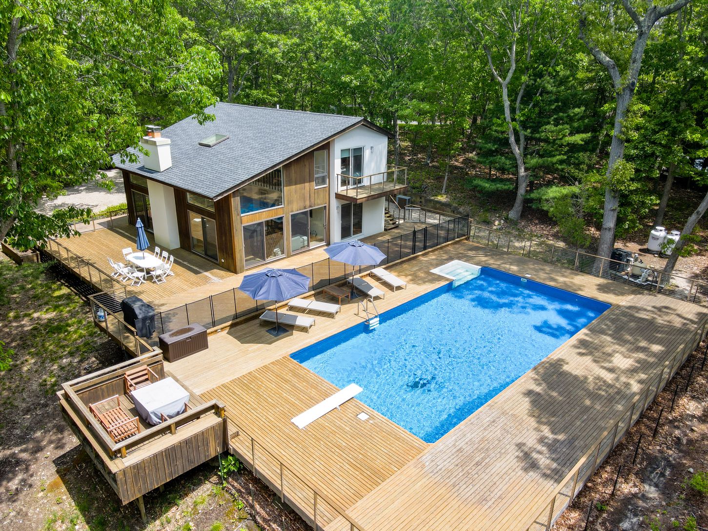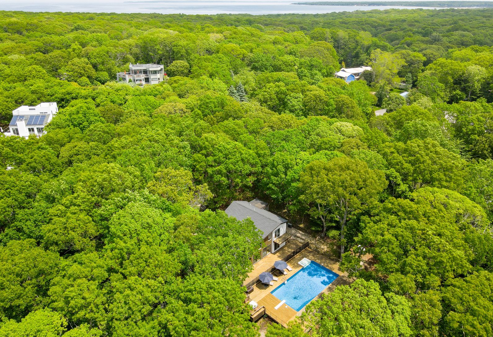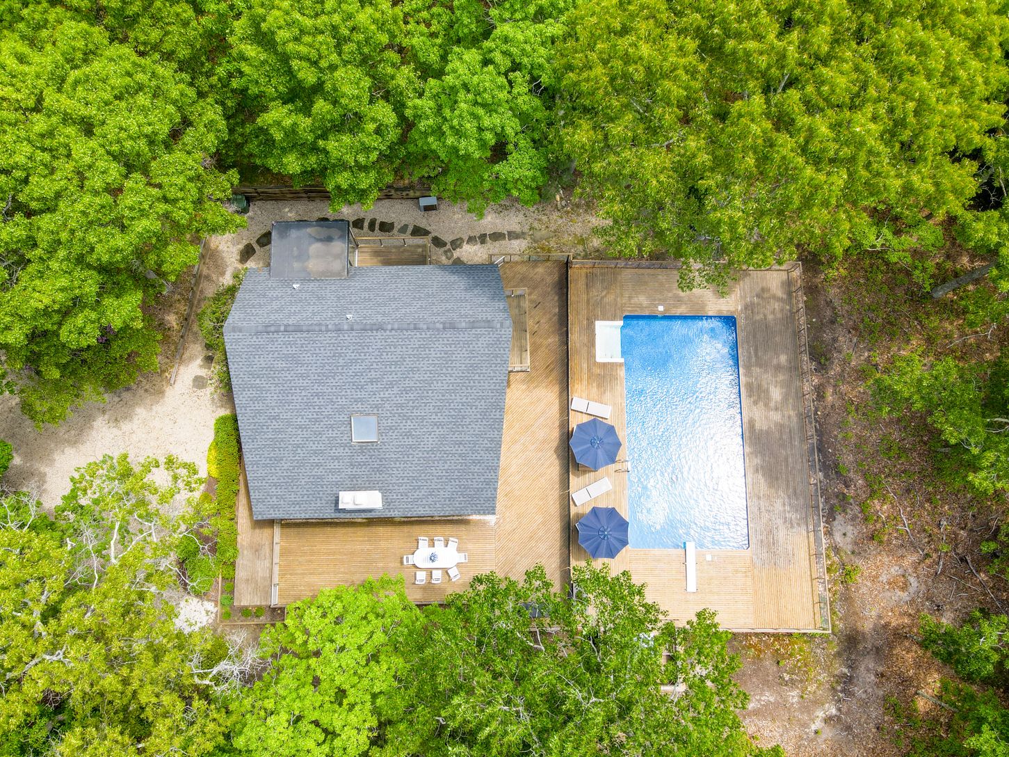 Elegant modern saltbox 3 bedroom retreat situated on quiet cul de sac, with large wraparound deck and huge 20x40 heated pool. Within close distance (0.7 miles) to private beach.