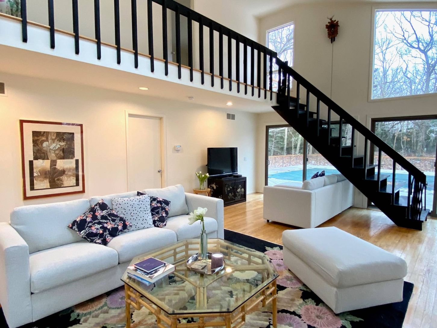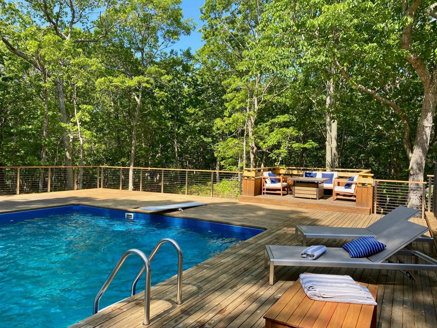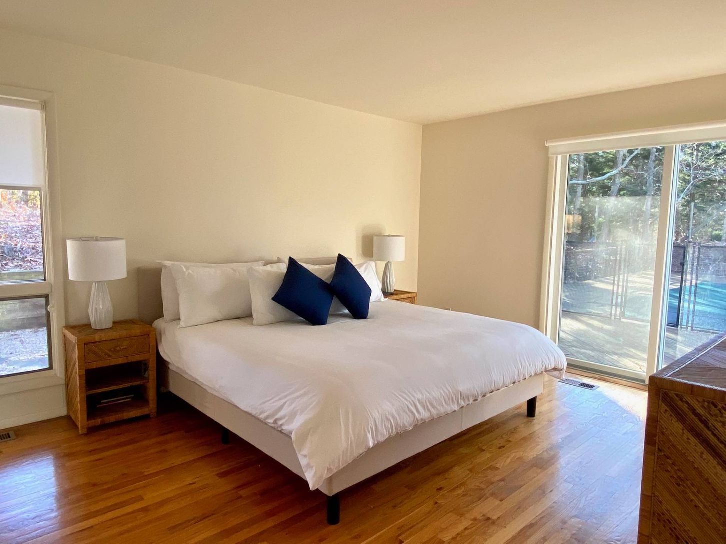 Modern saltbox retreat tucked away on a quiet cul-de-sac, featuring a spacious wraparound deck and a stunning 20' x 40' heated pool. Located just 0.7 miles from a private beach, this home offers the perfect blend of privacy and convenience. The house features three generously sized bedrooms, all with new mattresses, large closets, and dressers. Two bedrooms are located on the second floor and one on the first. The primary suite includes a king