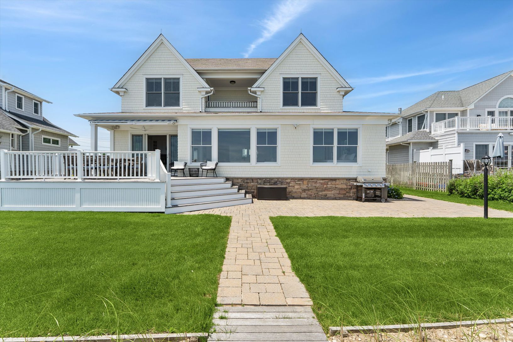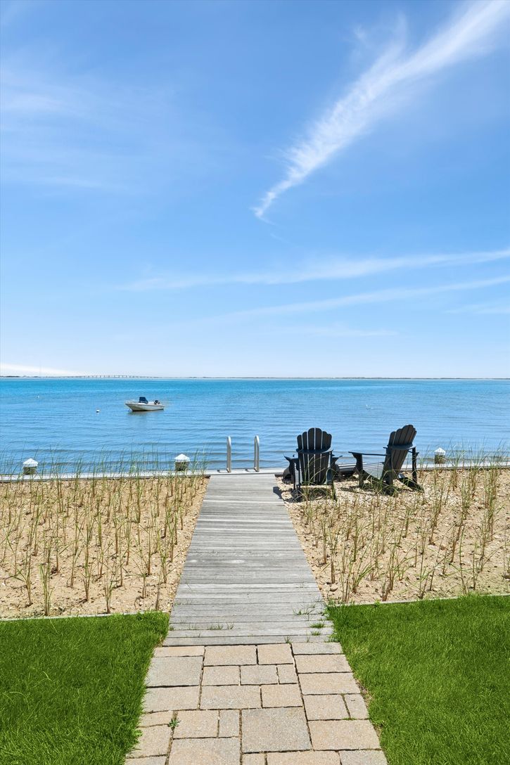 Experience the perfect blend of comfort, luxury, and waterfront living at 9 Shinnecock Road in East Quogue. Ideally located south of the highway in the desirable Shinnecock Shores community, this custom-built 2010 home offers breathtaking views of Shinnecock Bay & Ponquogue Bridge with exclusive beach rights, all just 82 miles from Manhattan. Spanning 3,569 square feet on a manicured 0.26-acre lot, the cedar-shingled residence features 4+