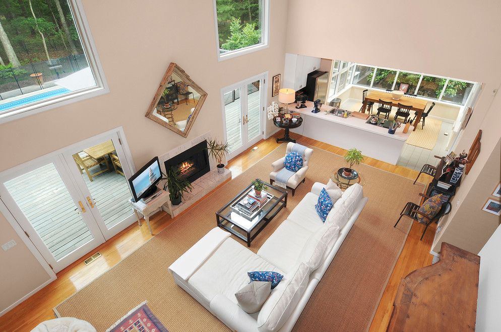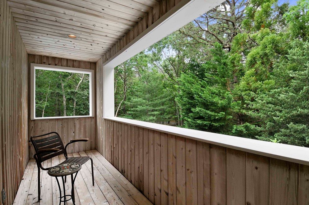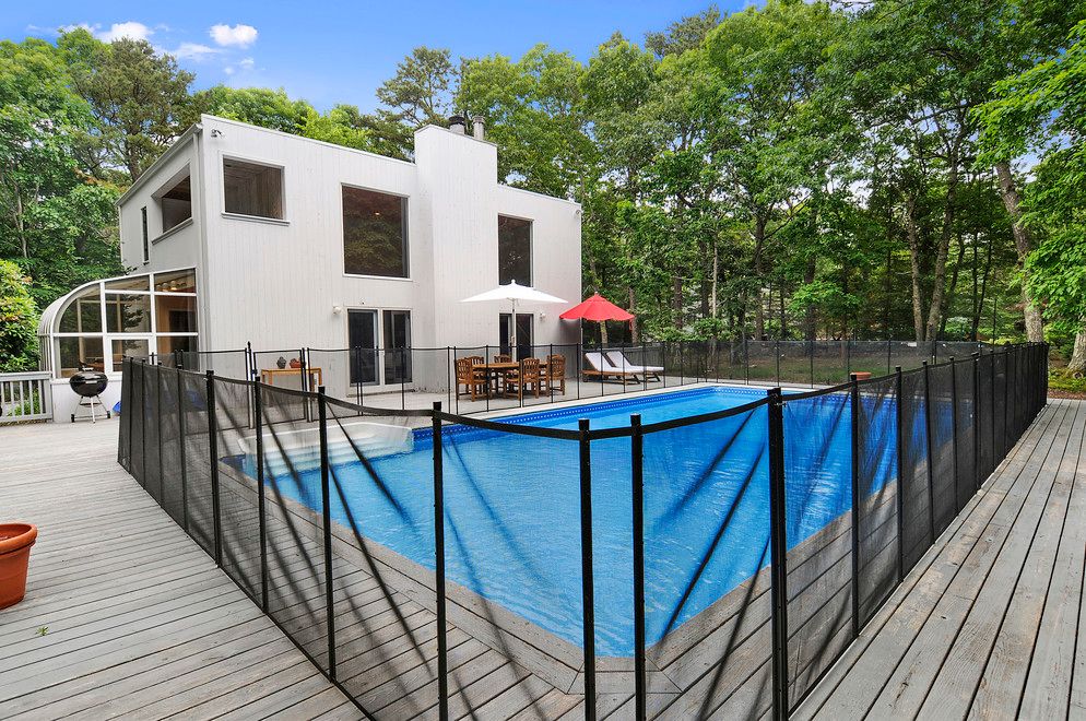 Stylish contemporary, in the Northwest close to East Hampton Village with pool, an enclosed outdoor shower, a spacious deck exemplary for relaxing and entertaining. Atrium dining in an open Cook's kitchen with walk-in pantry. Two story ceiling height living room with wood burning fireplace, large expanses of windows overlooking the pool and deck. On the first floor are also two guest bedrooms with full guest bath. The entire second floor is t